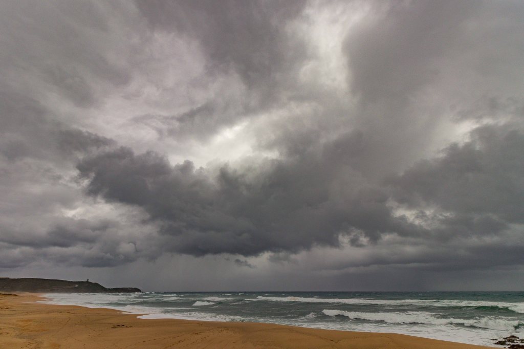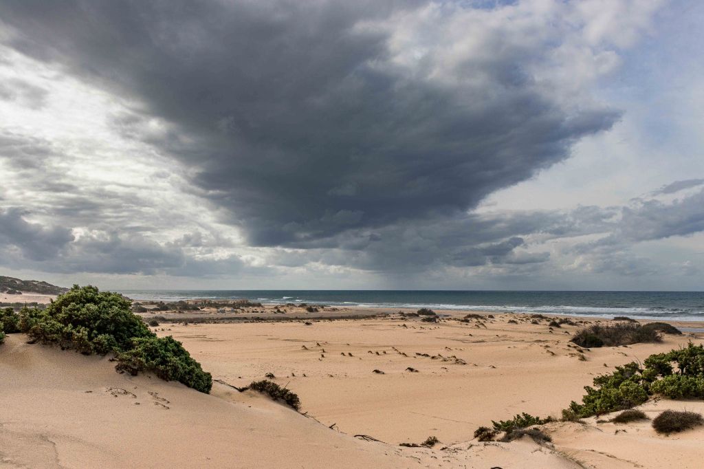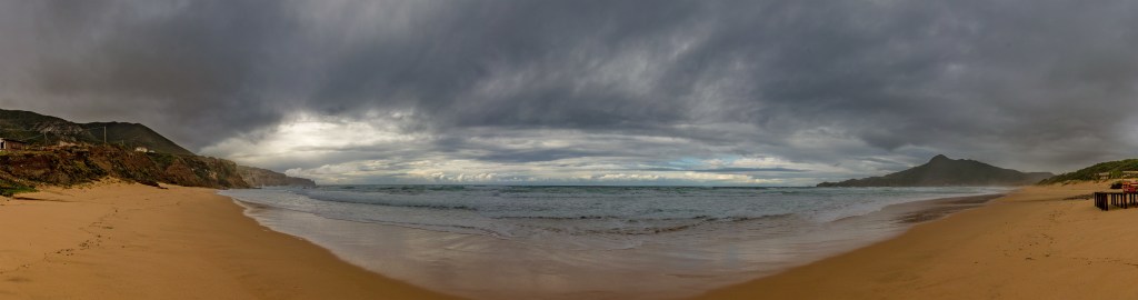 Nach einem sonnigen Tag, der Wetterbericht behielt recht, verlassen wir die Wüstenlandschaft bei strömenden Regen. Auf der Piste stehen wider riesige Wasserlachen, die unser Dicker aber bravourös meistert. Doch den Rundgang durch die Ruinen des Bergwerks lassen wir lieber sein. Schon ein paar Kilometer weiter wartet ein weiterer Traumstrand auf uns: SAN NICOLÓ. Wir nehmen gleich die oberste Terrasse des Wohnmobilstellplatzes. Vor fünf Jahren waren wir mit Freunden schon mal hier und saßen im Oktober bis spät in die Nacht vor unseren Wohnmobilen. Das geht heute leider nicht. Meist regnet es, nur für ein paar kurze Augenblicke gelingt es der Sonne durch die schwarzen Wolken zu lugen.