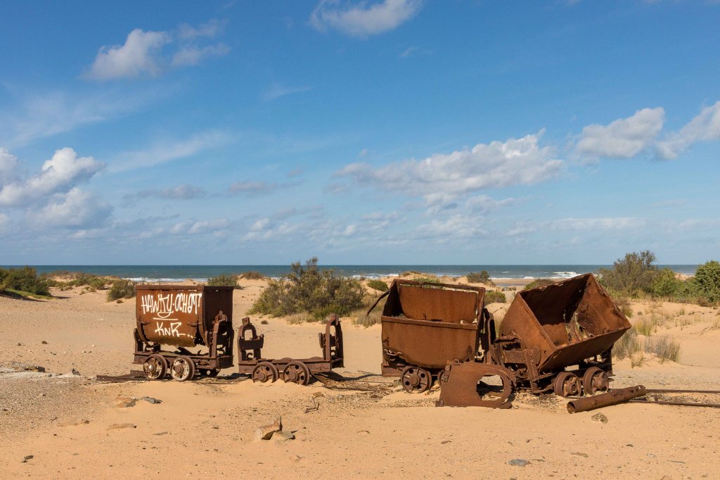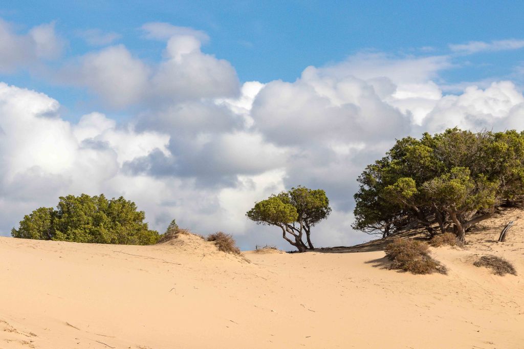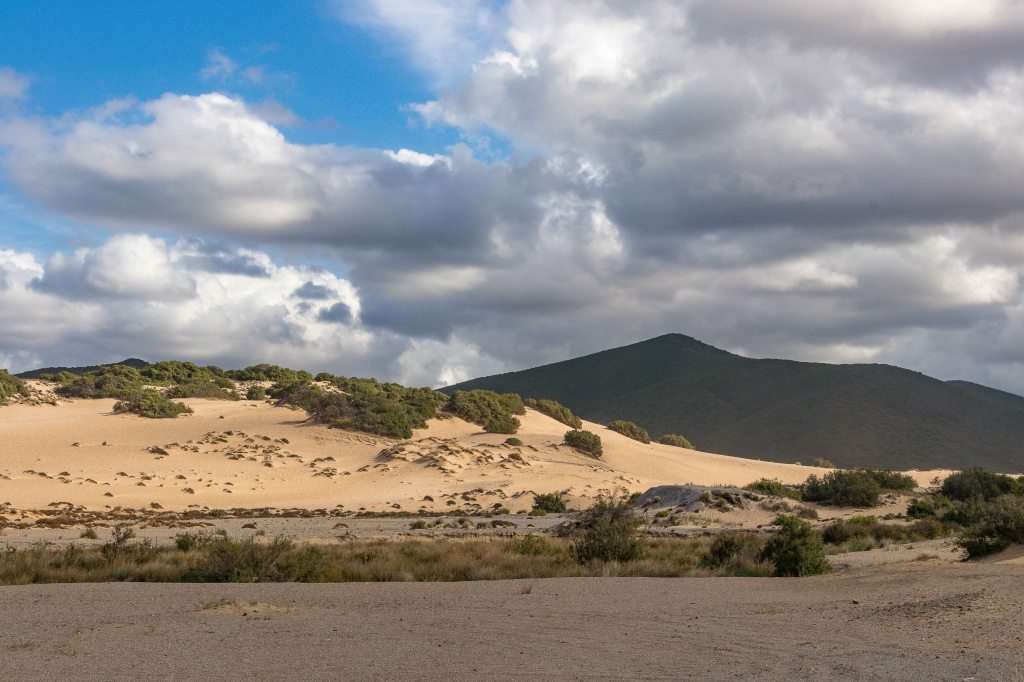 Peter dreht eine Runde durch die hohen Dünen. Ein paar verrostete Loren, in denen das Erz von den nahen Minen zur Verschiffungsmole transportiert wurde, stehen verloren in der Gegend. Immer wieder huschen Sonnenflecken über den feinen Sand. Die markante Gebirgskette des MONTE ARCUENTU überragt die grünen Hügel. Am Mittag zieht der Himmel zu, am Abend beginnt es wieder einmal zu regnen. Doch morgen soll uns wieder die Sonne scheinen. Warten wir es ab.