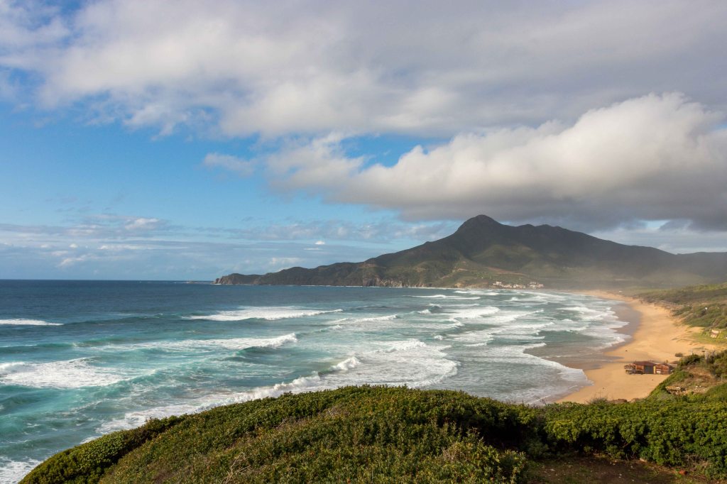 Für einen halben Tag soll die Sonne scheinen, Zeit genug für eine kleine Wanderung. Inmitten der sanften Hügel erstreckt sich ein lange, zerklüftete Kette erloschener Vulkane. Der höchste davon, der MONTE ARCUENTU, dominiert mit seinem 784 m hohen markanten Gipfel die Landschaft. Der Weg hinauf ist steil, klitschig und mühsam. Einigen gläubigen Einheimischen schien diese Route deshalb gut geeignet, den Leidensweg Christi mittels einiger Blechtafeln darzustellen. Doch die Mühe lohnt sich. Vom Gipfel mit dem schiefen Kreuz bietet sich eine grandiose Rundumsicht. Über die lange Bergkette schiebt sich immer noch ein dichtes Wolkenband, das sich jedoch über der Ebene mehr und mehr auflöst. Im Süden leuchten die riesigen Wanderdünen von PISCINAS, einer unserer nächsten Ziele.