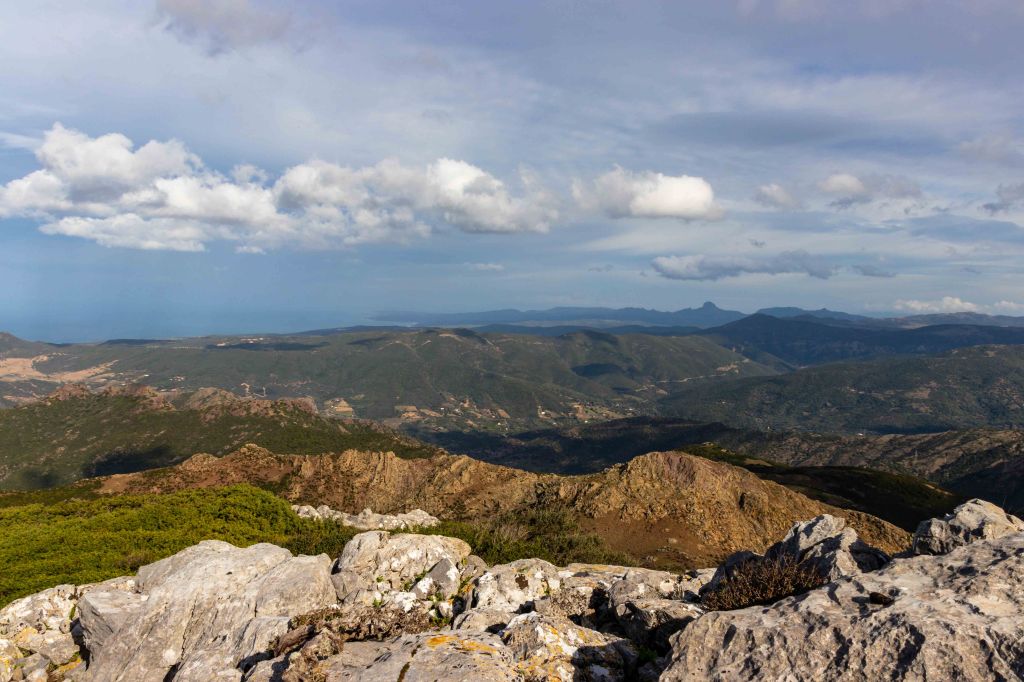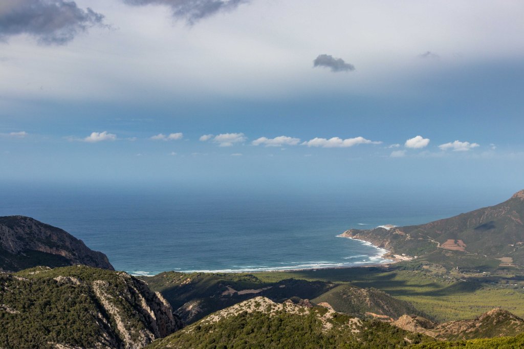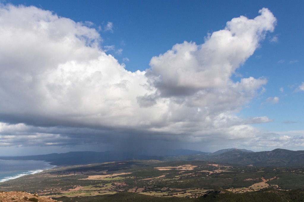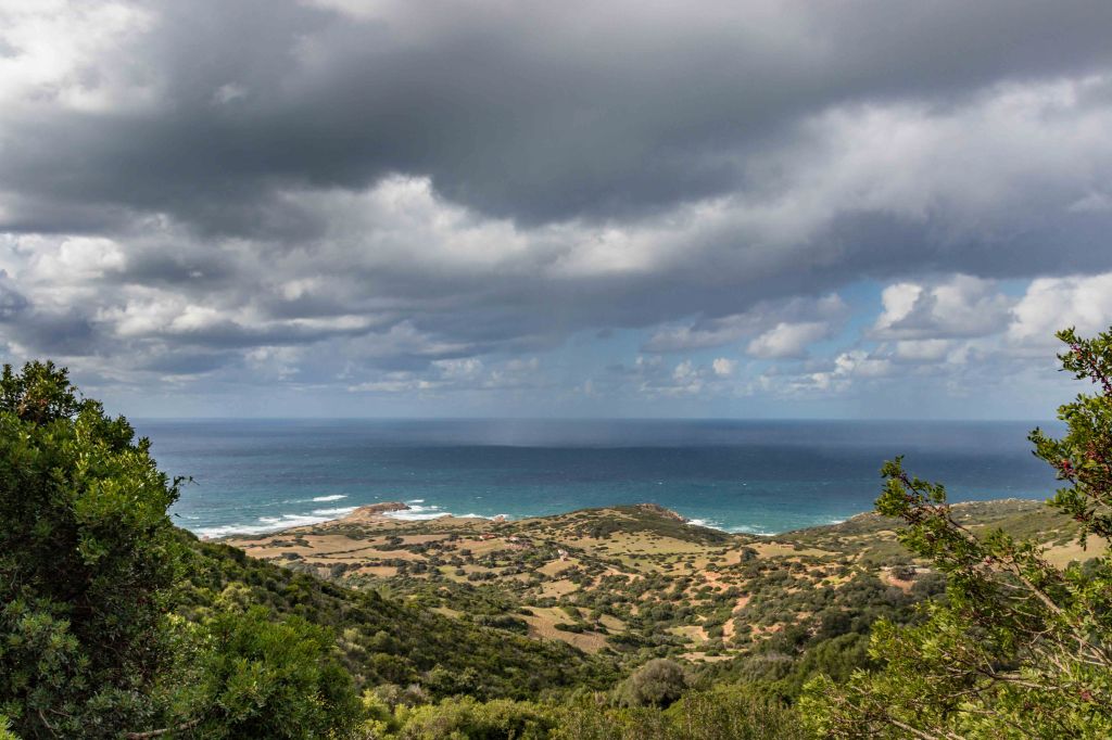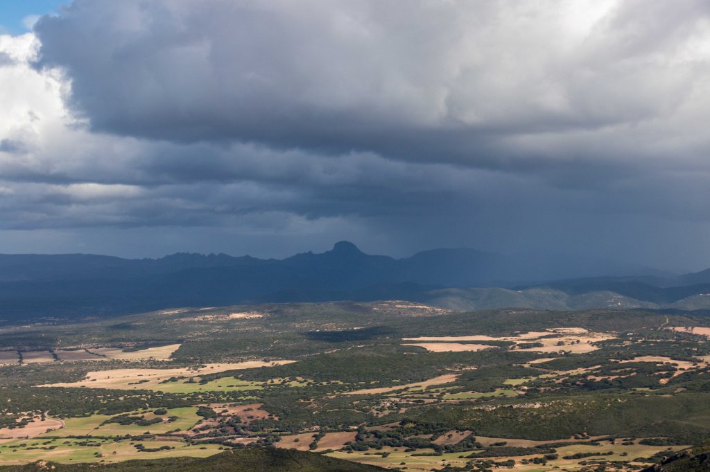 Steil und schweißtreibend führt die Piste durch die intensiv riechende Macchia. Die Erbeerbaumerdbeeren sind nun reif und schmecken gut, viele Korkeichen säumen den Weg. Nach gut zwei Stunden erreiche ich den flachen Gipfel der 499 m hohen PUNTA MUMOLLONIS. Mit einem Vesper und kühlen Ichnusa (einer sardische Hopfenkaltschale) lässt sich die Aussicht gleich noch besser genießen. Der Blick geht über die runden Hügel der COSTA VERDE, mit dem markanten Gipfel des MONTE ARCUENTU bis zum CAPO PECORA. Jetzt ziehen wieder Regenschauer von Westen über das Meer, einer von ihnen verschont auch mich nicht. Doch im Schutz einer Korkeiche lässt sich der kurze Regen gut aushalten.