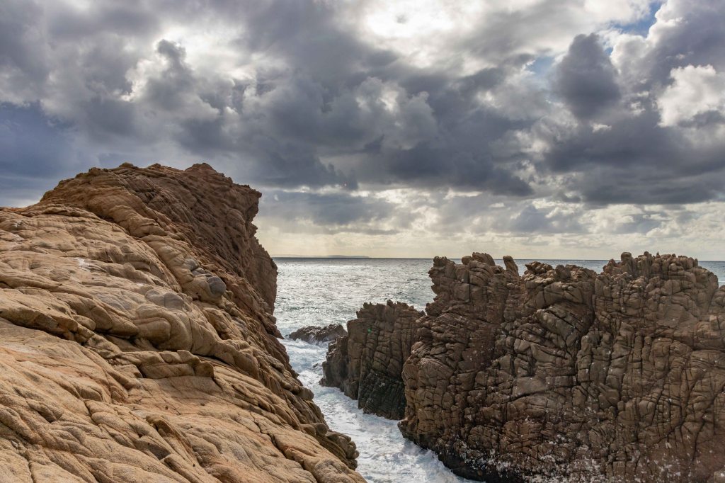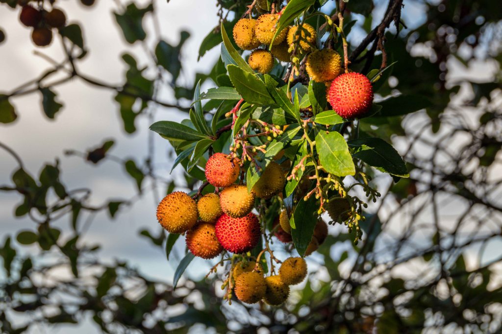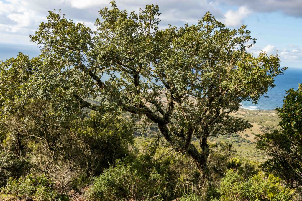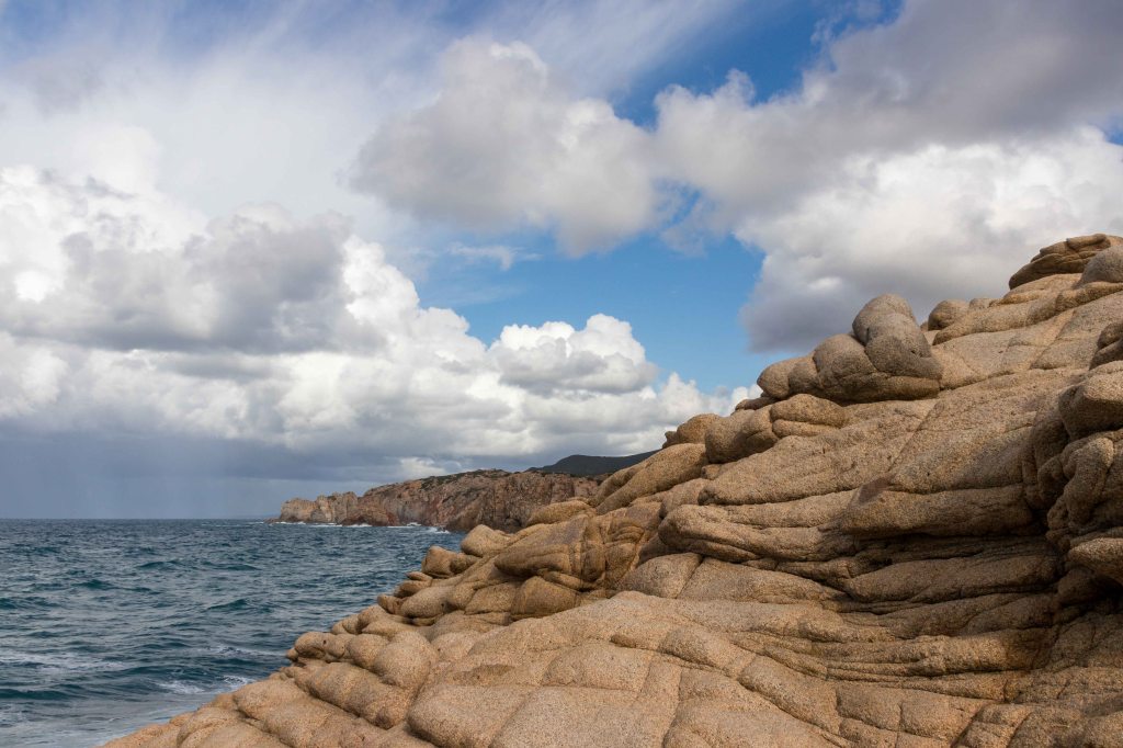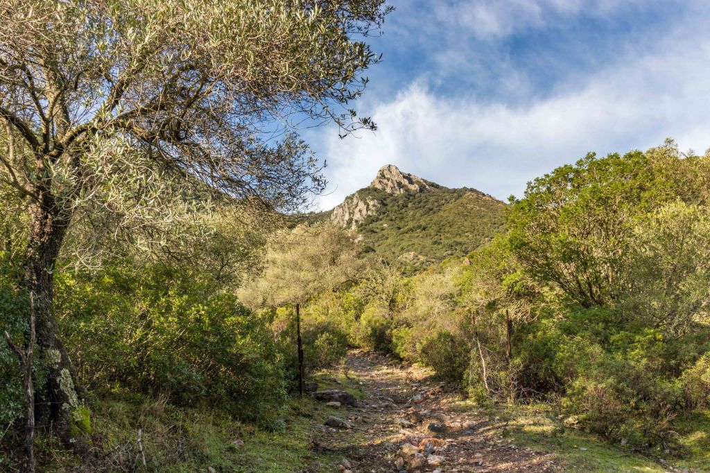 Steil und schweißtreibend führt die Piste durch die intensiv riechende Macchia. Die Erbeerbaumerdbeeren sind nun reif und schmecken gut, viele Korkeichen säumen den Weg. Nach gut zwei Stunden erreiche ich den flachen Gipfel der 499 m hohen PUNTA MUMOLLONIS. Mit einem Vesper und kühlen Ichnusa (einer sardische Hopfenkaltschale) lässt sich die Aussicht gleich noch besser genießen. Der Blick geht über die runden Hügel der COSTA VERDE, mit dem markanten Gipfel des MONTE ARCUENTU bis zum CAPO PECORA. Jetzt ziehen wieder Regenschauer von Westen über das Meer, einer von ihnen verschont auch mich nicht. Doch im Schutz einer Korkeiche lässt sich der kurze Regen gut aushalten.