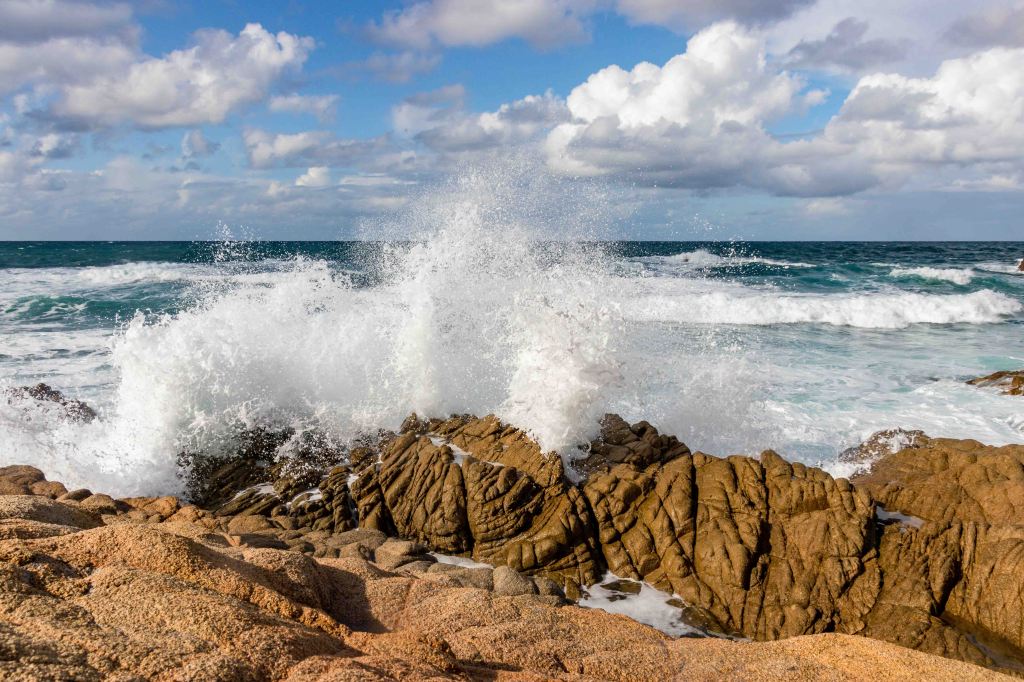 Doch kaum haben wir uns ausgeschimpft, wird das Wetter sogar besser als die Vorhersage; Petrus sei dank. Am Morgen ist der Himmel weiß-blau, nur über den Bergen hinter uns schiebt der Wind die Wolken noch zusammen. Wir fahren ein kleines Stück auf die Halbinsel des CAPO PECORA, das immer noch von den gischtenden Wellen umtost ist. Peter nutzt das sonnige Wetter für eine Wanderung. Doch kaum bin ich ein paar Meter gelaufen, schreit, bellt, und trötet es um mich herum. Es ist Sonntag und die Sarden frönen ihrem liebsten Hobby, der Jagd. Gut zehn Männer in orangenen Westen stehen auf den Pisten und versuchen Wildschweine aufzuscheuchen. Mir zeigen sie den Weg um ihr Jagdgebiet herum. Vorsichtshalber ziehe ich den leuchtend gelben Regenschutz über den Rucksack und ziehe meinen roten Anorak an. Plötzlich zwei Schüsse, dann ist Ruhe. Wahrscheinlich musste ein Wildschein sein Leben lassen.