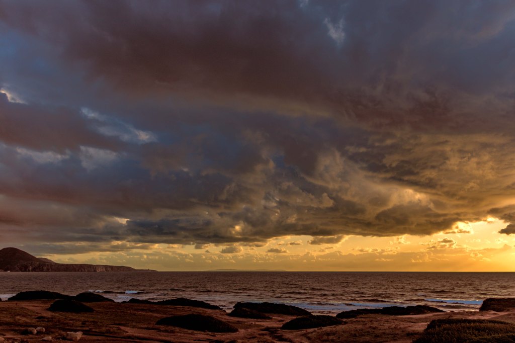 Am Abend ziehen wieder dicke schwarze Wolken auf. In der Nacht fegen noch ein paar heftige Regenschauer über uns hinweg, die dann jedoch wie abgeschaltet aufhören.