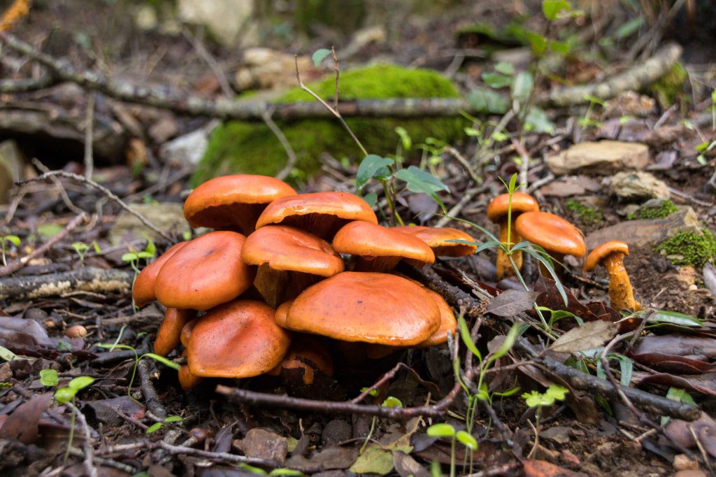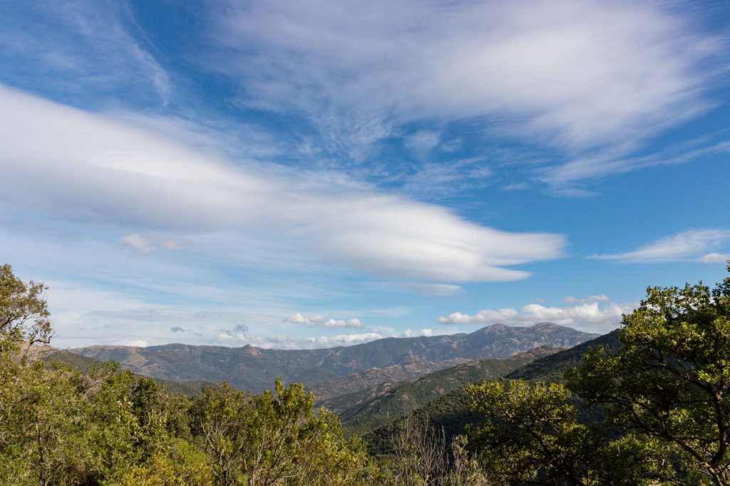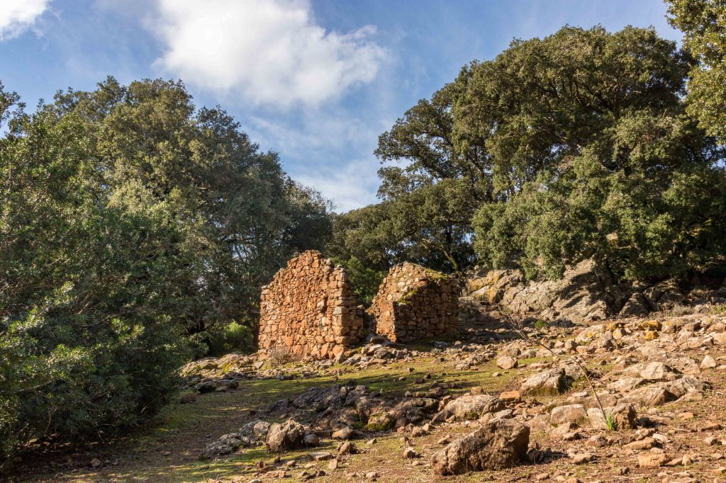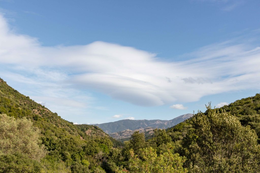 Wir können es kaum glauben: Nach dem Einkauf im ehemaligen Bergarbeiterdorf FLUMINIMAGGIORE reißt sogar der Himmel über den Bergen auf. So fahren wir ein Stück dem RIO MANNU, später dem RIO ANTAS folgend, flussaufwärts. Peter will natürlich das Wetter wieder für eine Wanderung nutzen, die über alte Pfade und Pisten des ehemaligen Bergbaugebiets führen. Die ersten Kilometer teilt sich der Weg mit einem Bach, der nach dem vielen Regen über die bunten Steine plätschert. Den Pilzen hat das feuchte Wetter sichtlich gut getan. In vielen Serpentinen geht es hinauf zur Passhöhe QUADDU MURRA und dann weglos zum 651 m hohen MONTE CORONGIU E‘ MUVRONIS. Auch von diesem Gipfel liegt mir die COSTA VERDE zu Füßen, am Horizont erhebt sich der gut bekannte MONTE ARCUENTU über die grünen Hügel. Der Wind fegt mir der Wind um die Ohren, jetzt rauschen nicht die Wellen, jetzt rauschten die Bäume im Sturm. Hoch am Himmel zeigen mächtige Lentis den Sturm an. Der Weg zurück führt an den Ruinen ehemaliger Bergwerkhäuser und Schutthalden vorbei. Schön ist der Kontrast des leuchtend grünen Getreides zu den dunkelgrünen Korkeichen.