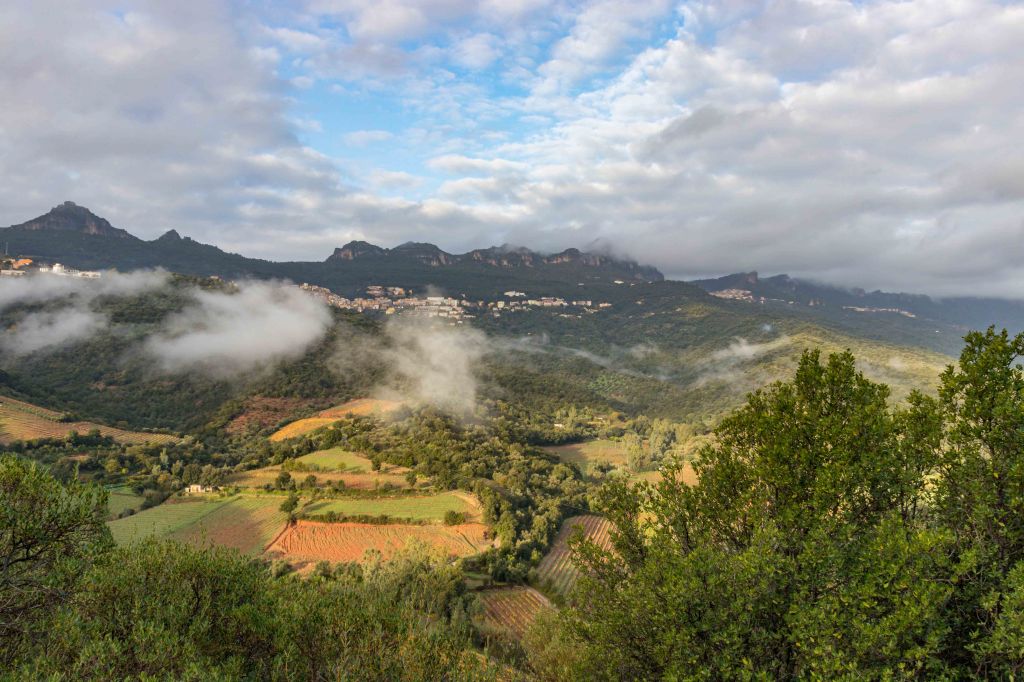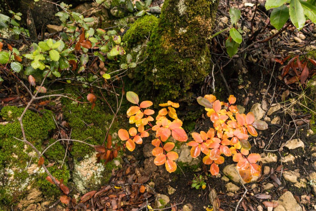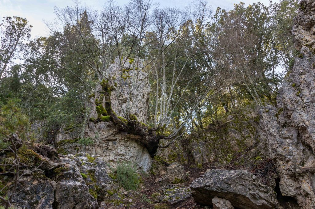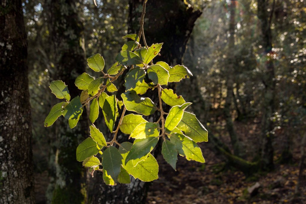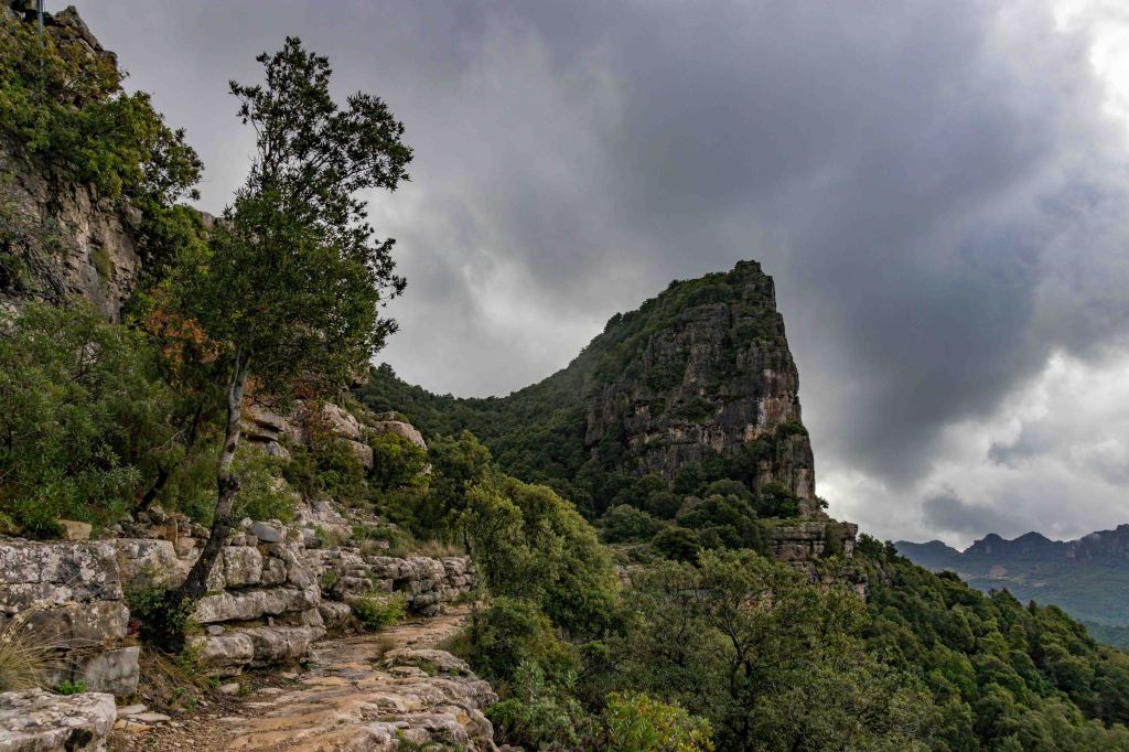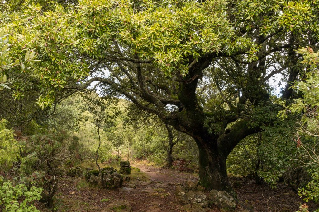 Peter marschiert los. Durch die enge Hauptstraße geht es zum Einstieg der kleinen Tour auf der anderen Seite des Dorfes. Steil und in vielen Serpentinen führt der Steig hinauf und unter die senkrechten Wände der PUNTA MATZEU. Wunderbar ist der Blick auf ULASSAI und das Meer, der MONTE FERRU verhüllt sich noch. Immer wieder ziehen Nebelschwaden über den Berg und tauchen den niederen, dunklen Wald in ein gespenstiges Licht. Die Kork- und Steineichen sind immergrün, wie auch die Büsche der Macchia. Es gibt nur ein paar wenige Farbtupfer: herbstlich orangene Blätter und die rot leuchtenden Früchte des Erdbeerbaumes, die nun auch massenhaft am Boden liegen. Die Wildschweine, die überall den Boden aufgegraben haben, scheinen sie nicht zu mögen. Auf dem kleinen Gipfelplateau der PUNTA ist schön Rasten. Gemütlich führt der Weg hinunter zum kleinen Bergeinschnitt SCALA ‚E PREDI, gegenüber erhebt sich ein felsiger Gebirgszug über den grünen Hängen. Ein kleines Felsband, sogar mit Seilsicherung, führt zurück in den Wald und zum Schluss auf breiter Straße nach ULASSAI zu unserem Übernachtungsplatz.