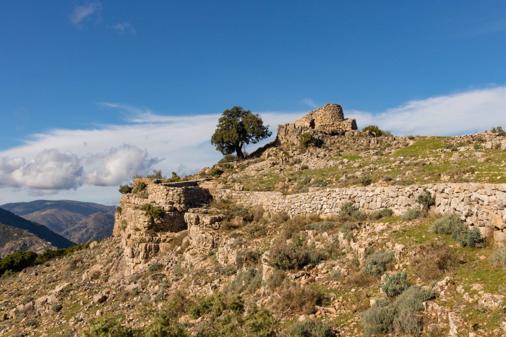 Ein paar Kilometer weiter ins Landesinnere hinein, steht die NURAGHE ARDASEI malerisch auf einem kleinen Hügel. Die beiden heute bestiegenen Gipfel sind gut zu sehen: in der Mitte der Stumpf der PERDA ‚ELIANA, rechts davon die runde Kuppe der PIZZU MARGIANI POBUSA.