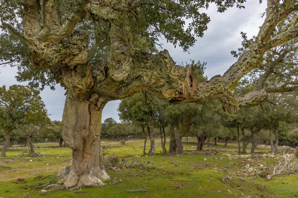 Wir sind am Rande der GALLURA, dem Zentrum der sardischen Korkproduktion. Rot leuchten die frisch geschälten Stämme in dem lichten Wald. Alle 8 bis 10 Jahre kann der Baum neu geschält werden und mit jeder Schälung wird der Kork besser, was aber maximal 8 bis 10 mal möglich ist. Einziges Werkzeug der Arbeiter ist eine Axt, mit der wird unterhalb der Krone und am Fuß des Baumes eine ringförmige Kerbe geschlagen. Längsschnitte verbinden die beiden Querschnitte. Die Arbeiter lockern mit dem hinteren Ende der Axt die Rinde bis sie abfällt. In großen Steinwannen wird der Kork gekocht und dann in der Sommerhitze getrocknet. 80 % der italienischen Produktion kommen aus Sardinien. Hergestellt werden Schuhsohlen, Tapeten, Isolierstoffe, Wand- und Fußbodenbeläge. Die besten Stücke werden natürlich zu Korken verarbeitet.