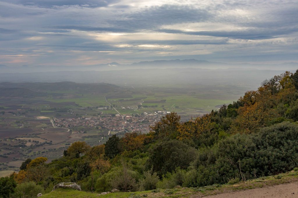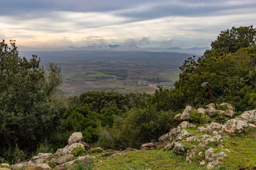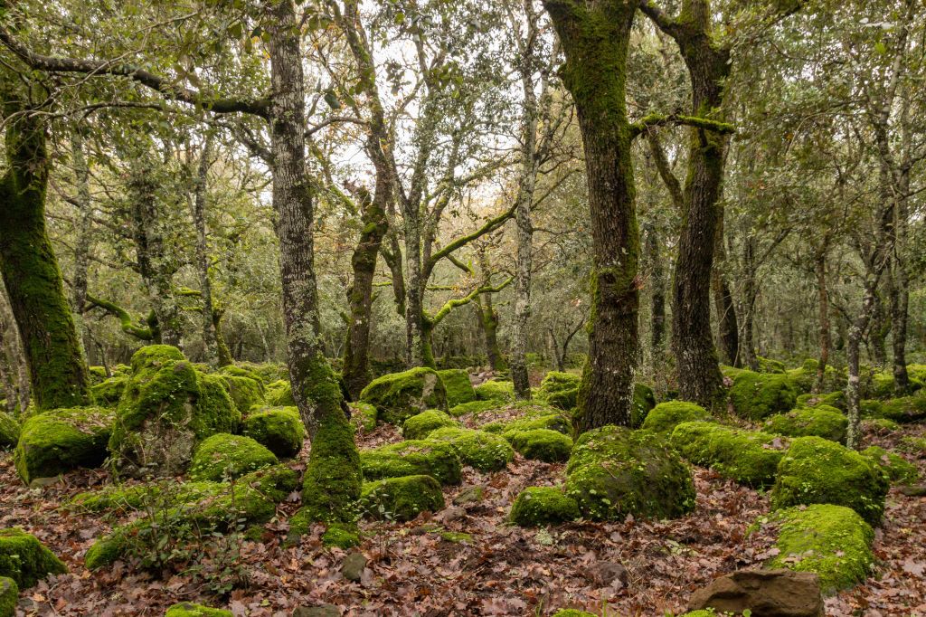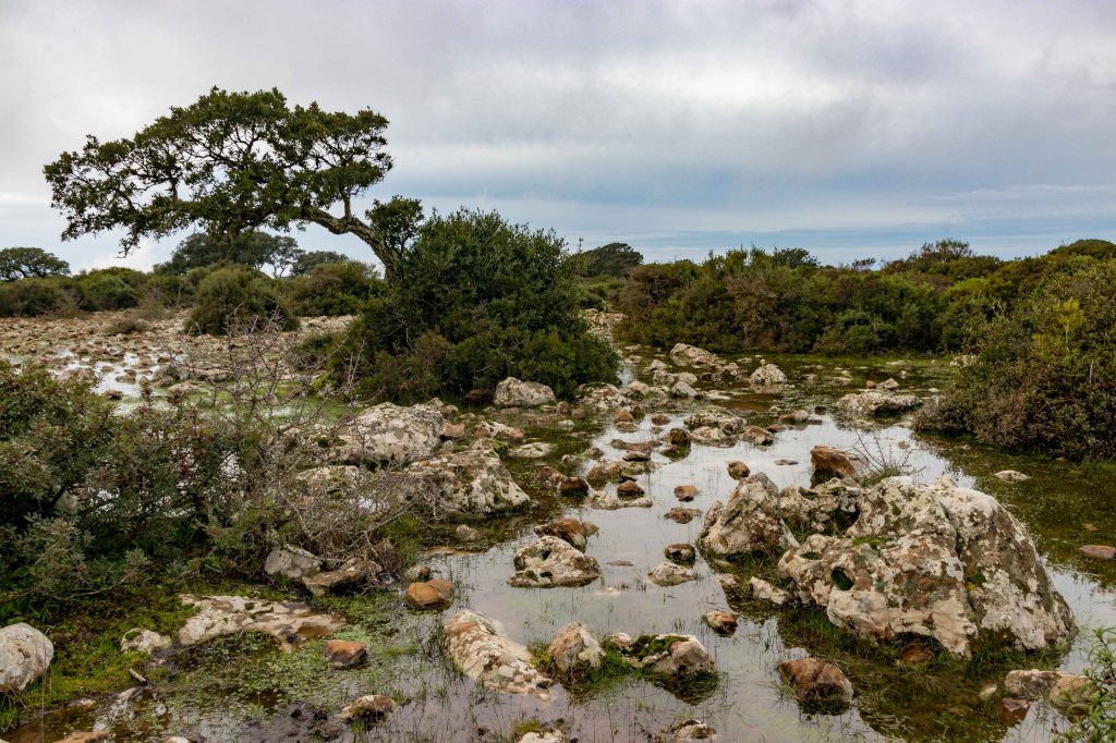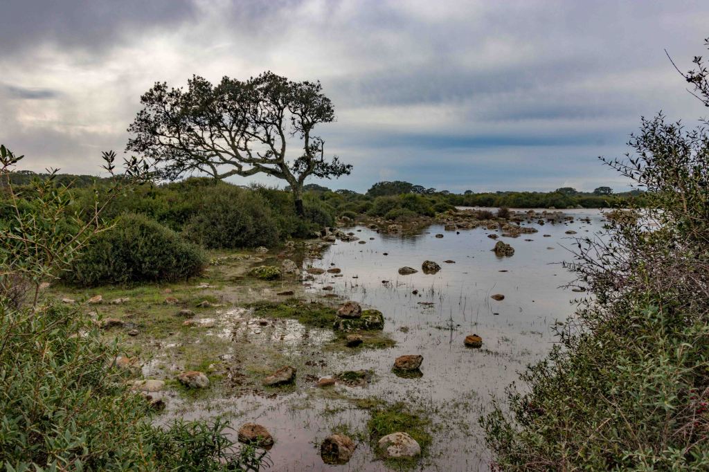 Trotz des angekündigten Regens wagen wir uns auf die Hochebene GIARA DI GESTURI. Mit 550 m ü.d.M. überragt der vulkanische Tafelberg die weite Ebene. Eine Besonderheit sind die kleinen, halbwilden Pferde, Is Quaddeddus, wie sie auf sardisch heißen. Peter macht sich sogleich auf den Weg. Doch hier scheint es in den letzten Tagen heftig geregnet zu haben und die Hochfläche ist wasserundurchlässig. War bei unseren letzten Besuchen alles trocken, steht nun selbst auf den Wegen das Wasser knöcheltief. Streckenweise geht es nur barfuß weiter. Die sonst wenig scheuen Pferde verstecken sich im dichten Gestrüpp und suchen wohl unter einer der alten Korkeichen etwas Schutz vor dem Regen.