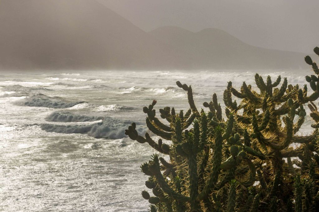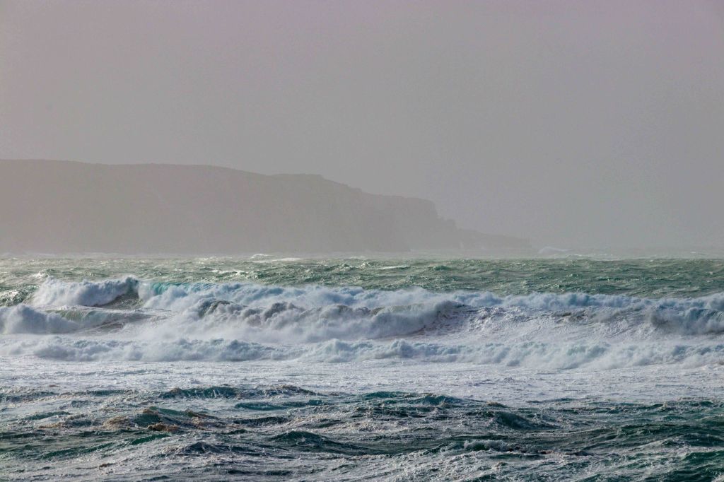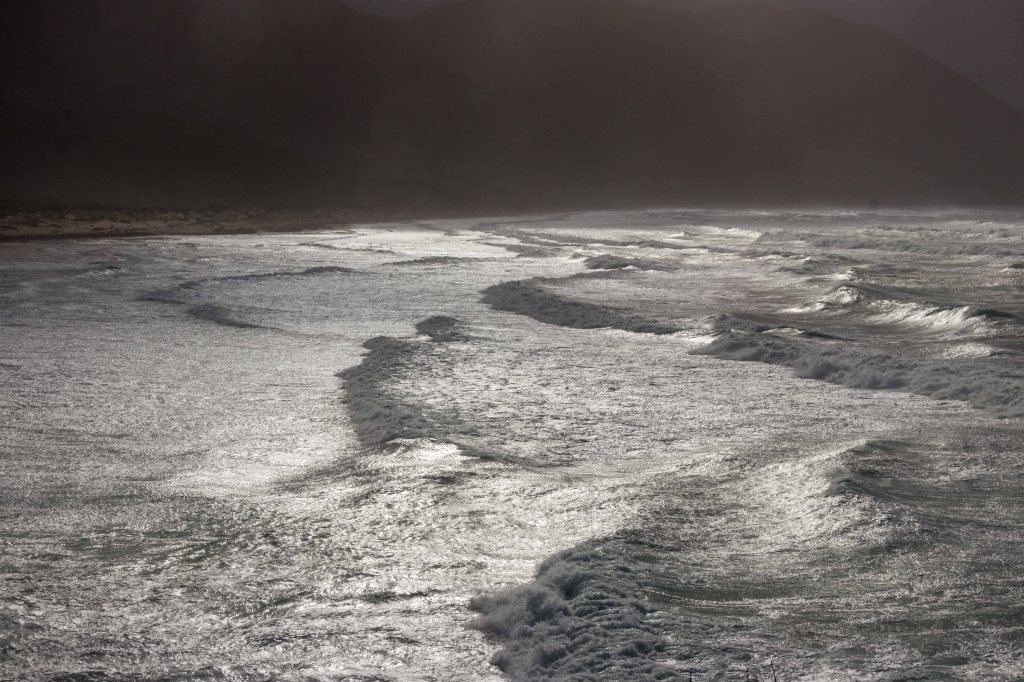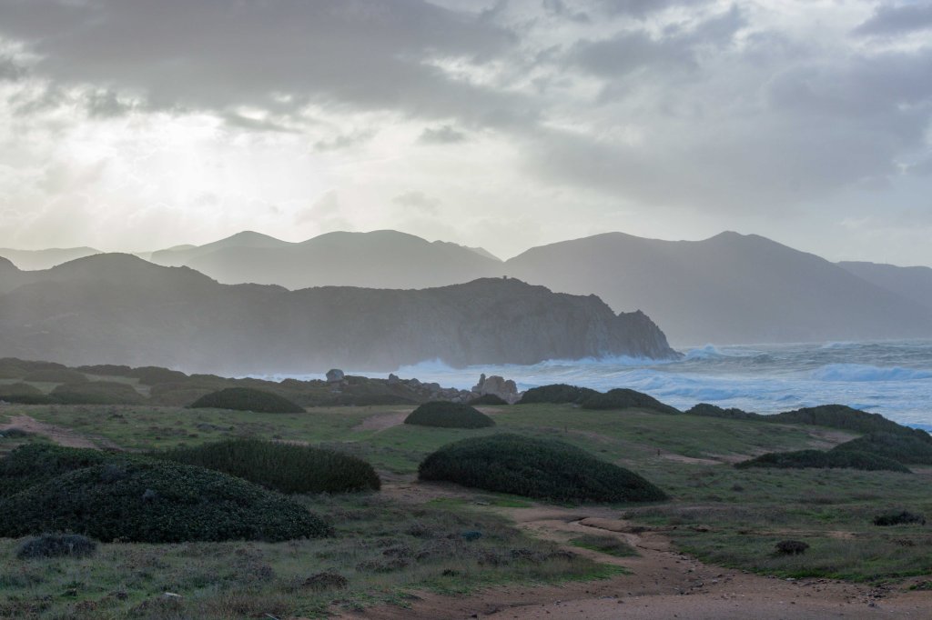 In der Nacht hat es heftig geregnet und wir sehen am Morgen keine zehn Meter weit. Da ist das Wasser bestimmt noch einmal um ein paar Zentimeter gestiegen. Vorsichtig tasten wir uns hinunter nach TUILI. Überall ergießen sich Bäche über den steilen Abhang auf die Straße, die streckenweise zum Flussbett wird. Der angesagte Sturm für die nächsten Tage wird über den Bergen wieder viele Wolken bringen. So fahren wir in der Hoffnung auf ein paar Sonnenstrahlen ans Meer, noch einmal zum CAPO PECORA. Der Westwind schiebt die mächtigen Wellen, so wie wir sie nur vom Atlantik kennen, auf den weiten Strand. Letztendlich finden wir in der Ferienhaussiedlung PORTIXEDDU einen windgeschützten Platz mit Blick auf das tosende Wasser.