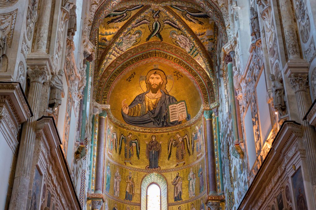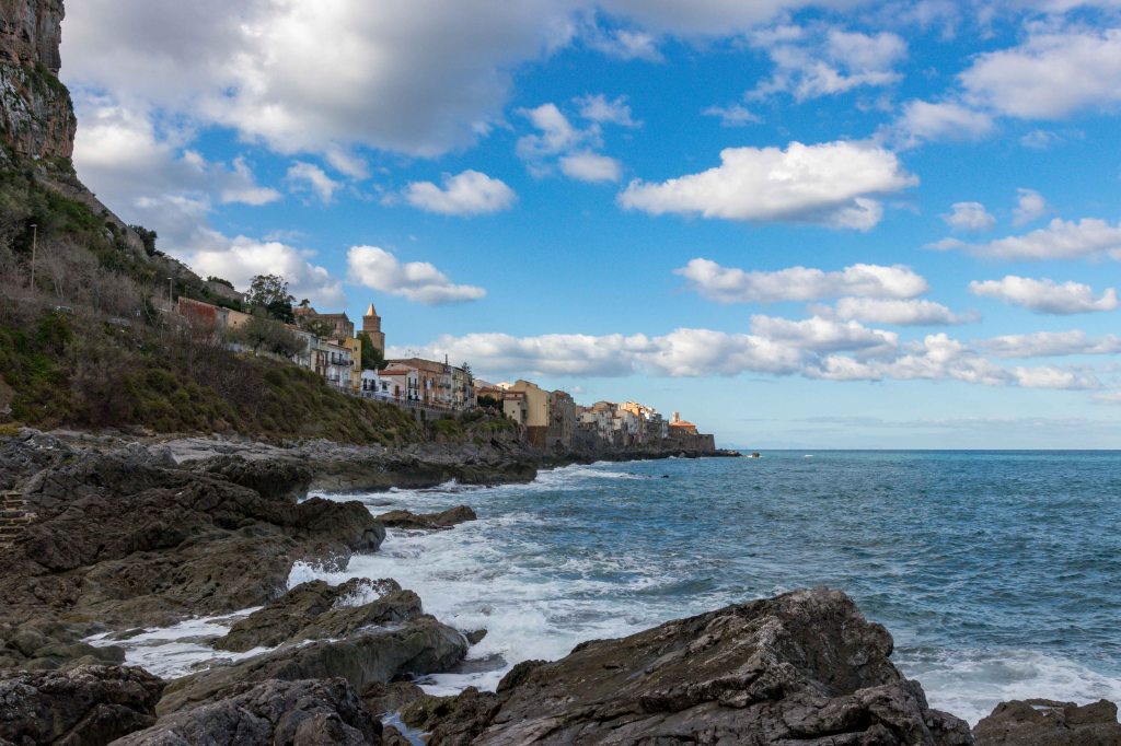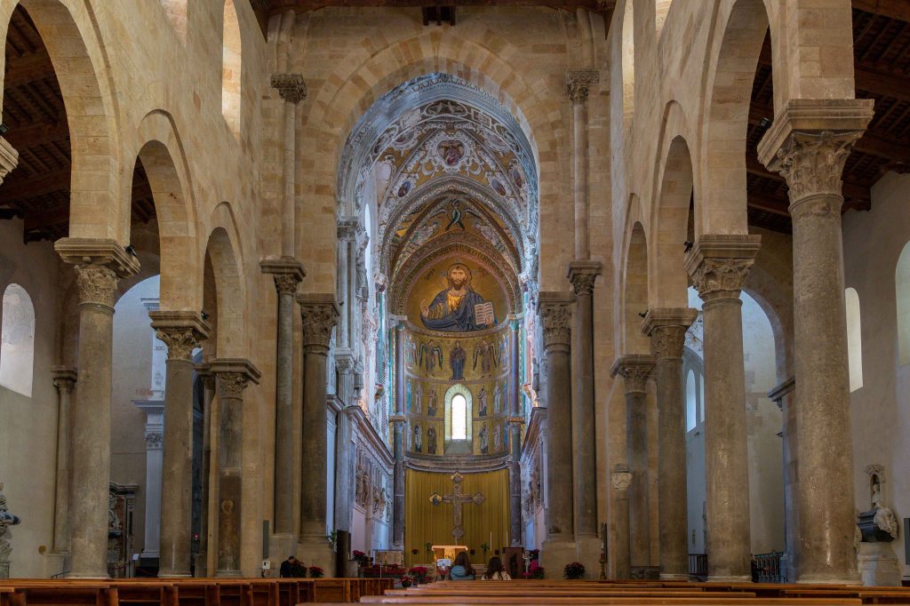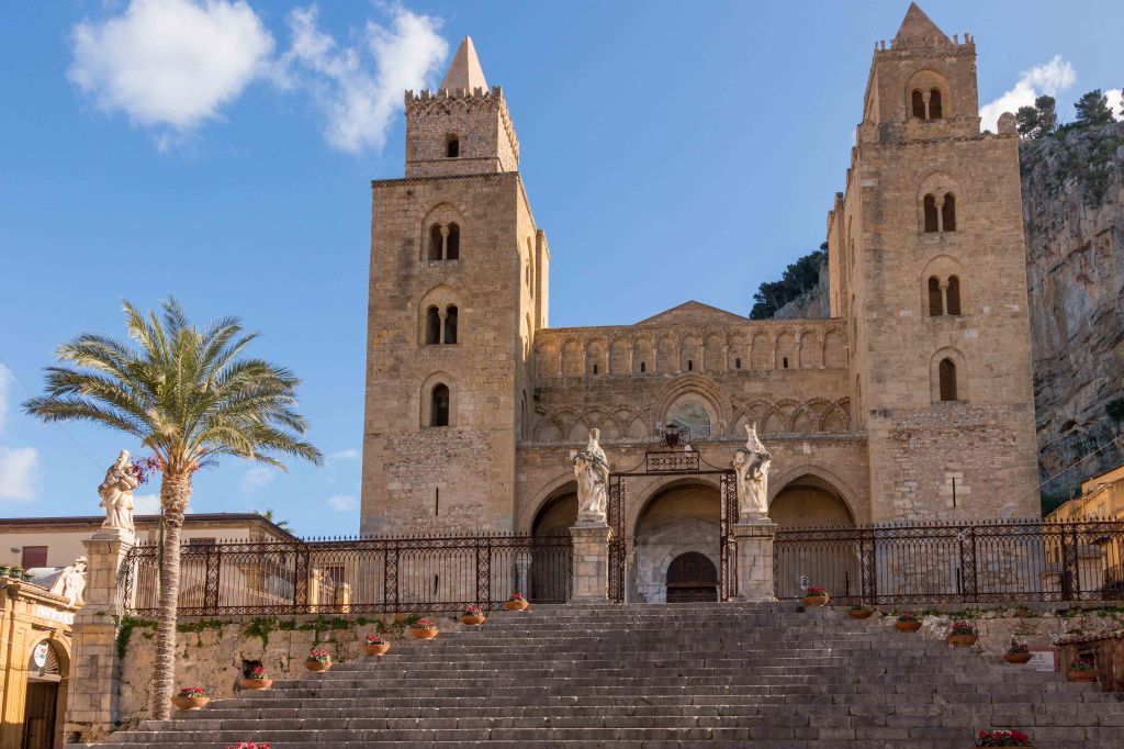 Dann folgen wir wieder den Spuren des Nomannenkönigs Roger II. Im Jahre 1131 kam er auf dem stürmischen Meer in Seenot. Da kann doch nur ein Gelübde die Rettung bringen. Also versprach er, dort eine Kirche zu bauen, wo er sicheren Fußes an Land gehen konnte. Das war bei der etwas heruntergekommenen Ortschaft CEFALÚ. Zwar war der Felsen bereits in der Vorgeschichte bewohnt, aber nach der Herrschaft der Phönizer, Griechen, Römer und Araber verlor der Ort an Bedeutung. Mit dem Bau des großen Doms und die Ernennung zu einer eigenen Diözese nahm sie einen neuen Aufschwung. Doch kaum war die Macht demonstriert, verlor der Herrscher das Interesse, die Kirche konnte erst über 100 Jahre später geweiht werden und ist bis heute unvollendet.