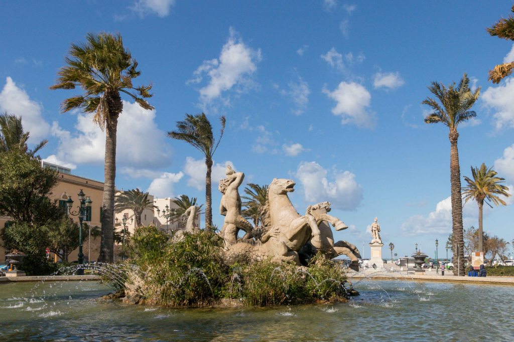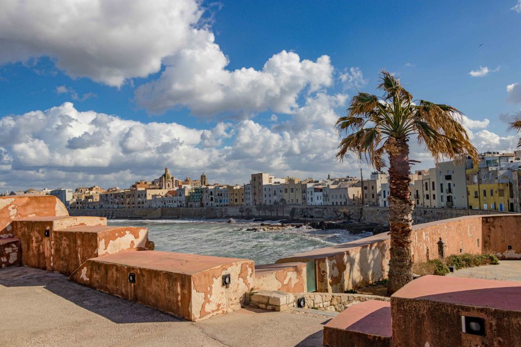 Ein Sturm mit Windgeschwindigkeiten von bis zu 60 km/h zieht von Westen her über Sizilien. Bei dem Wetter macht es keinen großen Spaß durch die weitläufigen Salinen zu spazieren, wir können uns kaum auf den Beinen halten. Da ist es besser, wir suchen uns einen windgeschützten Platz im nahen TRÀPANI, den wir auch in der Nähe des Bahnhofs finden. Trotz des Windes brechen wir zu einer kleinen Runde durch die alte Stadt auf. Es ist Mittag und so sind leider alle Geschäfte und sogar die Cafés geschlossen. Da auch nur wenig Menschen bei dem Sturm unterwegs sind, wirkt die barocke Stadt leider etwas trist. An der Landzunge, der Sichel, bläst der Sturm unvermindert, zwei Meter hohe Wellen rollen in die halbkreisförmige Bucht. Hier soll Kronos auf Geheiß seiner Mutter Gaia seinem Vater Uranos mit einer Sichel entmannt und diese dann ins Meer geworfen haben. Aus der Sichel entstand die gleichförmige Landzunge und aus dem Blut und dem Samen, vermischt mit dem Meeresschaum, entstieg die wunderschöne Aphrodite.