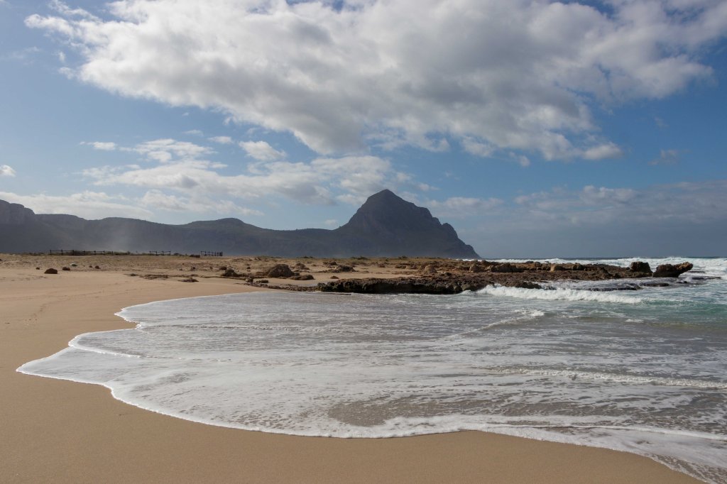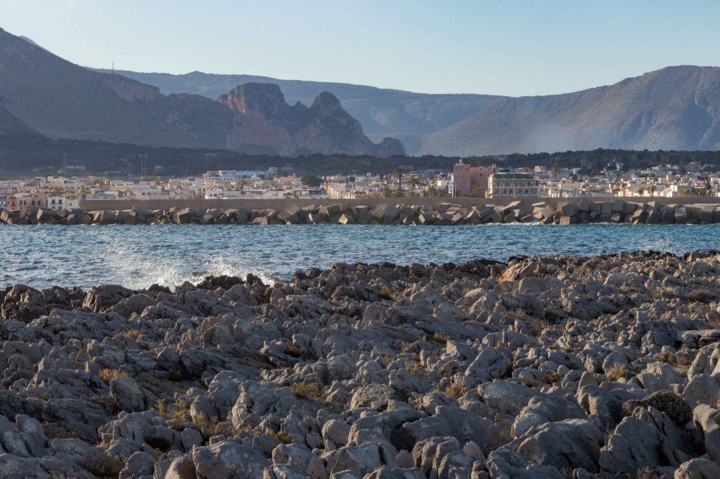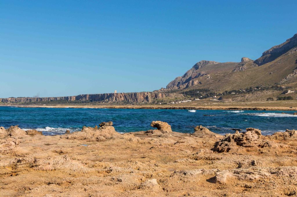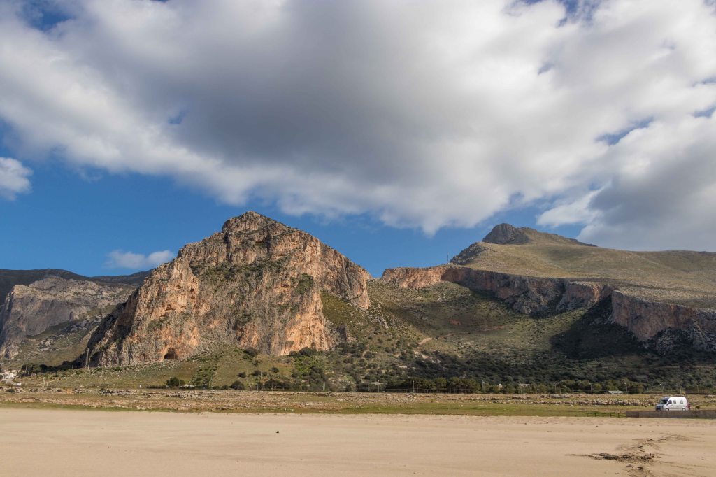Der Wind schläft fast ein, die Wellen plätschern nur noch ganz leicht an die Küste. Ein Platz unterhalb des mächtigen Kegels des MONTE COFANO, an den wir vor drei Jahren ein paar schöne Tage verbrachten, ist leider, wie viele andere Strände in Sizilien auch, meterhoch von abgestorbenen Seegras überzogen. So fahren wir lieber noch ein Stück weiter. Unterwegs kaufen wir bei einem Conad-Supermarkt ein und sind wieder einmal von dem frischen Angebot überrascht. Drei Metzger sind an der Fleischtheke beschäftigt, von der Käsetheke nehmen wir eine Auswahl mit, dazu passen gut ein paar eingelegte Oliven. In Sichtweite des Ferienortes SAN VITO LO CAPO mit dem markanten Leuchtturm, bleiben wir am weiten, meist felsigen Strand stehen.