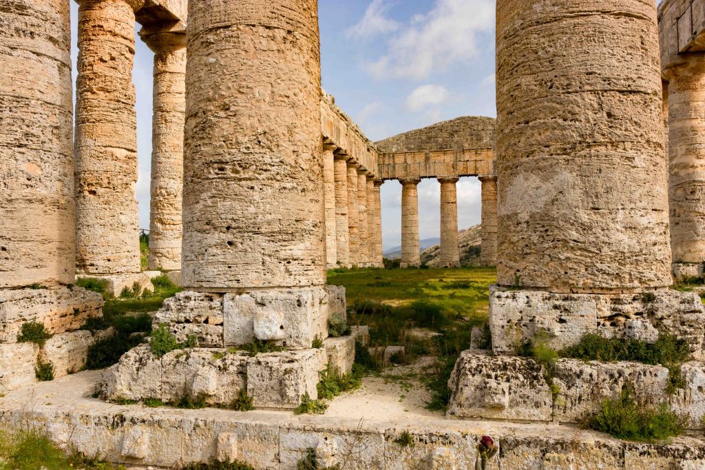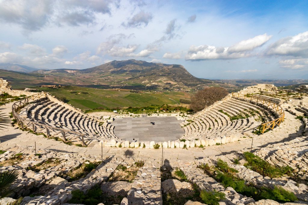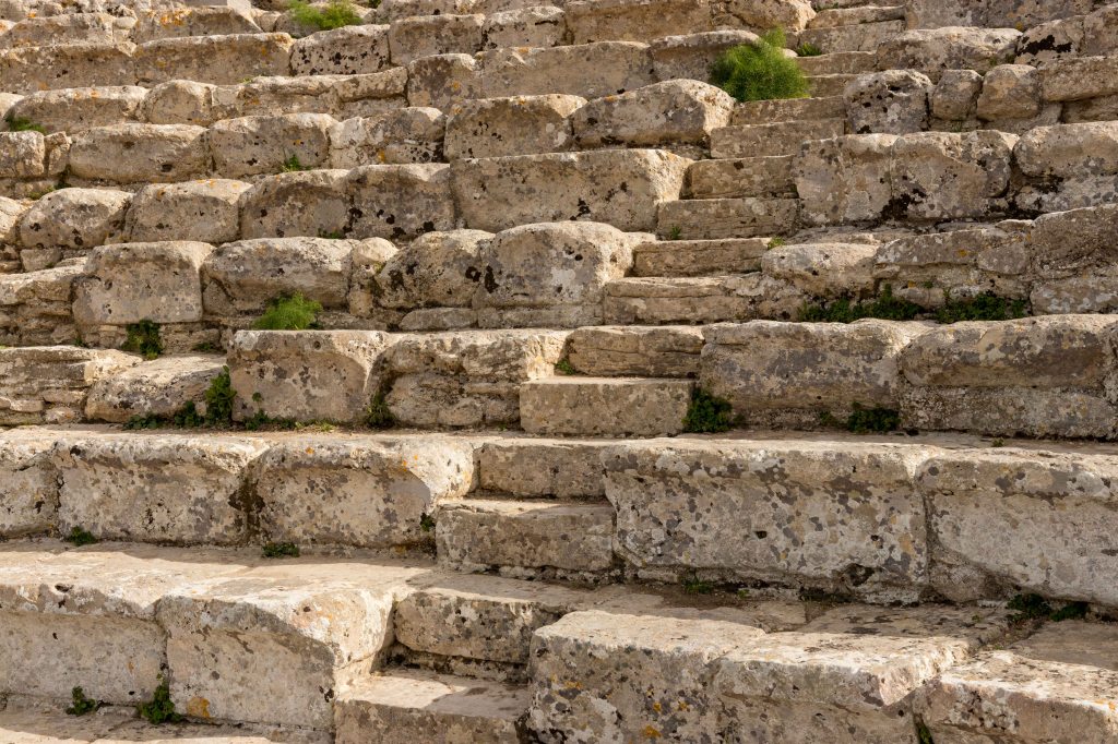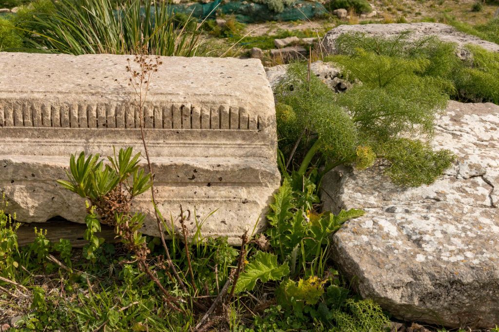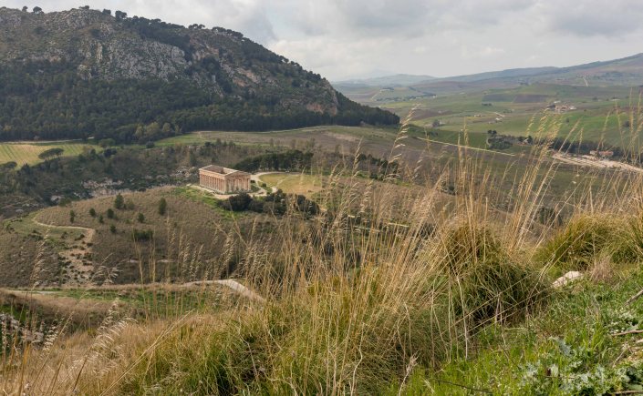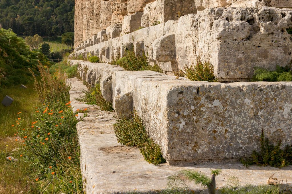 Peter lässt es sich nicht nehmen und dreht eine Runde auf dem weitläufigen Gelände, ist es doch eines der schönsten Altertümer, die wir kennen. Ein wunderbarer Tempel und ein Amphitheater liegen malerisch in der hügeligen Landschaft. Der Tempel sieht einfach großartig aus, perfekt in den Proportionen und in unvergleichlicher Lage. Dennoch ist er unvollendet: Die Transportzapfen sind an den Steinen der Basis noch nicht abgeschlagen und die Säulen sind immer noch rund, die übliche Kannelierung fehlt. Anders als Goethe, der den Spaziergang zu einem weiteren Steinhaufen verweigerte, spaziere ich auf den Hügel zum gut erhaltenen Theater mit der fantastischen Aussicht.