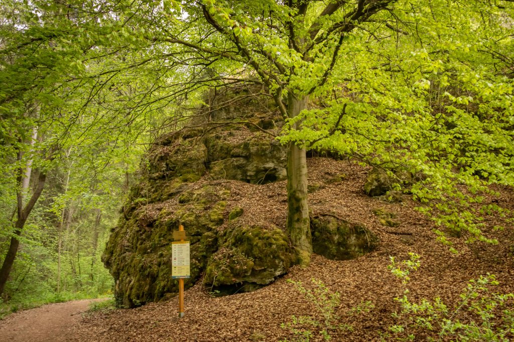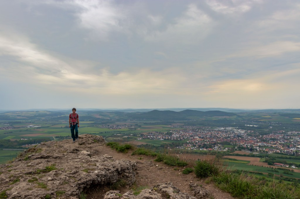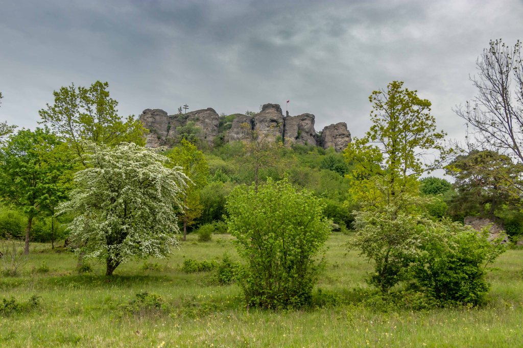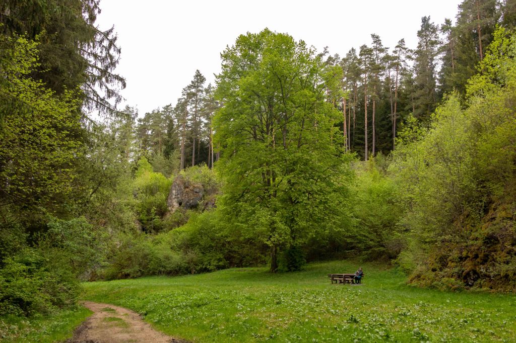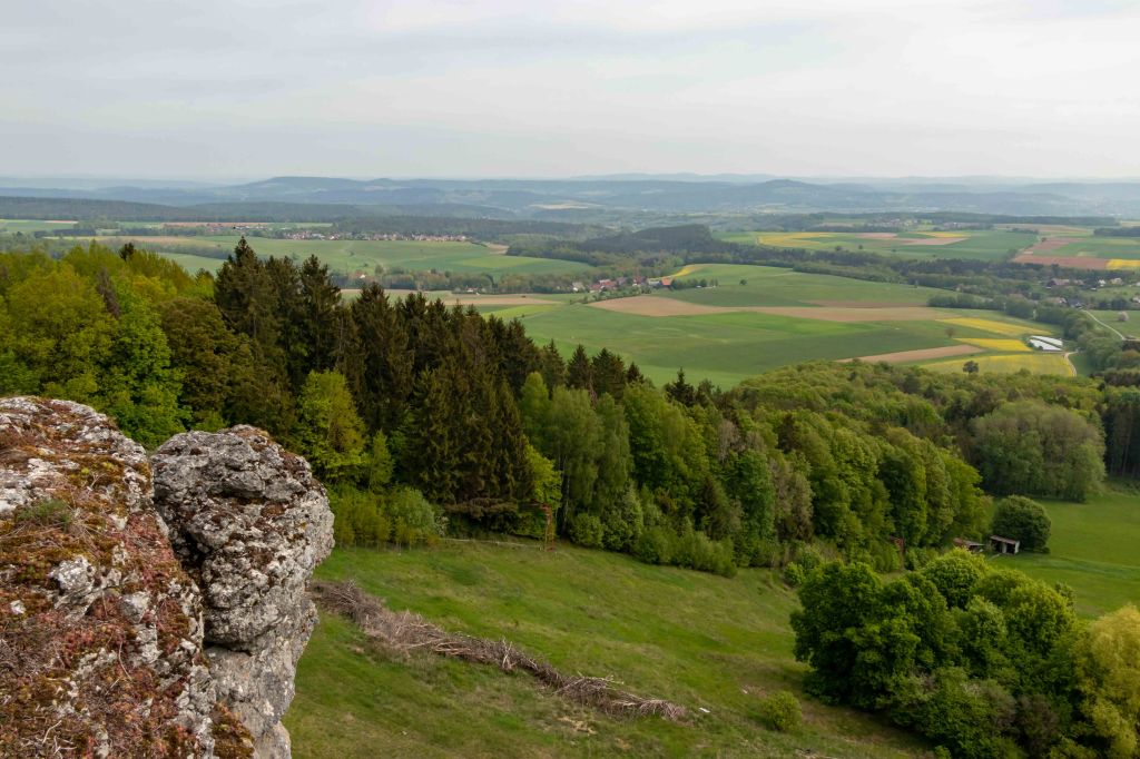 Eigentlich wollten wir am Wochenende fliegen, doch das Wetter, nach vielen warmen Frühlingstagen, schlägt wieder um und die Natur bekommt hoffentlich den benötigten Regen. Da der Übergangstag zwar schon grau ist, aber noch trocken bleiben soll, zeigt mir mein Freud Christian das Fluggelände am GÖRAUER ANGER. Mit weitem Blick hinein in das MAINTAL und hinüber nach KULMBACH präsentiert sich die Hochfläche aussichtsreich. Und wie auf so vielen markanten Bergen (Görau leitet sich vom slawischen gora, das Berg bedeutet, ab) lebten hier bereits vor über 4000 Jahren Menschen. Zwar kommt der Wind aus Osten und somit aus der richtigen Richtung, aber mir ist er nach einer langen fluglosen Zeit ein wenig zu wenig. So nehmen wir unsere Füße in die Hände und drehen eine Runde. Im Magerrasen des GÖRANGER ANGERS stehen markante einzelne Bäume, die Kastanie hat bereits ihre Blütenkerzen entfaltet und die ersten Mohnblumen leuchten rot. Dann tauchen wir in den Buchenwald ein, die leuchtend grünen, zarten Blätter lassen noch den Blick auf die vielen markanten Felsen des BÄRENTALS zu. In einer der Höhlen wohnten bereits vor 8000 Jahren Jäger. Ein mächtiges Felsentor bietet ambitionierten Kletterern anspruchsvolle Routen (wie auch die gesamte Fränkische Schweiz ein weithin bekanntes Kletterrevier ist). Vorbei an der KRASSACHQUELLE kommen wir zur RUINE NIESTEN, die hoch über der Ortschaft auf einem Felskegel stand. Da sie im 18. Jh. den umliegenden Orten als bequemer Steinbruch diente, sind heute nur noch ein paar spärliche Mauerreste zu sehen.