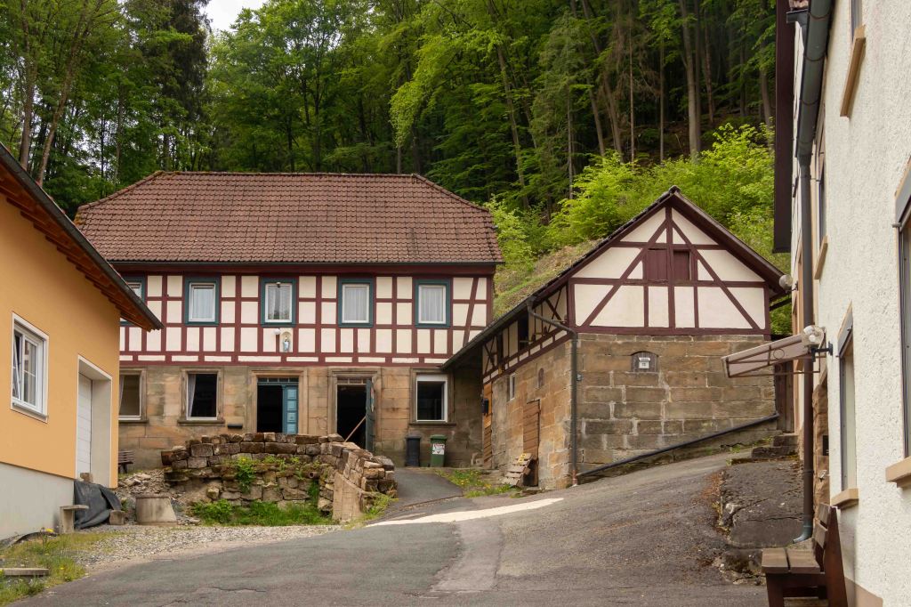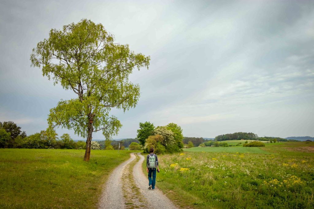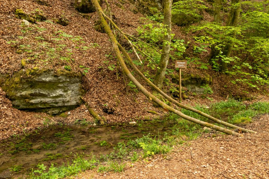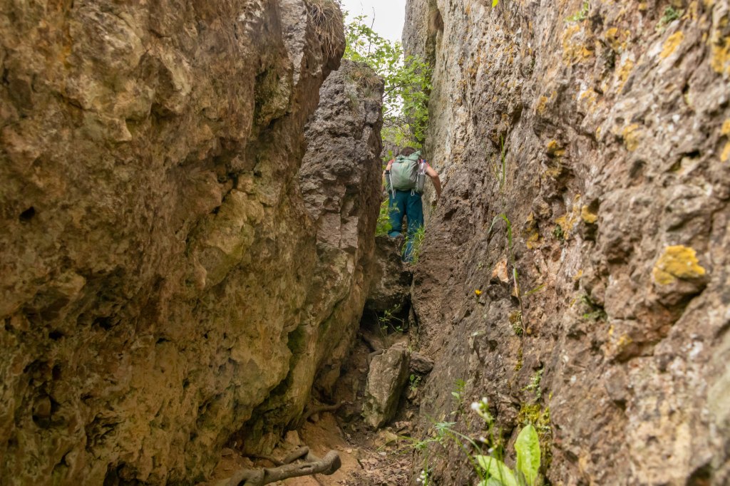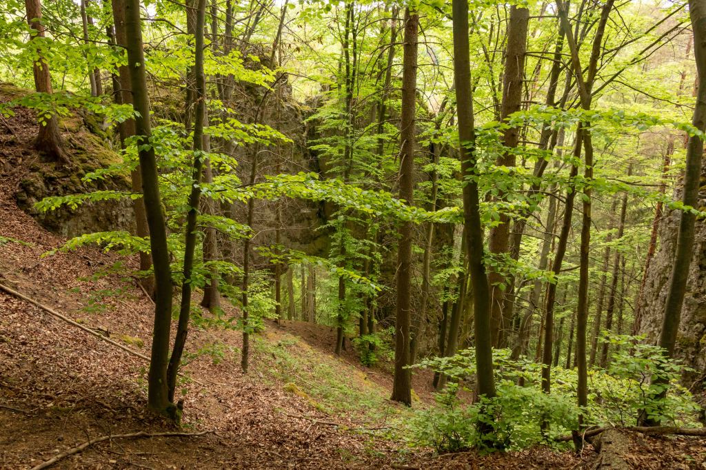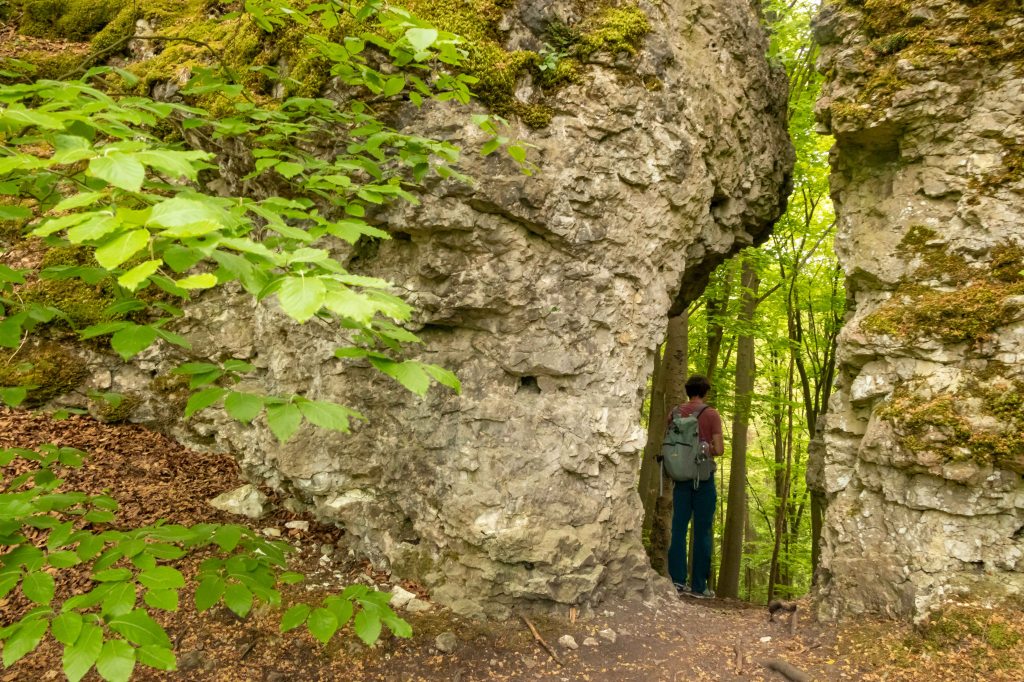 Eigentlich wollten wir am Wochenende fliegen, doch das Wetter, nach vielen warmen Frühlingstagen, schlägt wieder um und die Natur bekommt hoffentlich den benötigten Regen. Da der Übergangstag zwar schon grau ist, aber noch trocken bleiben soll, zeigt mir mein Freud Christian das Fluggelände am GÖRAUER ANGER. Mit weitem Blick hinein in das MAINTAL und hinüber nach KULMBACH präsentiert sich die Hochfläche aussichtsreich. Und wie auf so vielen markanten Bergen (Görau leitet sich vom slawischen gora, das Berg bedeutet, ab) lebten hier bereits vor über 4000 Jahren Menschen. Zwar kommt der Wind aus Osten und somit aus der richtigen Richtung, aber mir ist er nach einer langen fluglosen Zeit ein wenig zu wenig. So nehmen wir unsere Füße in die Hände und drehen eine Runde. Im Magerrasen des GÖRANGER ANGERS stehen markante einzelne Bäume, die Kastanie hat bereits ihre Blütenkerzen entfaltet und die ersten Mohnblumen leuchten rot. Dann tauchen wir in den Buchenwald ein, die leuchtend grünen, zarten Blätter lassen noch den Blick auf die vielen markanten Felsen des BÄRENTALS zu. In einer der Höhlen wohnten bereits vor 8000 Jahren Jäger. Ein mächtiges Felsentor bietet ambitionierten Kletterern anspruchsvolle Routen (wie auch die gesamte Fränkische Schweiz ein weithin bekanntes Kletterrevier ist). Vorbei an der KRASSACHQUELLE kommen wir zur RUINE NIESTEN, die hoch über der Ortschaft auf einem Felskegel stand. Da sie im 18. Jh. den umliegenden Orten als bequemer Steinbruch diente, sind heute nur noch ein paar spärliche Mauerreste zu sehen.