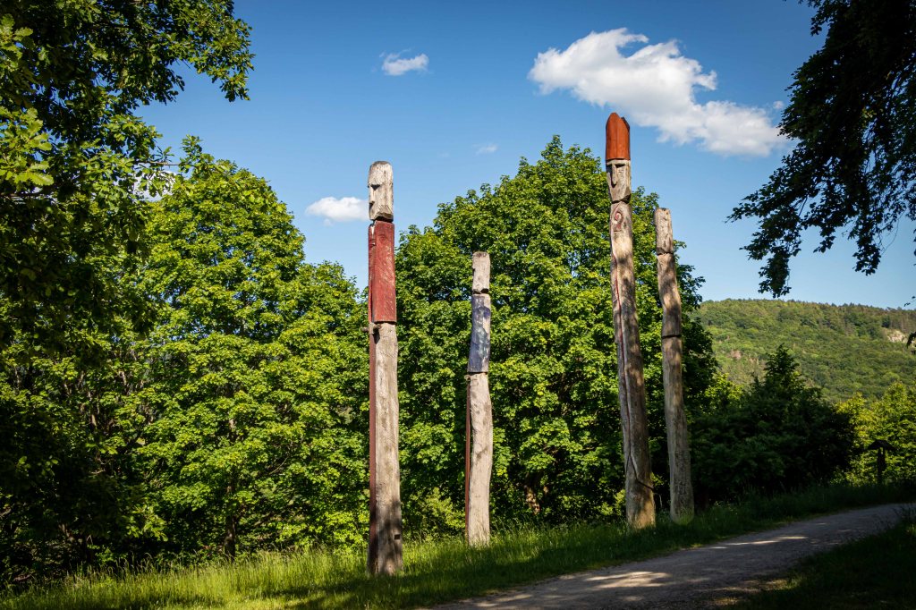 Gleich neben unserem Parkplatz steht auf einer kleinen Lichtung ein eigenartiges Kunstwerk: auf vier hohen Baumstämmen halten vier Köpfe angestrengt Ausschau.