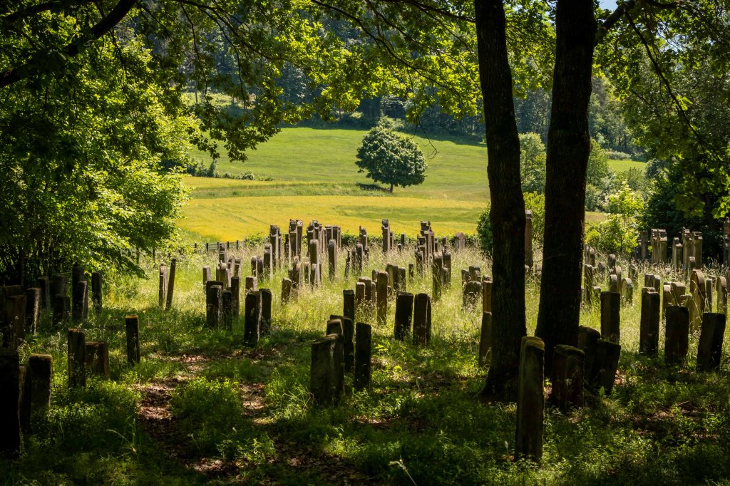 Eine erste Wanderung führt nach ZECKENDORF. Etwas außerhalb sehe ich am Waldrand viele Grabsteine. Es ist ein alter jüdischer Friedhof, der bereits im16. Jh. angelegt wurde. Seit dieser Zeit siedelten viel Juden in dieser Gegend, die unter dem Schutz des Klosters Langheim und des Freiherrn von Künßberg standen. Die letzten 18 wurden 1942 deportiert. Heute stehen noch fast 600 alte Grabsteine in der idyllischen Lage am Waldrand.