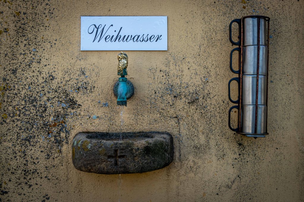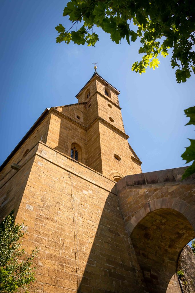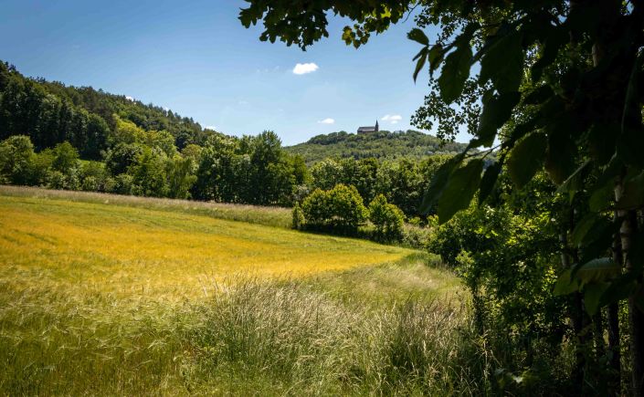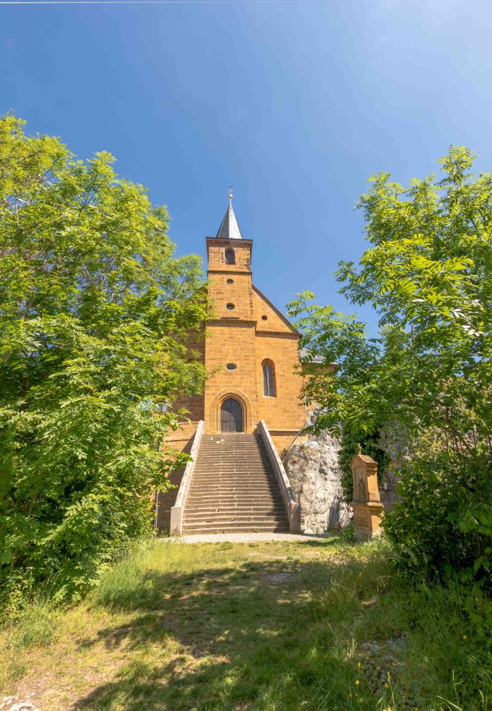 Über weite Flure komme ich zur Wallfahrtskirche GÜGEL, die auf einem Felsen hoch über den Buchenwald thront. Die mächtige Freitreppe ist bei Brautpaaren beliebt, lässt sich doch auch eine zahlreiche Hochzeitsgesellschaft aufs Erinnerungsfoto bannen. Mich zieht es weiter in den schattigen Biergarten.