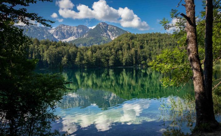 Und dann kommt er doch, der Sommer. Die Nacht ist noch recht frisch, am Morgen zeigen sich nur ein paar leuchtend weiße Wolken und im Laufe des Tages wird es angenehm warm. Erst sind wir am sagenumwobenen ALATSEE fast alleine, doch nach und nach füllt sich der Weg mit Wanderern und Fahrradfahrern. Da nur ein laues Lüftchen weht, spiegeln sich die schönen Wolken im glasklaren Wasser. Es bleibt bei einem kurzen Schwumm, denn es sträuben sich noch die Nackenhaare. Im Restaurant am See, das überraschend wenig Gäste hat, gibt es leckere Kässpatzen.