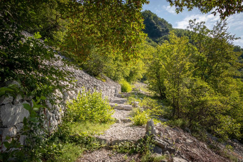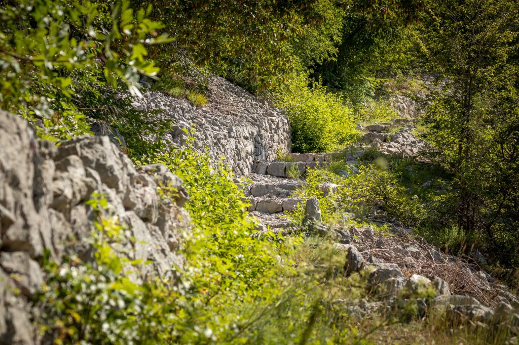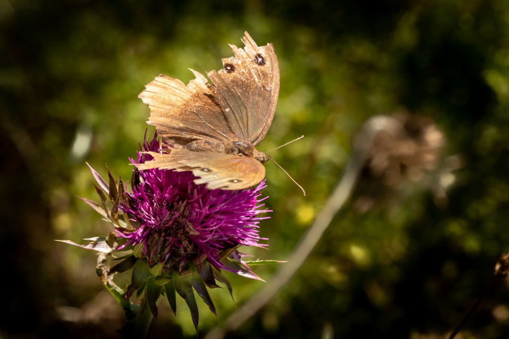 Die Berge am Rand der friulanischen Ebene, am breiten Bachbett des TAGLIAMENTO gelegen, sind nicht gar so steil. In die Hügel des Naturschutzgebiets rund um den LAGO DI CORNINO führt sogar ein bequem angelegter Weg über Treppen und in Serpentinen etwa 500 Höhenmeter hinauf zu einer kleinen Hochebene. Neben der Aussicht durch den schattigen Wald sind es wieder die Blumen und Insekten, die begeistern. Erstaunlich ist bei einem Schmetterling, dass beide Flügel in gleichem Maße zerzaust sind.