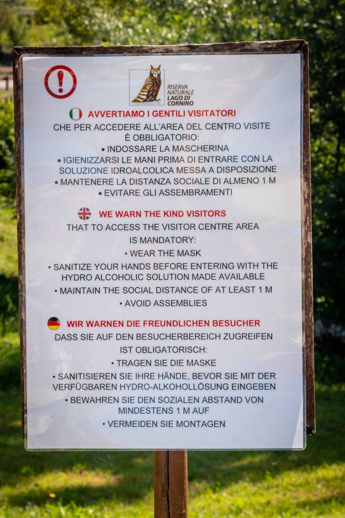 Am Parkplatz in SOMP CORNINO klärt uns ein Schild über die Corona-Verhaltensregeln auf. Was wir als freundliche Besucher mit unseren Händen machen und welche Montagen wir vermeiden sollen, ist uns nicht ganz klar.