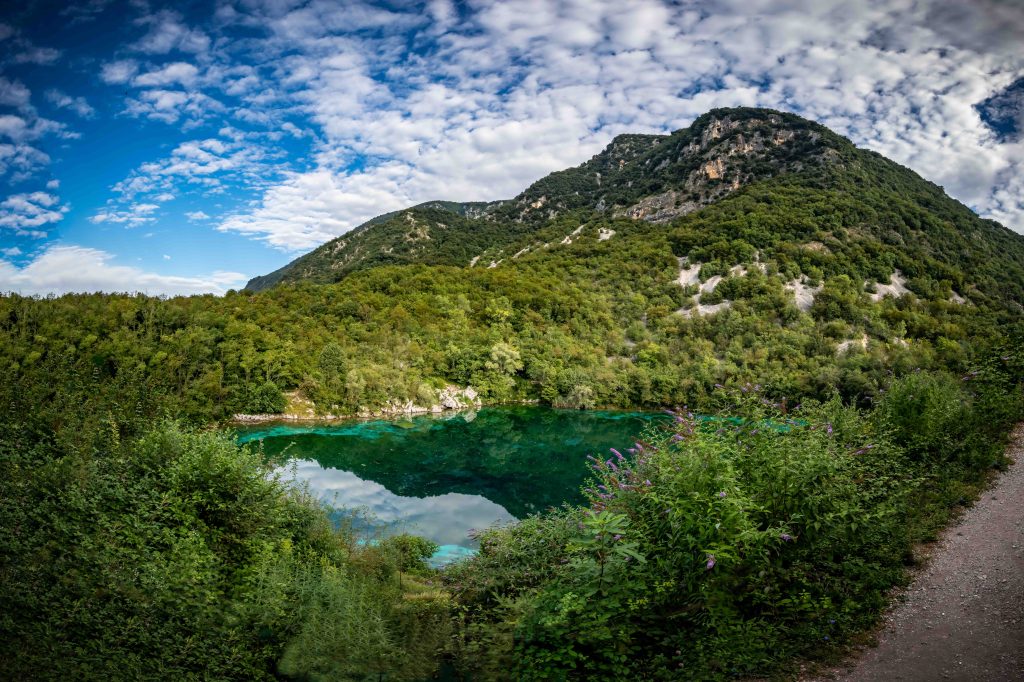 Am nächsten Morgen beobachten wir vom Ufer des LAGO DI CONRNINO aus, einem kleinen Karstsee mit glasklaren, noch einmal die Geier. Jetzt zählen wir zwei Dutzend Vögel (verstecken sich auf dem Foto in den Bäumen), die noch gemütlich in den Bäumen auf besseres Flugwetter warten.