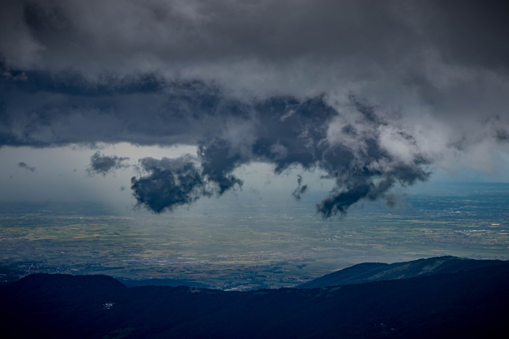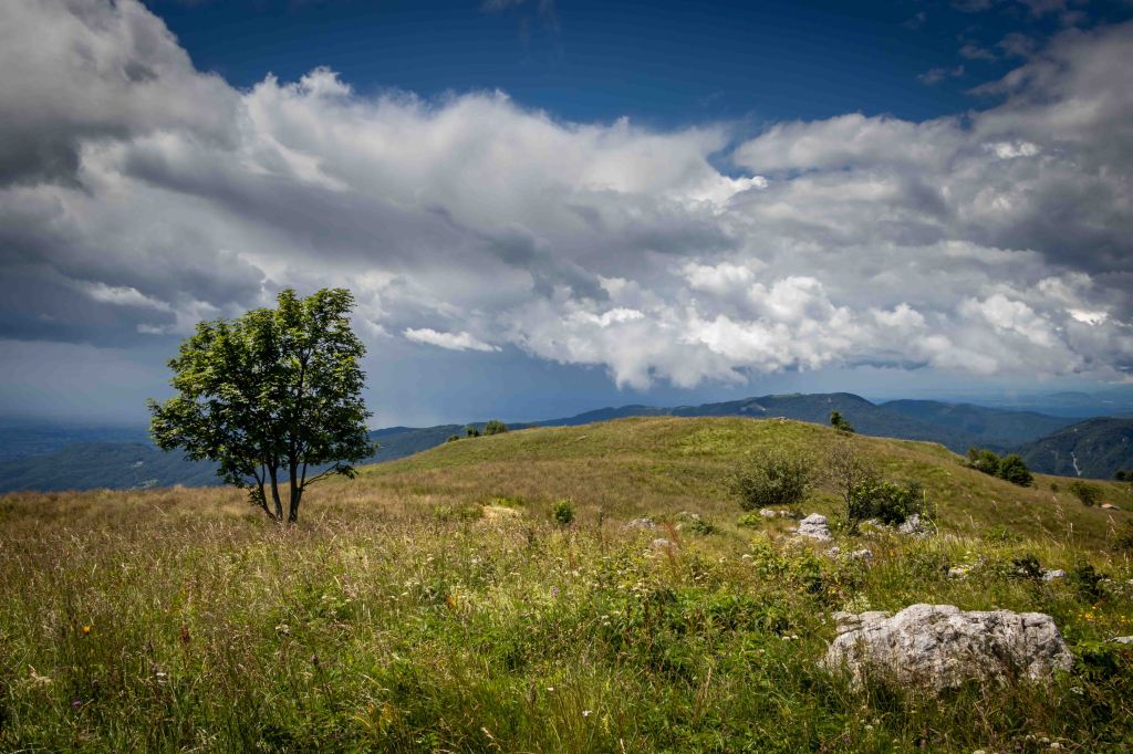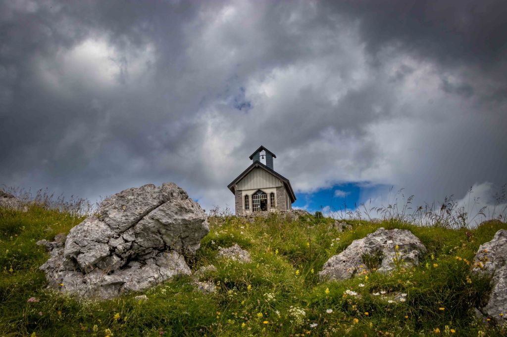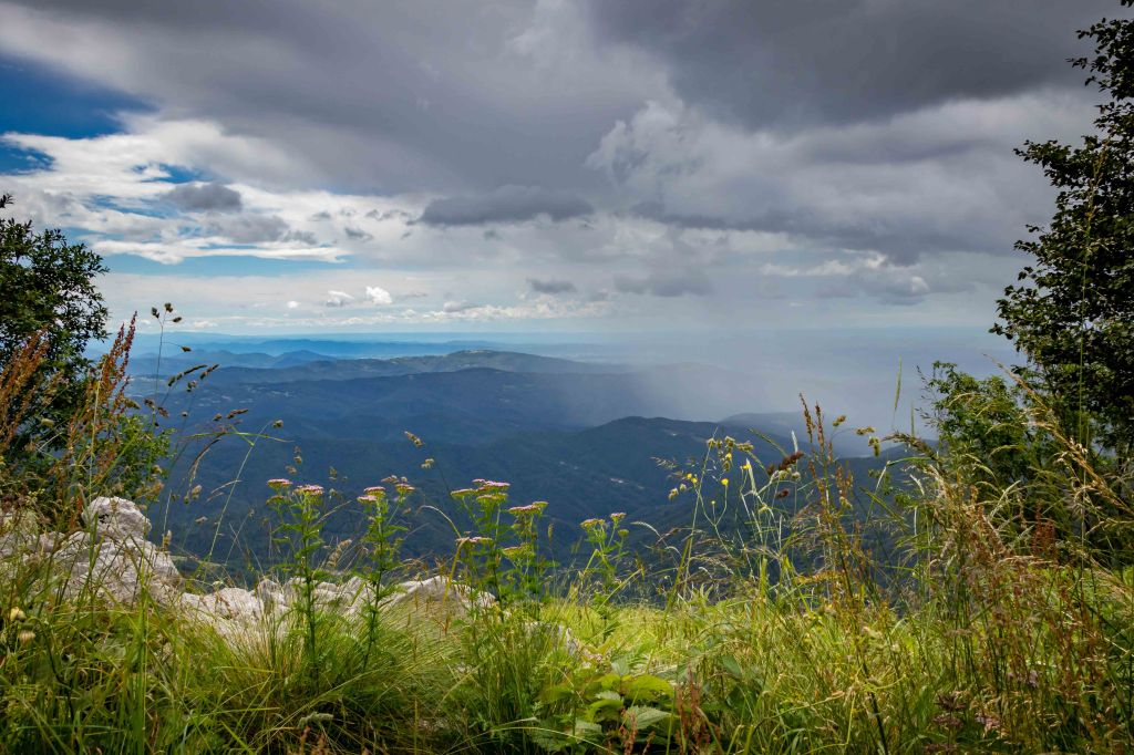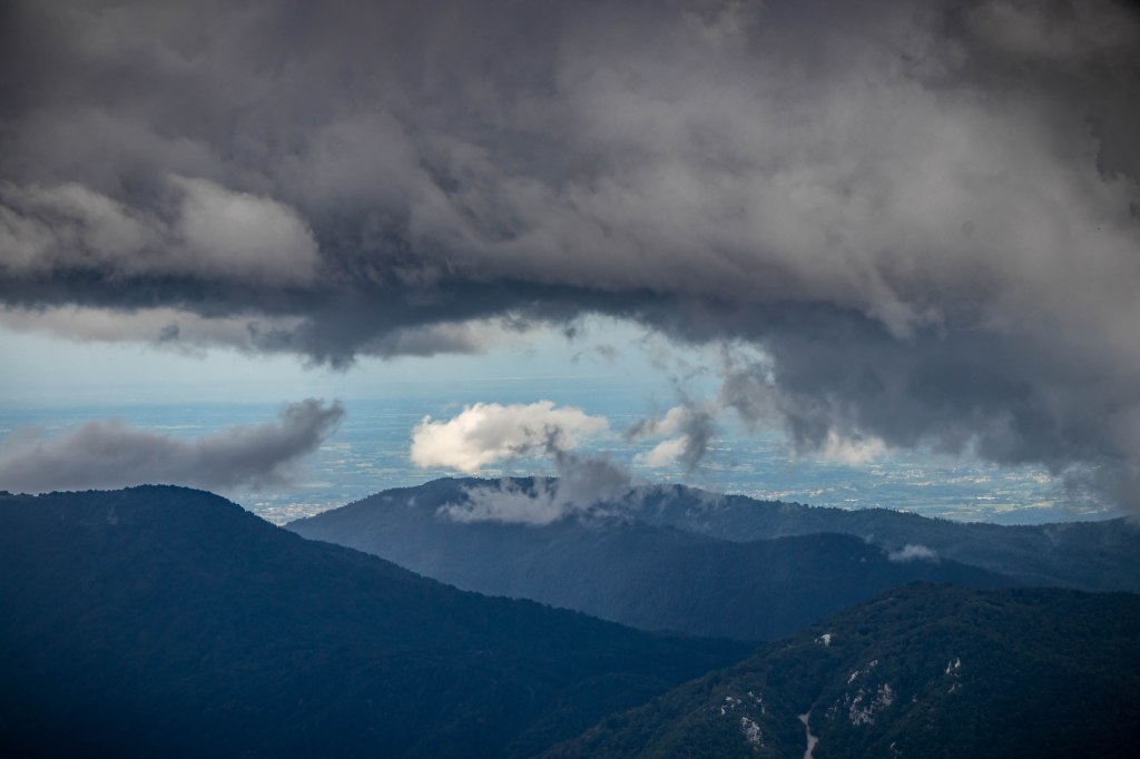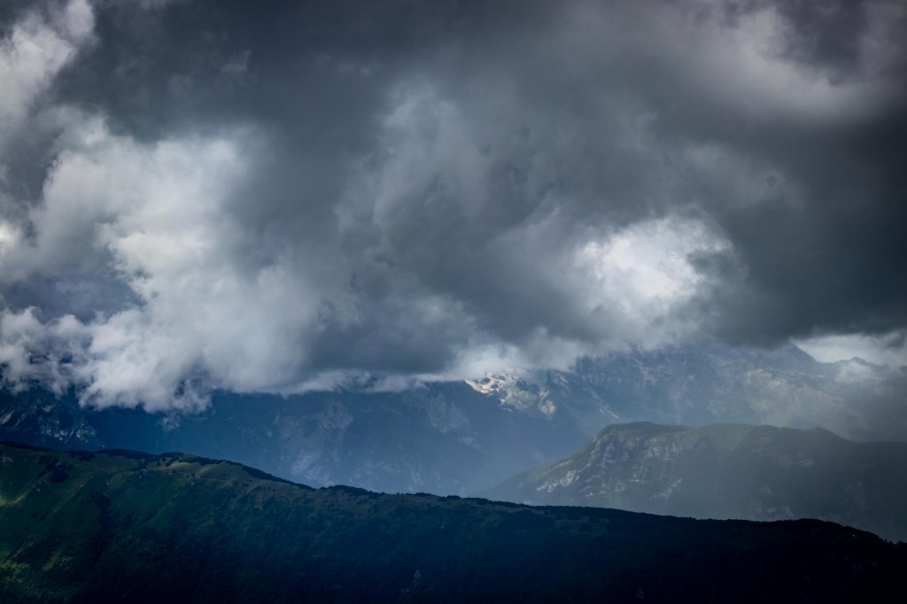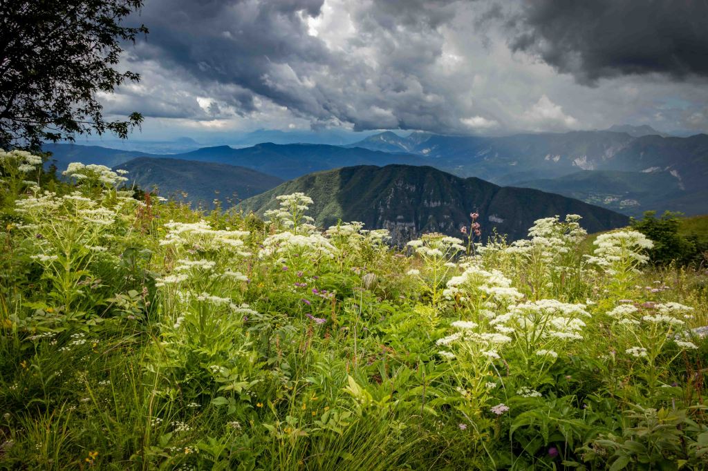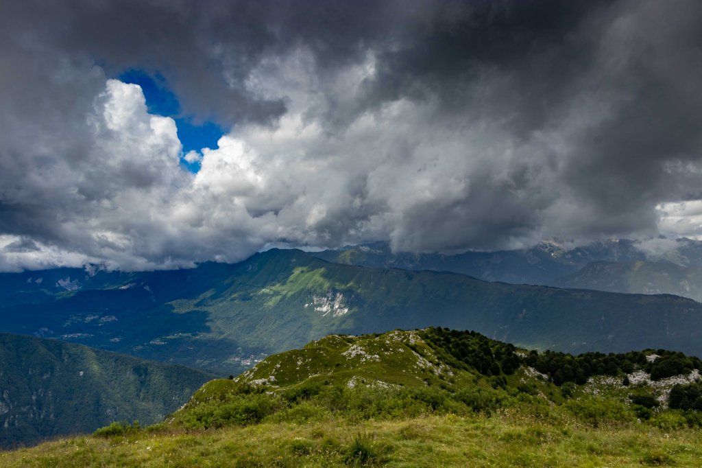 Wir fahren über CIVIDALE DE FRIULI ins ins liebliche Tal des TORRENTE ALBERONE. Bei CRISNARO / KRANJAC (wir sind hier im Grenzgebiet zu Slowenien und die Ortsbezeichnungen sind zweisprachig) streike ich, ob der engen und steilen Straße. Da packe ich lieber den Roller aus und fahre die etwas 1000 Höhenmeter hinauf zum REFUGIO ALPINO GUGLIELMO PELIZZO. Von hier laufe ich über die Wiesenhänge rund um den MONTE MATALUR, den die Italiener bereits zu den JULISCHEN ALPEN zählen, und letztendlich hinauf zur Kapelle auf dem Gipfel. So einfach der runde, gemütlich aussehende Berg zu erklimmen ist, so großartig ist die Aussicht. Rundherum hängen die dunklen Wolken tief, ab und zu ergießen sich einige Regenschauer. Ich bleibe meist in der Sonne und staune mal wieder über das Wolkentheater.