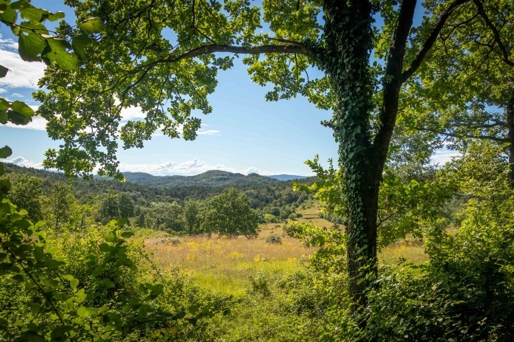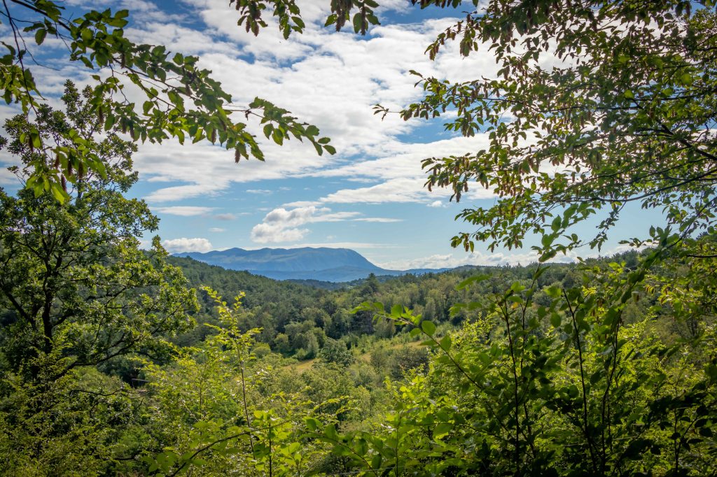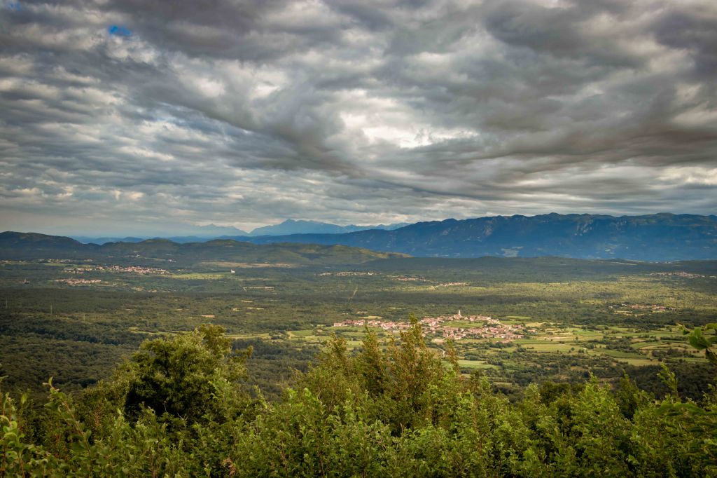Auf breiten Wegen durch den lichten Wald erreiche ich den unscheinbaren Hügel MONTE LANARO, slowenisch VOLNIK. Doch mit seinen bescheidenen 544 m bietet er eine überraschend gute Aussicht. Der Blick schweift über die kleinen Dörfer inmitten kleiner Weinfelder im slowenischen Teil des Karstes, dahinter lässt sich der TRIGLAV erahnen. An der adrianischen Küste ist das slowenische PIRAN zu sehen und die LAGUNA DI GRADO, vielleicht sogar die Industrie rund um VENEDIG. Am Rückweg verlaufe ich mich ständig, kein Wunder, dass man hier die ein oder andere Leiche verschwinden lassen kann. (Wir lesen zu viele Krimis.)