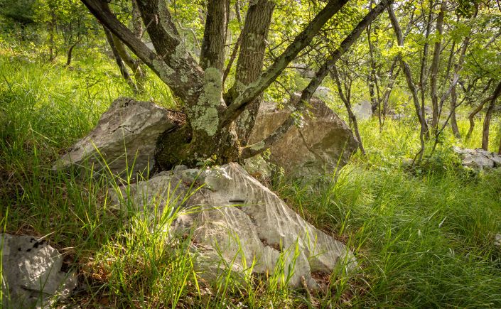 Auf breiten Wegen durch den lichten Wald erreiche ich den unscheinbaren Hügel MONTE LANARO, slowenisch VOLNIK. Doch mit seinen bescheidenen 544 m bietet er eine überraschend gute Aussicht. Der Blick schweift über die kleinen Dörfer inmitten kleiner Weinfelder im slowenischen Teil des Karstes, dahinter lässt sich der TRIGLAV erahnen. An der adrianischen Küste ist das slowenische PIRAN zu sehen und die LAGUNA DI GRADO, vielleicht sogar die Industrie rund um VENEDIG. Am Rückweg verlaufe ich mich ständig, kein Wunder, dass man hier die ein oder andere Leiche verschwinden lassen kann. (Wir lesen zu viele Krimis.)