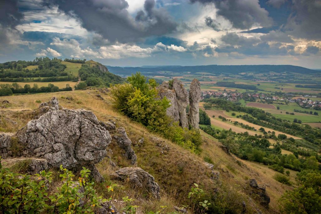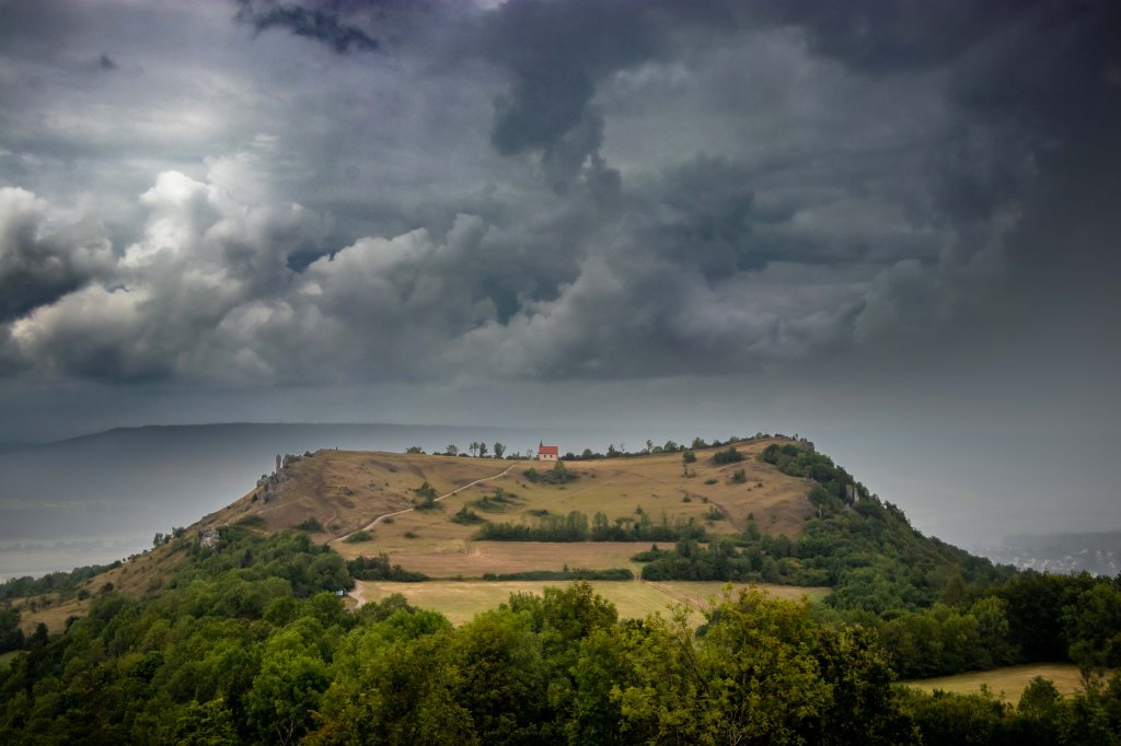 Tatsächlich ziehen einige Regenschauer über uns hinweg, doch in der feuchten Luft wird es eher noch schwüler und das Thermometer nähert sich schon wieder den 300 C. Schweißgebadet erreiche ich die kleine Hochfläche zwischen den beiden Hügeln, die mich immer an einen riesigen Parabolspiegel von Außerirdischen denken lässt. Wie viele der mystischen Orte in Franken, war der Berg bereits in der Jungsteinstein besiedelt, bei Ausgrabungen konnten 20 000 Kellergruben nachgewiesen werden. Nun ist davon nichts mehr zu sehen. Am ersten Sonntag im Mai findet zu Ehren der Heiligen Walburga das Walberlafest statt, das älteste Frühlingsfest Deutschlands.