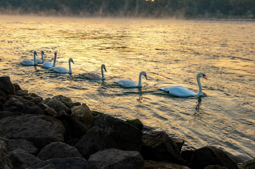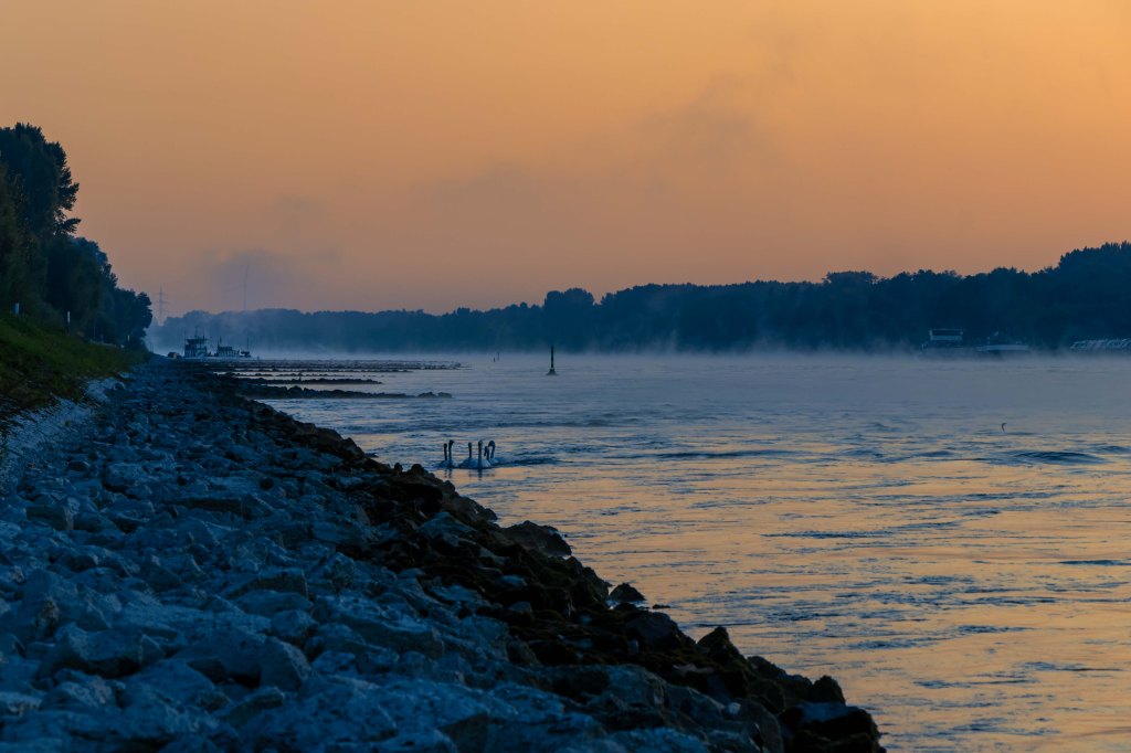 In der Morgendämmerung tuckern die ersten Schiffe vorbei. Am Morgen ist es so frisch, dass über dem Rhein leichte Nebelschwaden ziehen. Eine Schwanenfamilie zieht im ersten goldenen Sonnenlicht vorbei, eines ihrer Jungen ist noch ein hässliches Entlein.