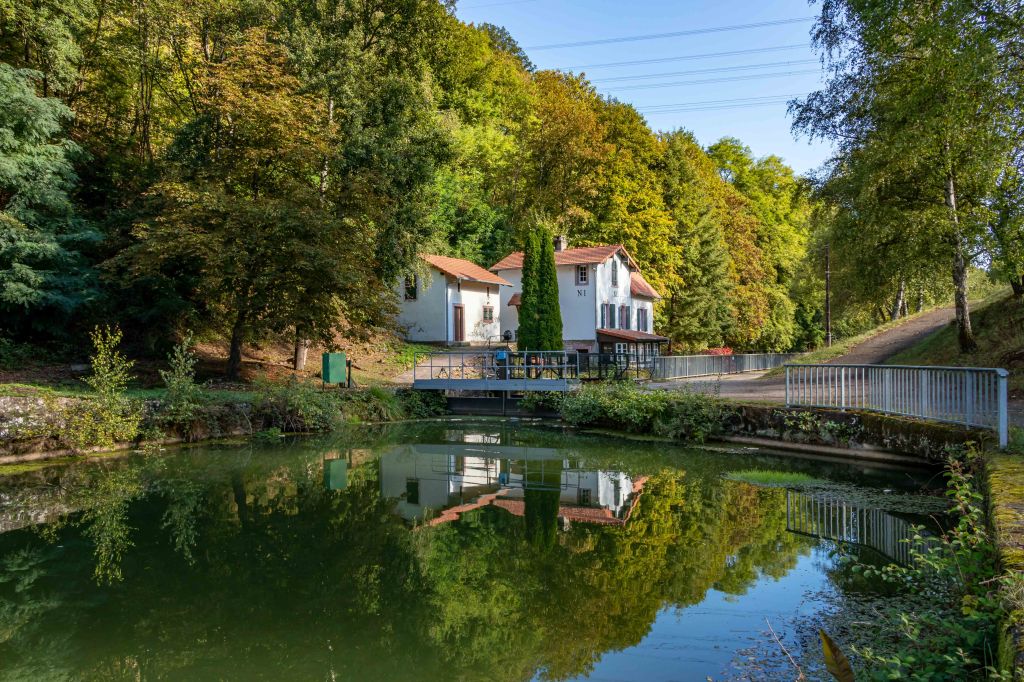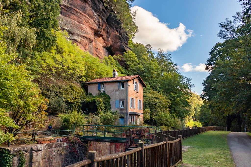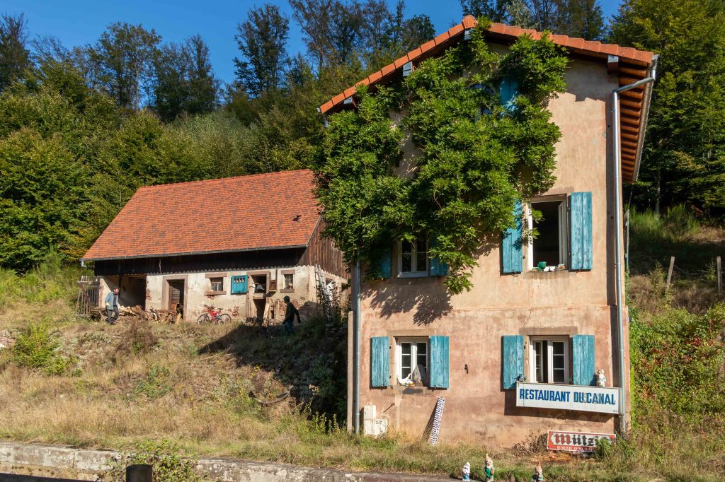Der Hinweg geht entlang des neueren Kanals, der sich eng an den steilen Hang, hoch über dem Flüsschen Ruisseau Forellenbaechel, schmiegt. Beim östlichen Tunneleingang kehre ich um, eine Charterboot wollte mich sogar mitnehmen, und wandere entlang des alten, nun trockenen, Kanalbetts zurück. An jeder der 17 Schleusen steht ein Schleusenwärterhaus, viele davon schön restauriert, manche jedoch verfallen.