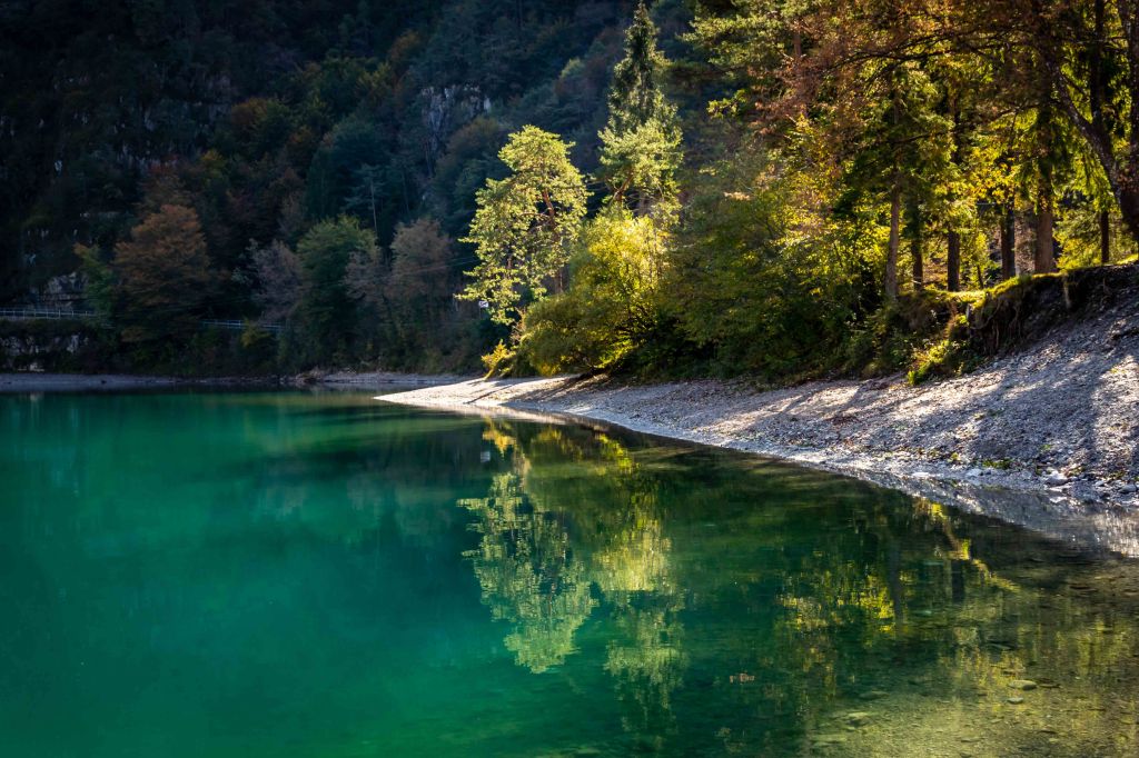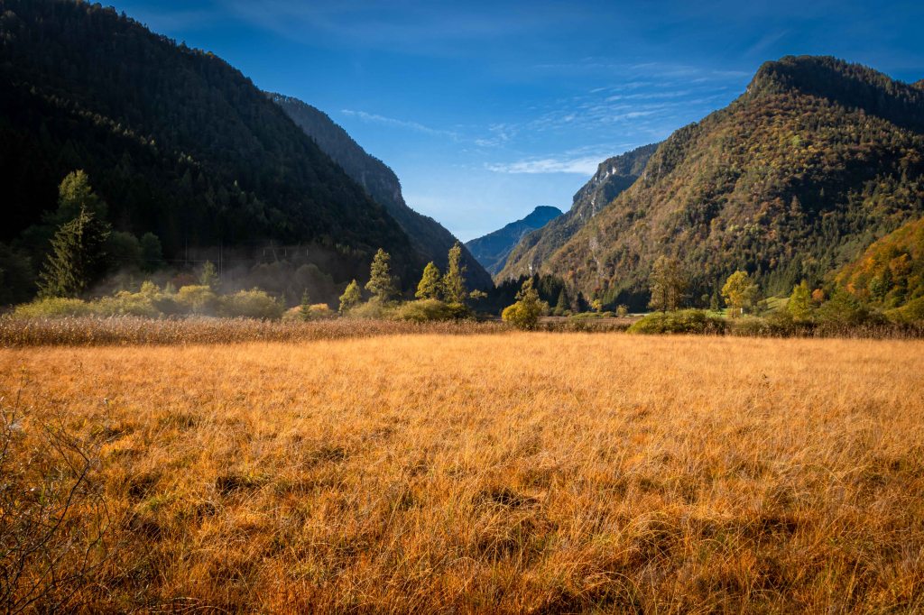 Schnee und Kälte vertreiben uns letztendlich aus der Brenta. Hier stehen wir immerhin auf 1600 m NN und am Morgen ist unser Bruno mit Raureif überzogen. Immer wenn es uns zu kalt und regnerisch wird, wollen wir weiter in den Süden fahren, dabei aber nichts überstürzen. So fahren wir gemütlich entlang der Sarca hinunter bis nach Tione di Trento und von hier hinauf zum Lago di Ledro. Ein kleines Moorgebiet liegt in der ersten Sonne, die Tautropfen an den Spinnennetzen glitzern wir tausend Diamanten. Fast direkt am beschaulichen See kommen wir zum Stehen.