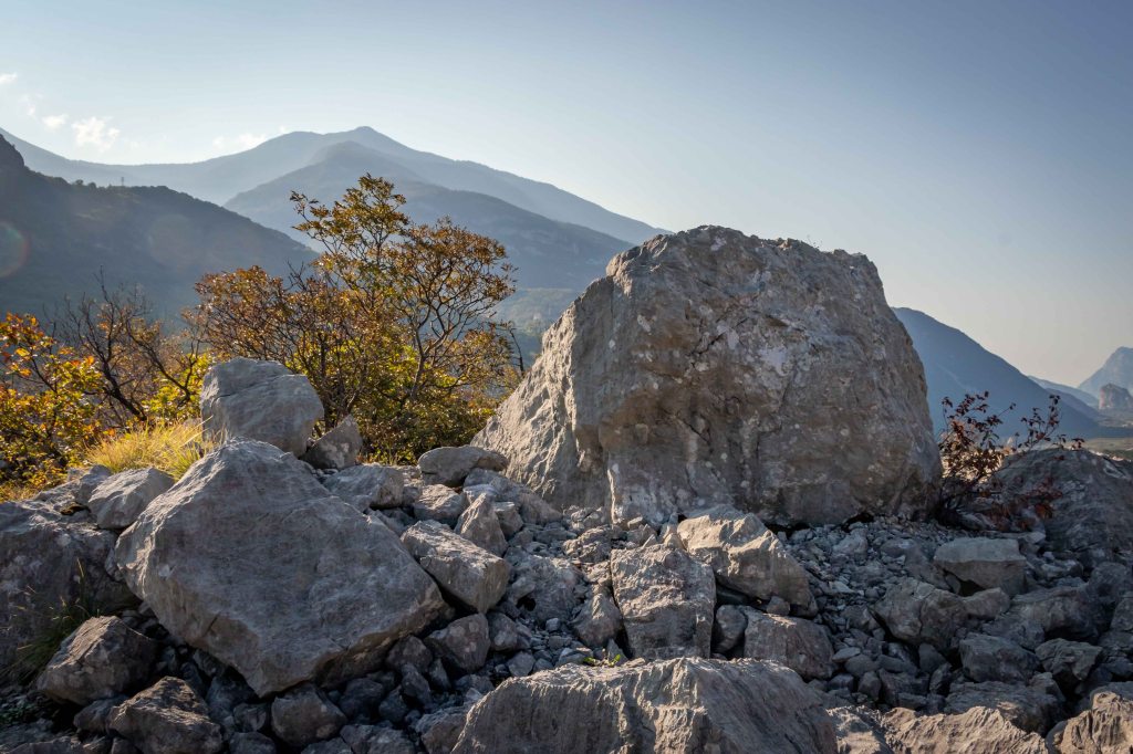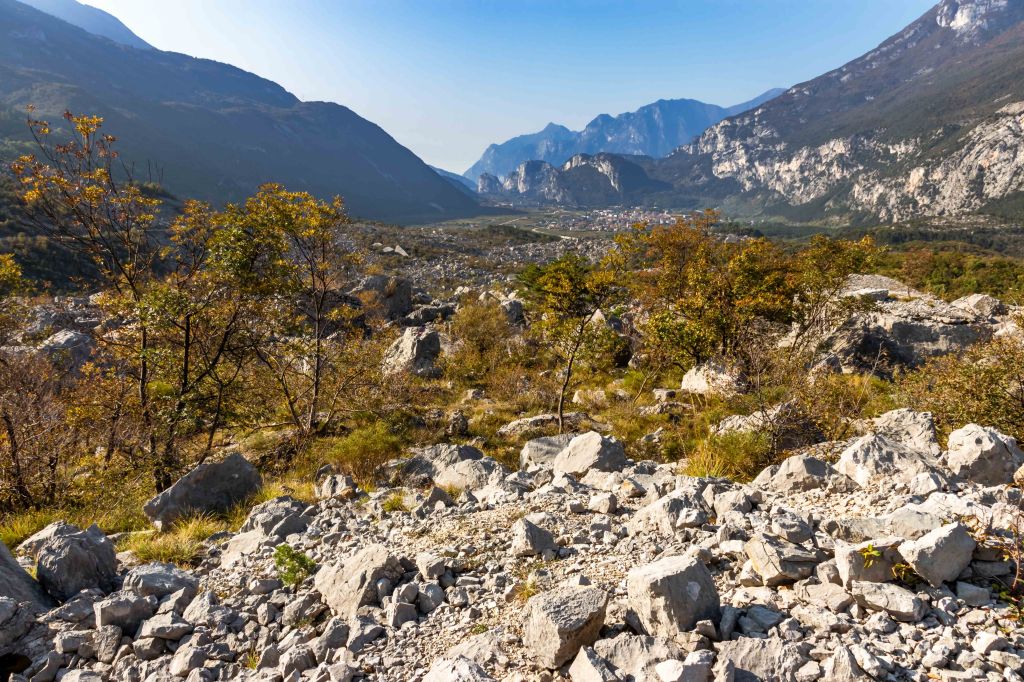Wir machen einen kleinen Abstecher zum Marocche di Dro. Hier, ein paar Kilometer nördlich des Gardasees, fand vor etwa 5000 Jahren der größte Bergsturz der Alpen statt, dessen Geröll nun 13 km2 bedeckt. Auslöser waren nicht, wie ursprünglich gedacht, die zurückgehenden Gletscher, sondern, nach neuesten Datierungen des Gesteins, wahrscheinlich Klimaschwankungen mit kälteren und feuchten Wetterperioden.