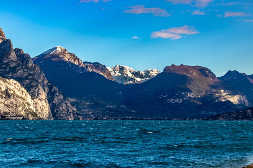 Eigentlich wollten wir die Panoramastraße hinauf zum Monte Baldo nehmen. Doch tiefhängende Wolken und der frische Schnee lassen uns lieber entlang des Gardasees fahren. Hier ist überraschend wenig Verkehr, doch die meisten Parkplätze sind mit Höhenbeschränkungen versehen. Einige Surfer und Kiter sind im strammen Bergwind auf dem See unterwegs, unser Blick geht oft zurück in die Schneeberge.