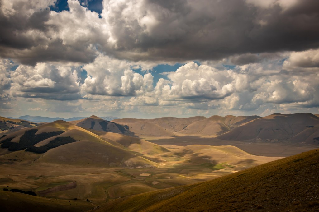 Eine der eindrucksvollsten Landschaften Italiens ist für uns die Hochfläche von CASTELLUCCIO, bekannt für seine Linsen, deren farbenprächtige Blüte nun allerdings schon lange vorbei ist. In den Wochen rund um Ferragosta sind jetzt natürlich viele Italiener unterwegs. War Peter 2016, kurz nach dem ersten heftigen Erdbeben, mit zwei Italienern, davon ein Geologe, unterwegs zu den je höchsten Bergen der Marken und von Umbrien, sind es nun hunderte Wanderer. Die Parkplätze sind mit PKW und Wohnmobilen überfüllt, doch wir finden etwas abseits einen lauschigen Platz fast nur für uns allein.
