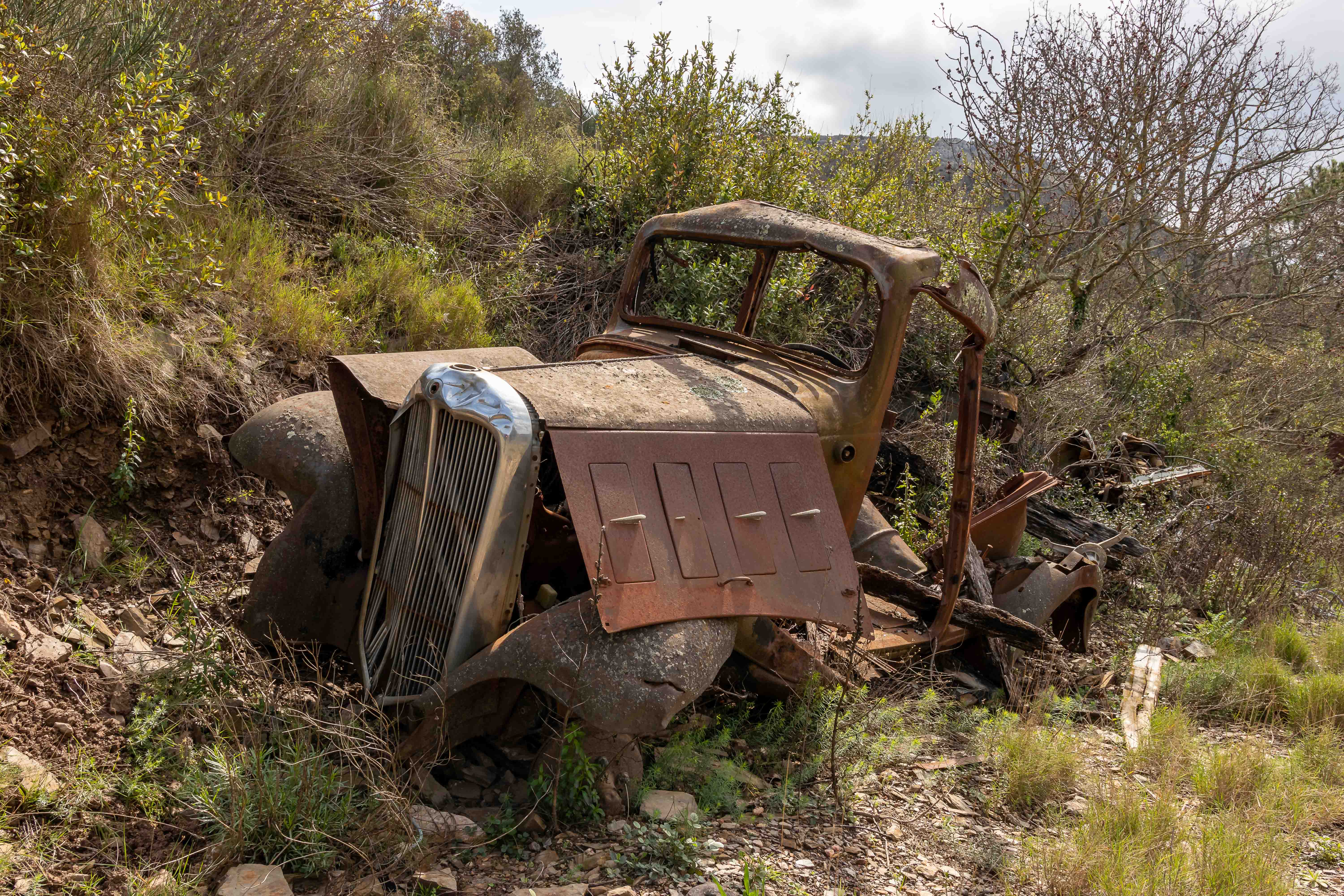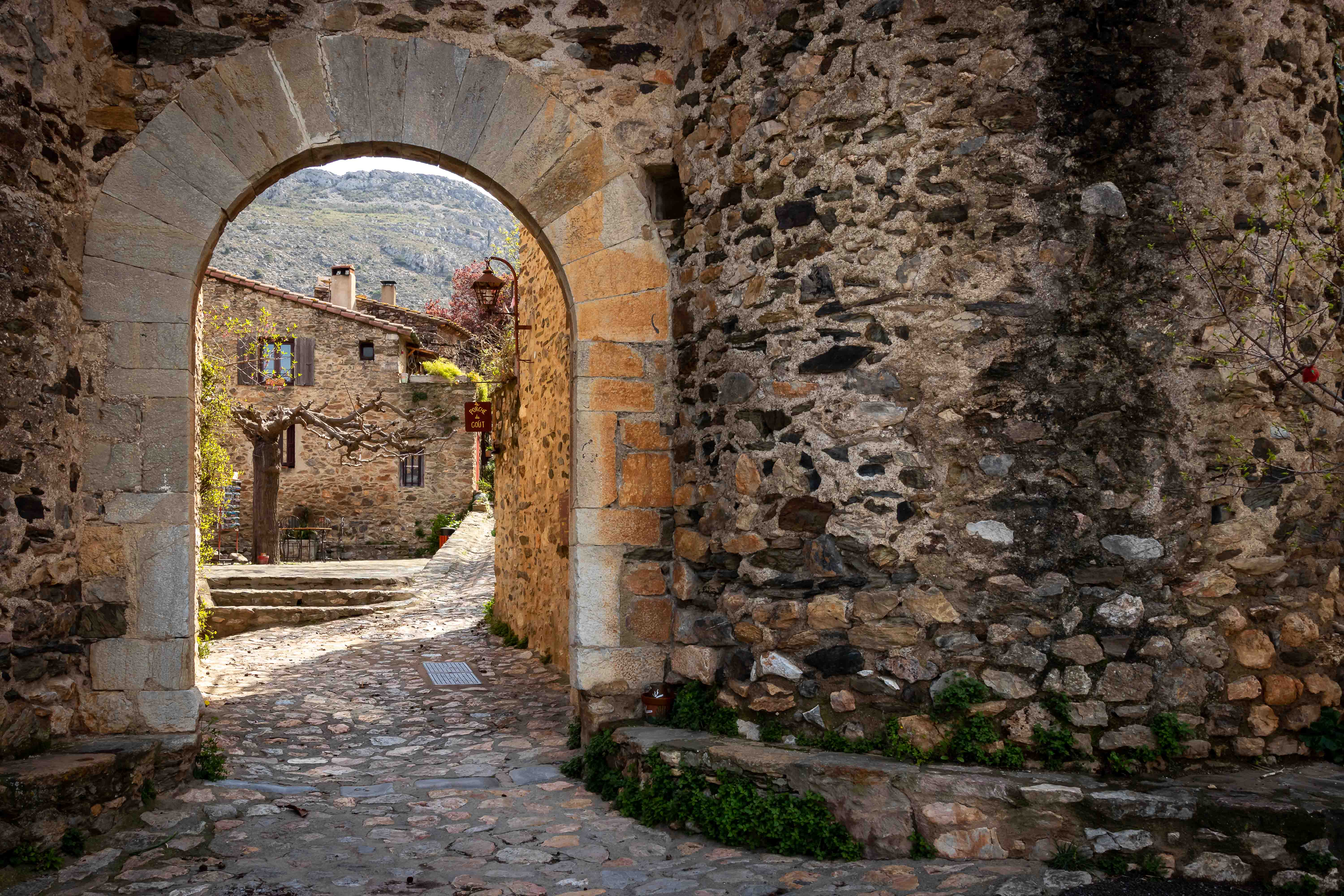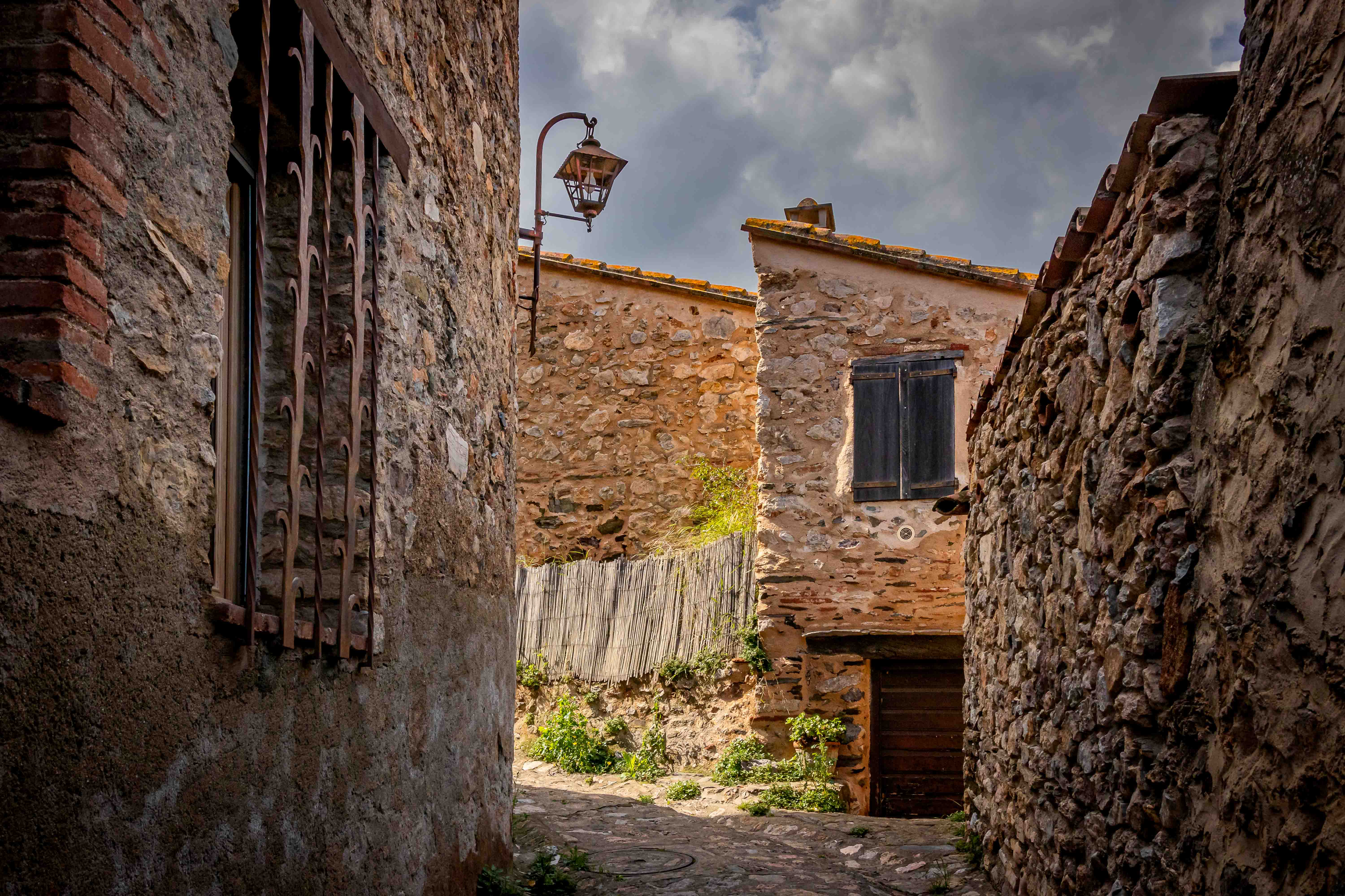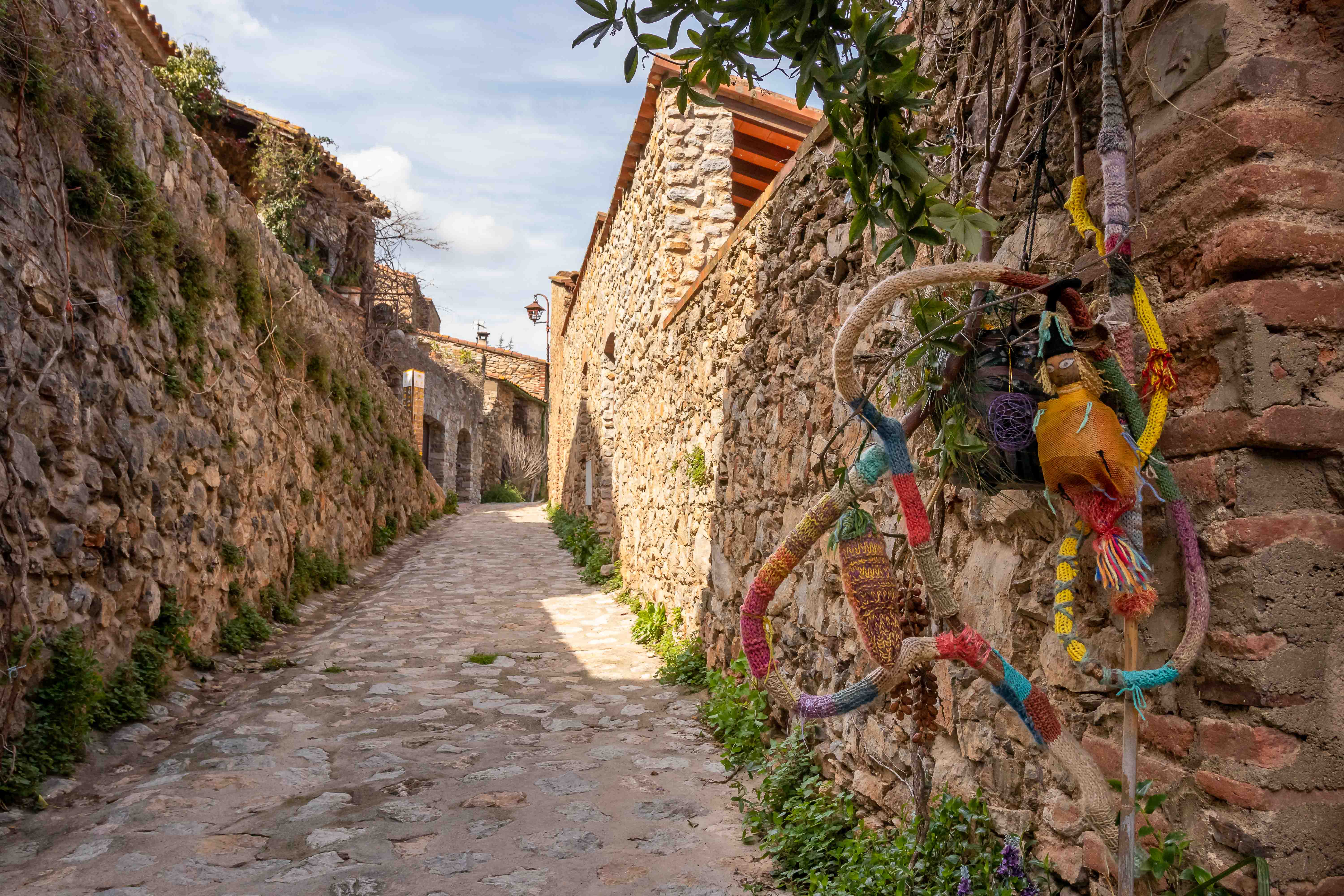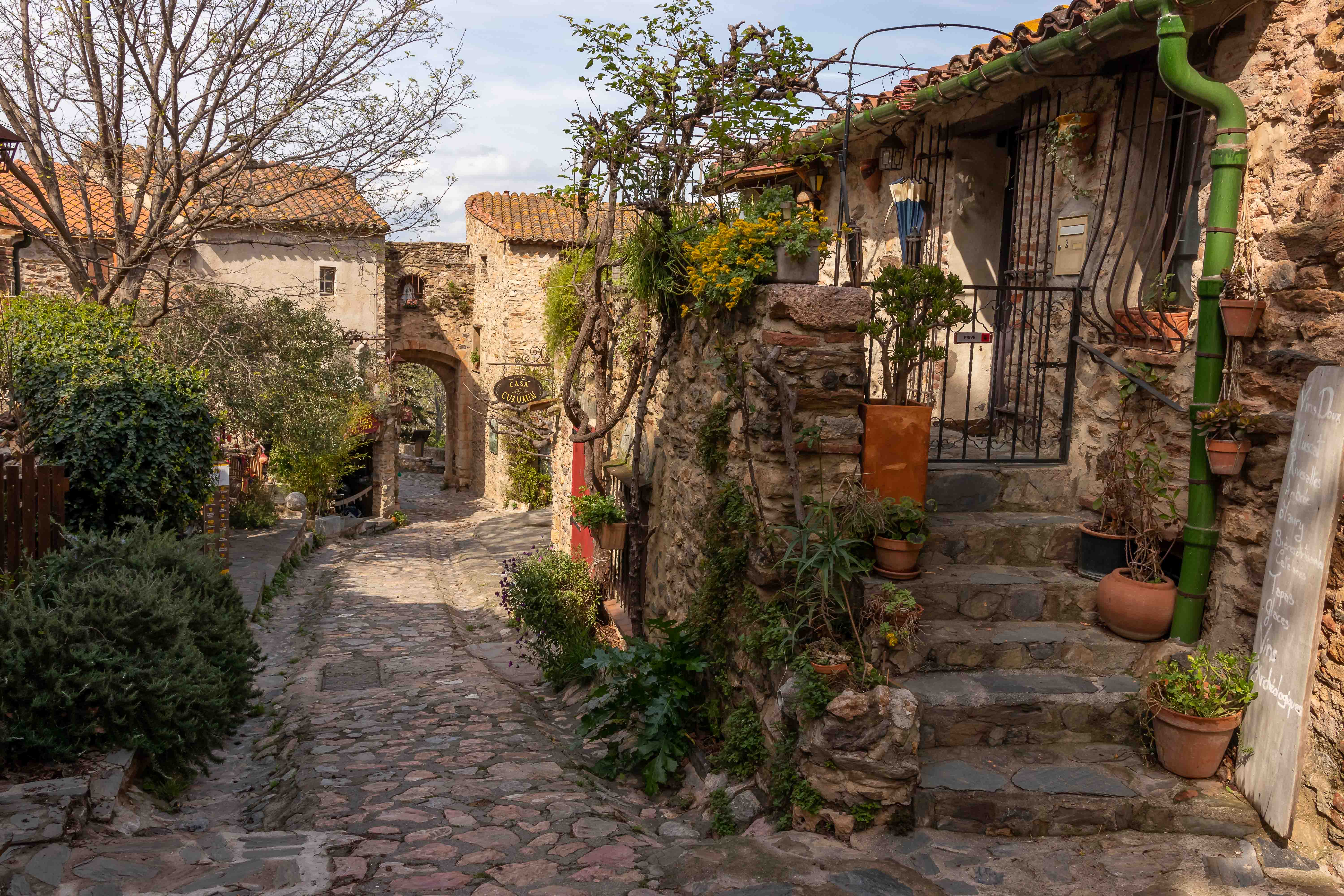 Wie ersehnt, die Pyrenäen halten die Wolken ab und in Frankreich begrüßt uns die Sonne von einem ungetrübten blauen Himmel. Wir hoffen, abseits der Küste, einsame Stellplätze in der Natur zu finden. In Castelnou werden wir fündig. Kurz vor der Ortschaft finden wir einen aussichtsreichen Parkplatz. Castelnou, bereits 1065 das erste mal erwähnt, ist wieder einer der französischen Bilderbuchdörfer, wunderbar restauriert, aber jetzt in der Nebensaison einsam und verlassen. Nur ein Souvenirladen hat geöffnet.
