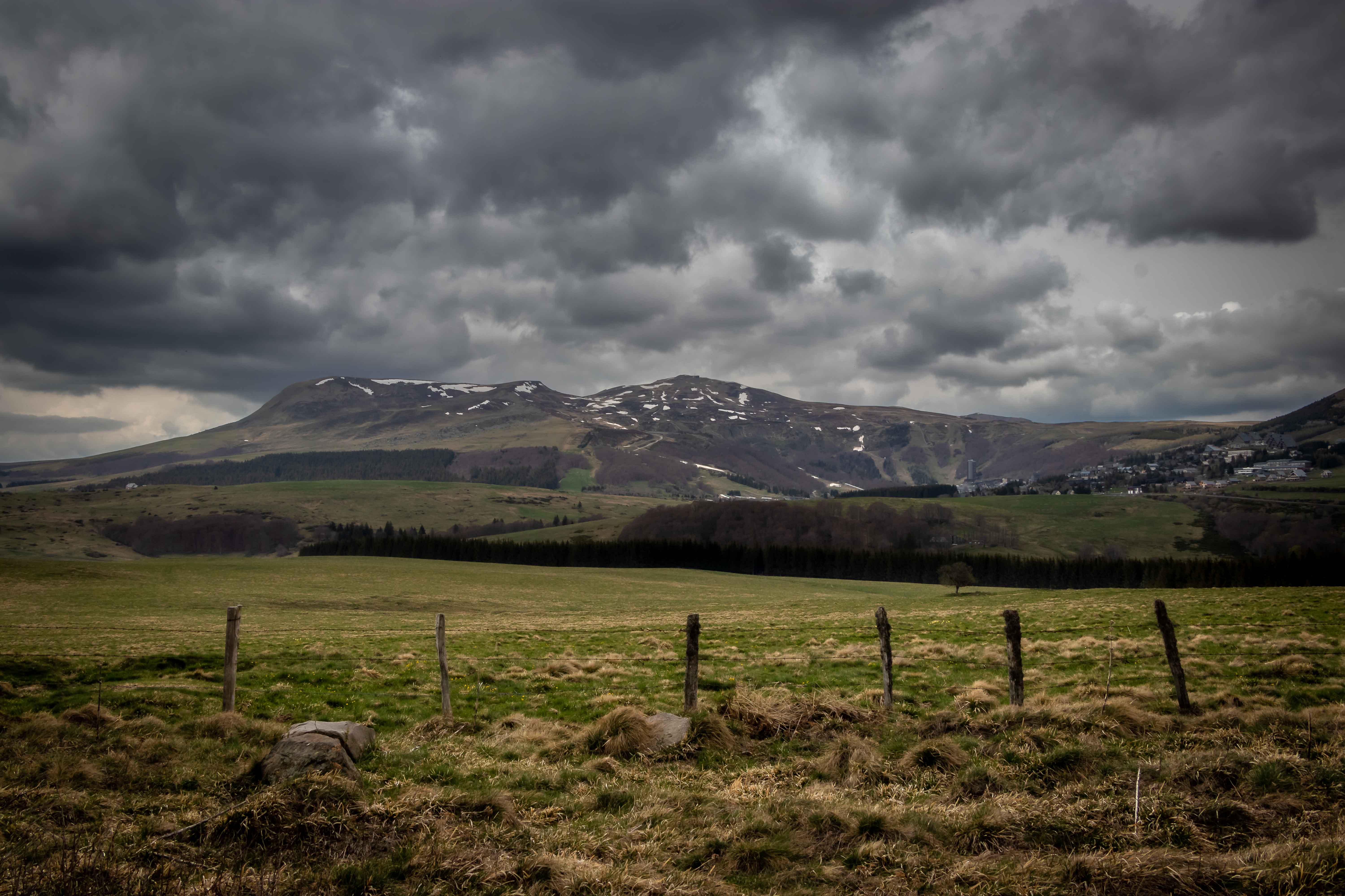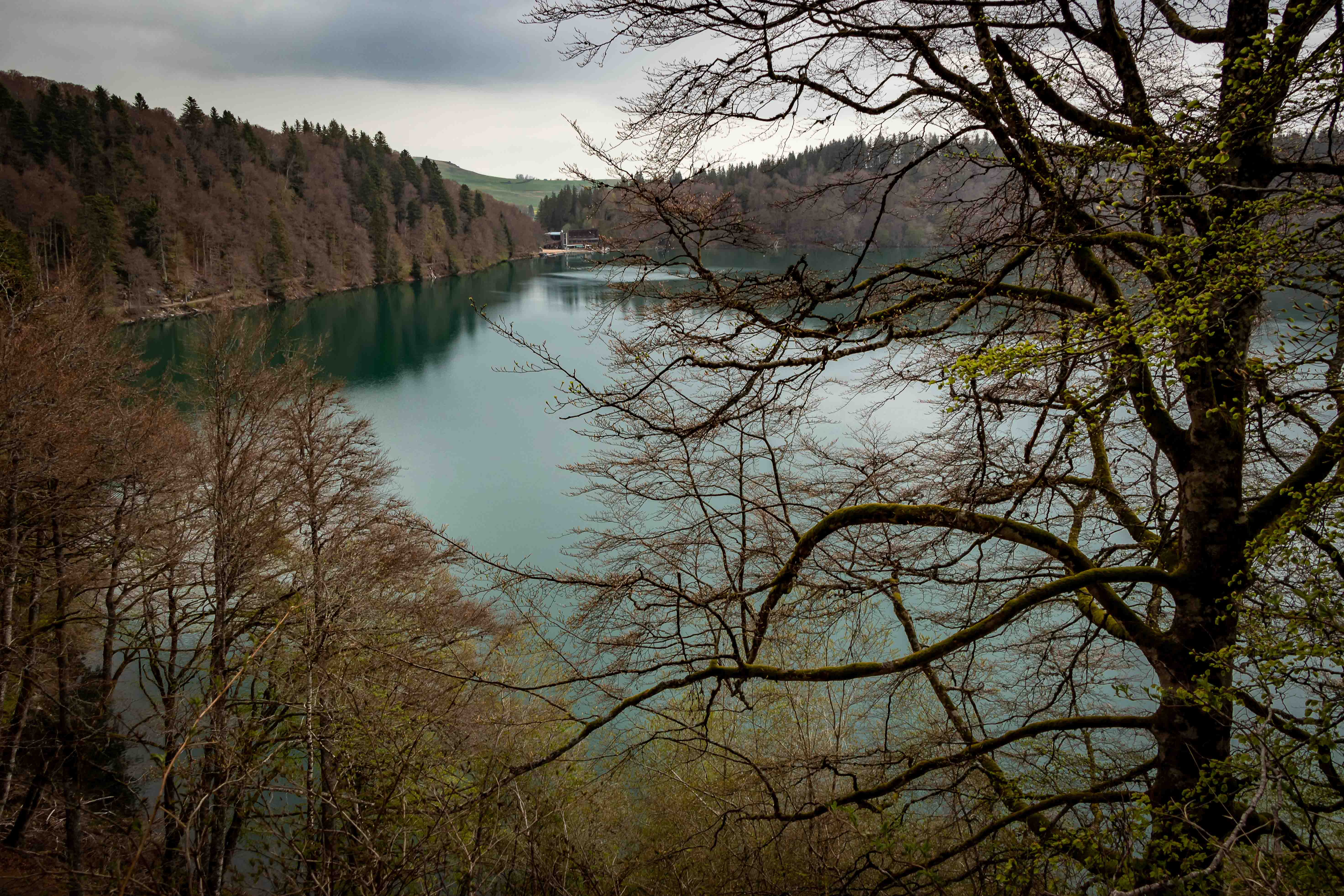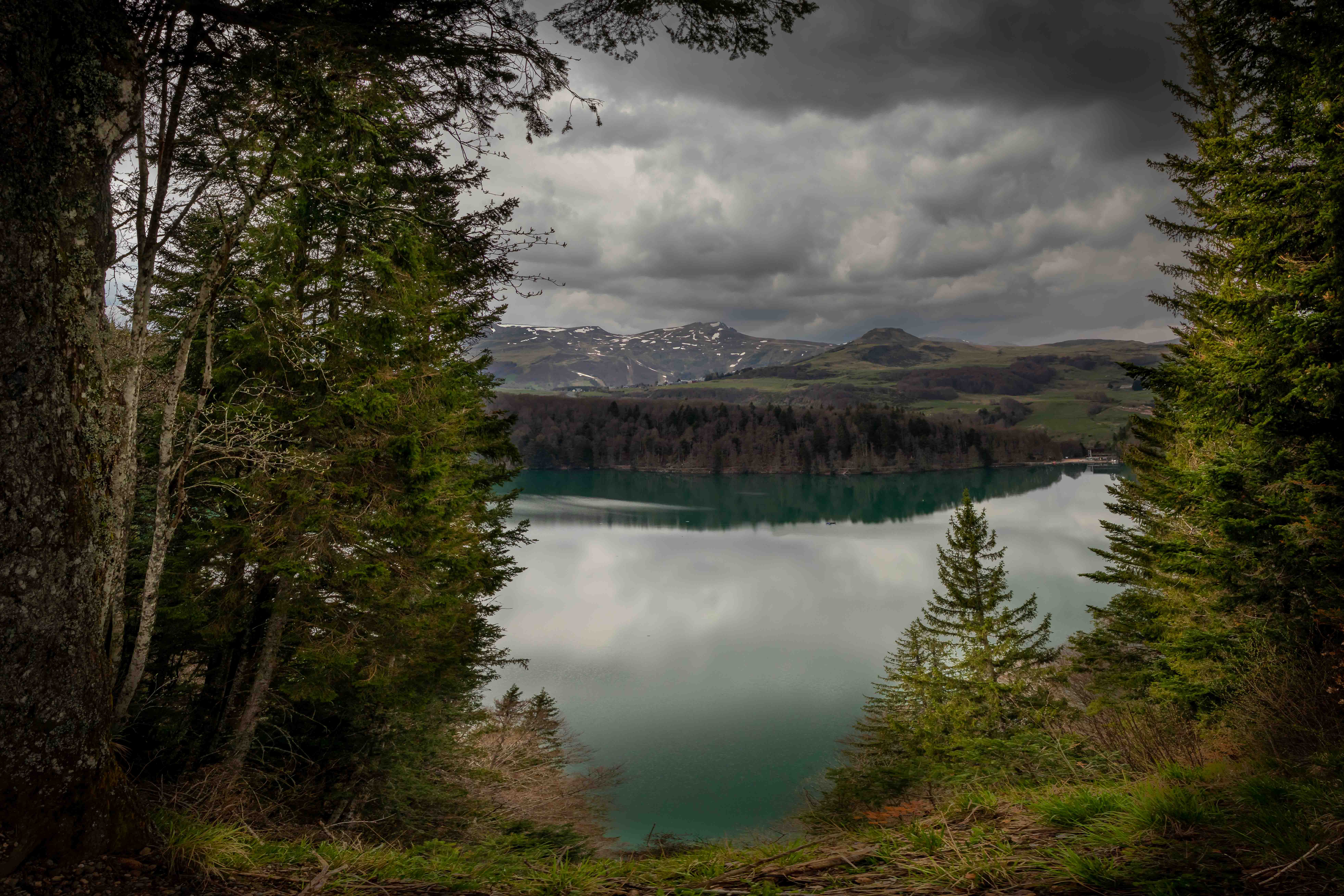 Eigentlich wollten wir noch im CANTAL-MASSIV bleiben, doch die dunklen Wolken hängen tief und zum Wanderparkplatz beim PUY MARY dürfen wir nicht fahren. So verlassen wir den riesigen Vulkan durch eines der vielen, durch die Gletscher ausgehobelten, Täler und kommen zum MASSIF DU SANCY, an dessen Fuße wir einen weiten Parkplatz finden. Von hier geht ein Wanderweg über den erloschen Vulkan PUY DE MONICHAL zum Kratersee LAC PAVIN. Dieser entstand erst von 6000 Jahren und ist bis zu 92 Meter tief. Am Rückweg beginnt es zu donnern und zu regnen, ganz entgegen der Wettervorhersage. Bestimmt hat jemand einen Stein ins Wasser des Sees geworfen, denn der Legende zufolge löst dies ein Unwetter aus.