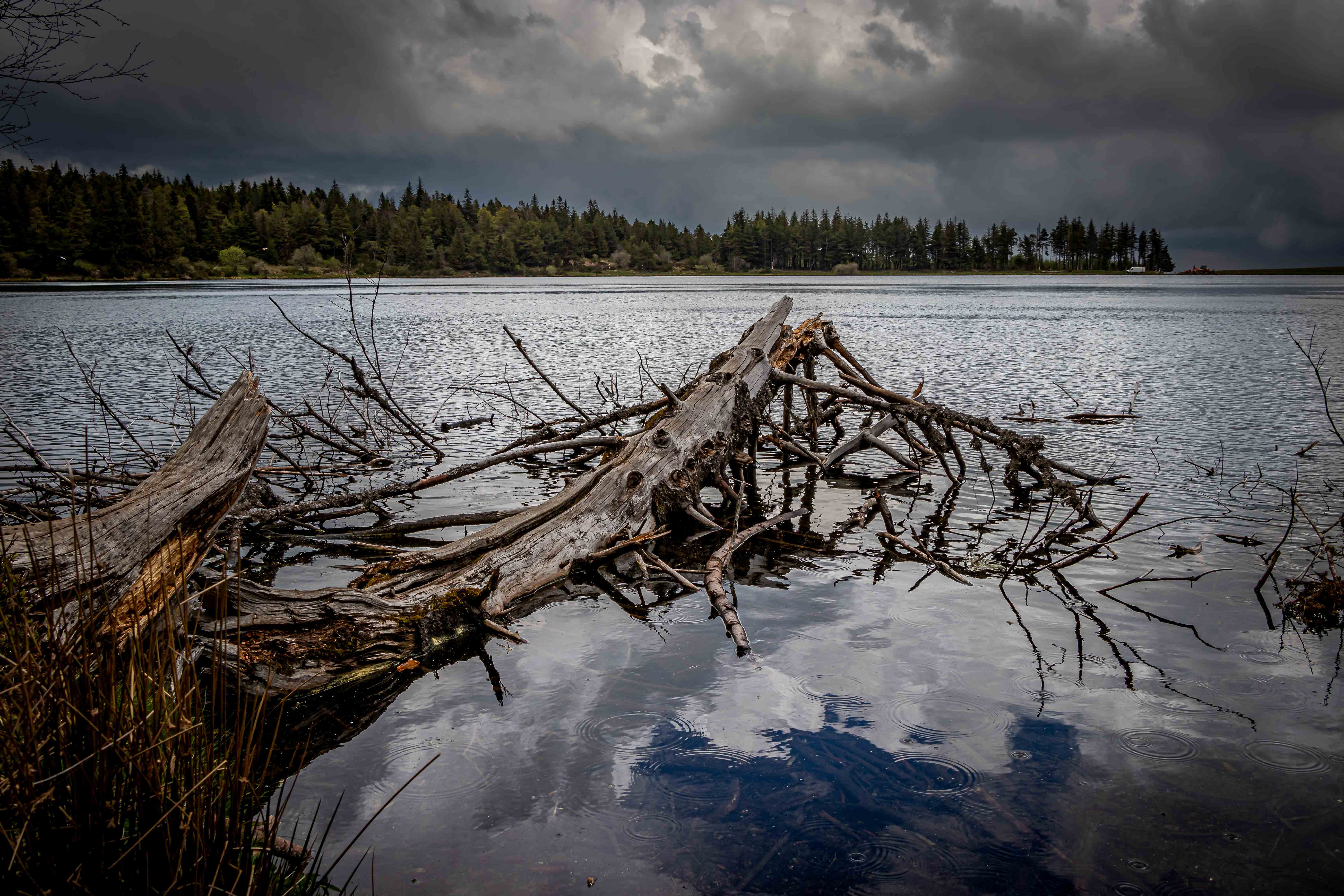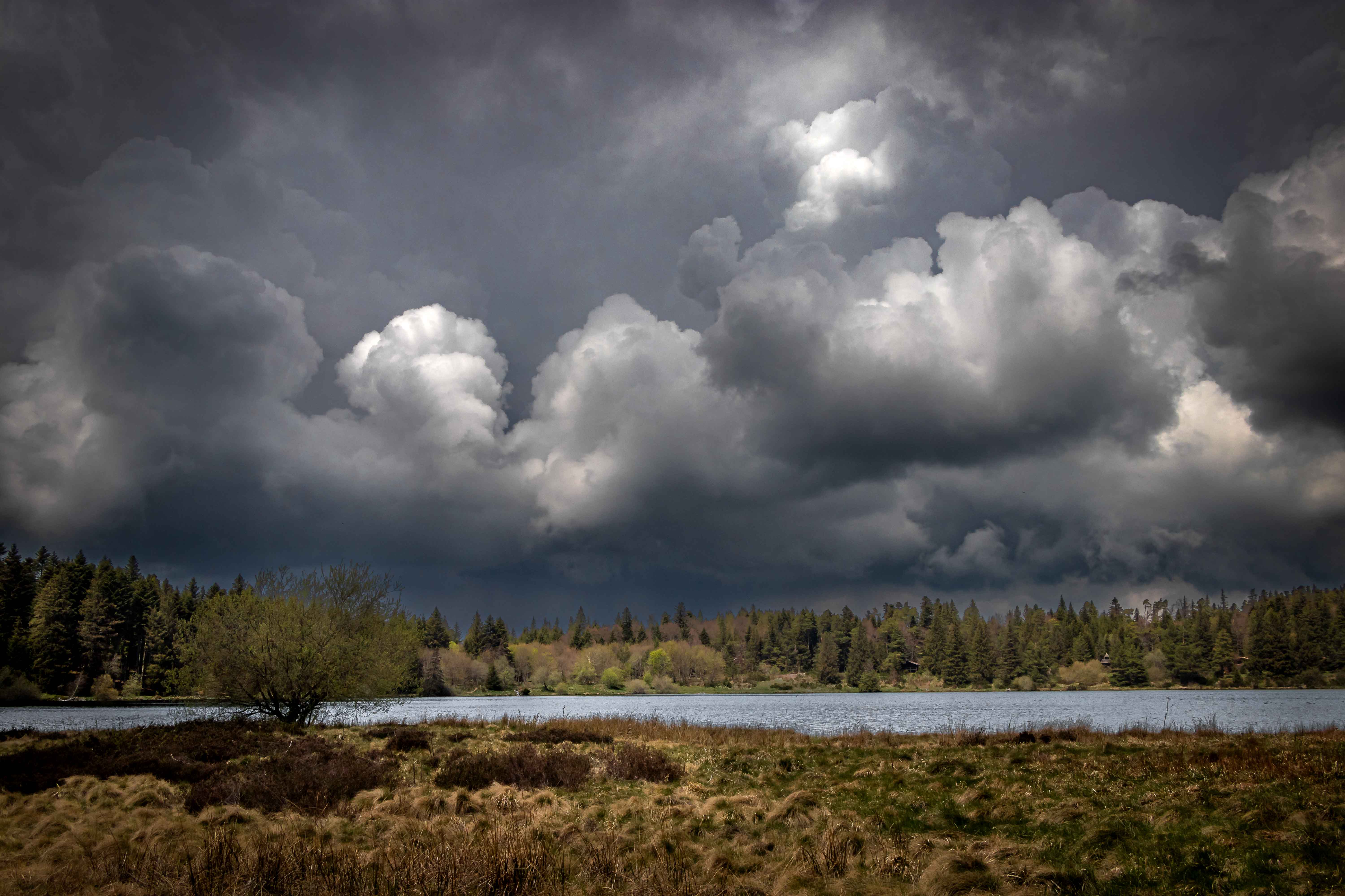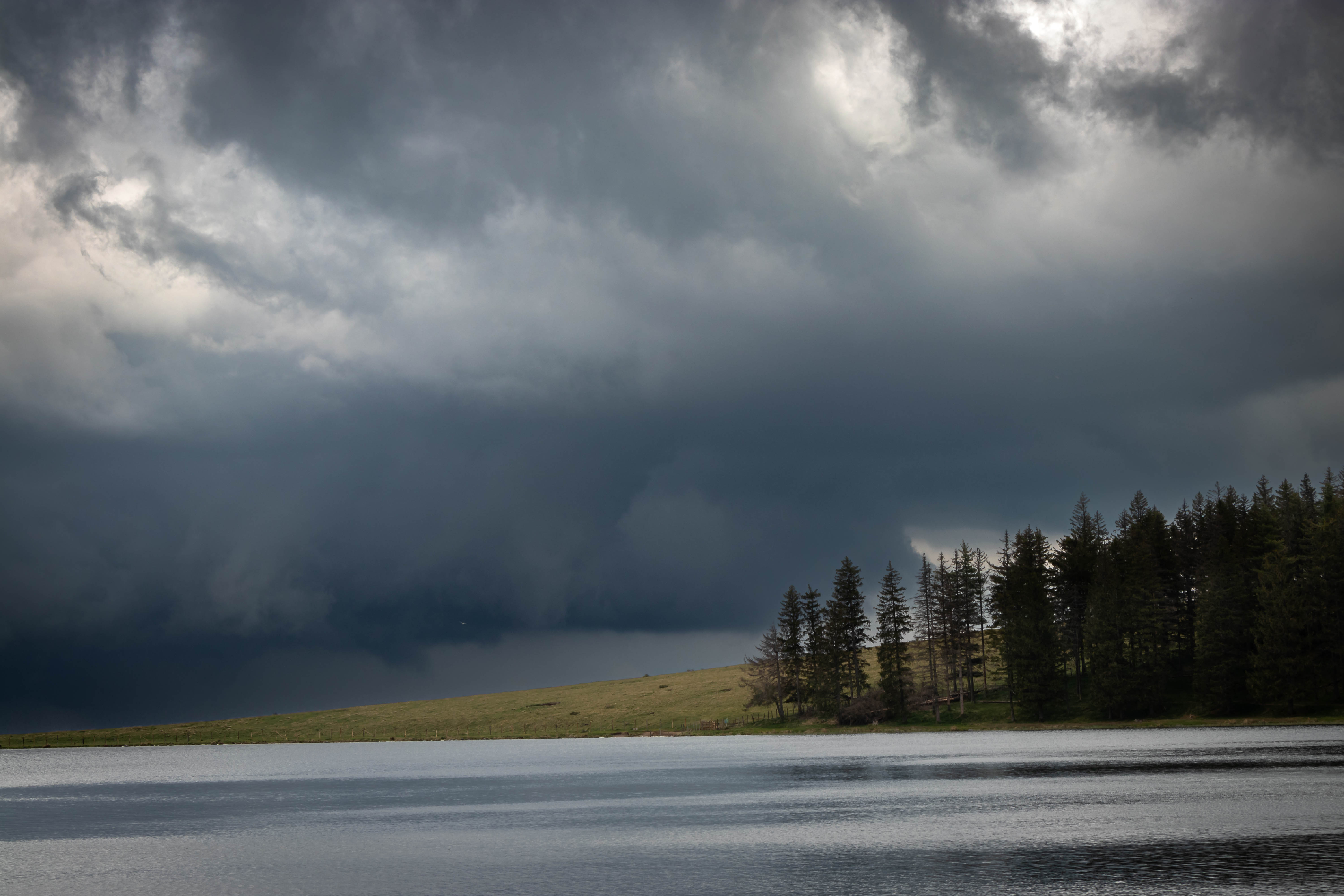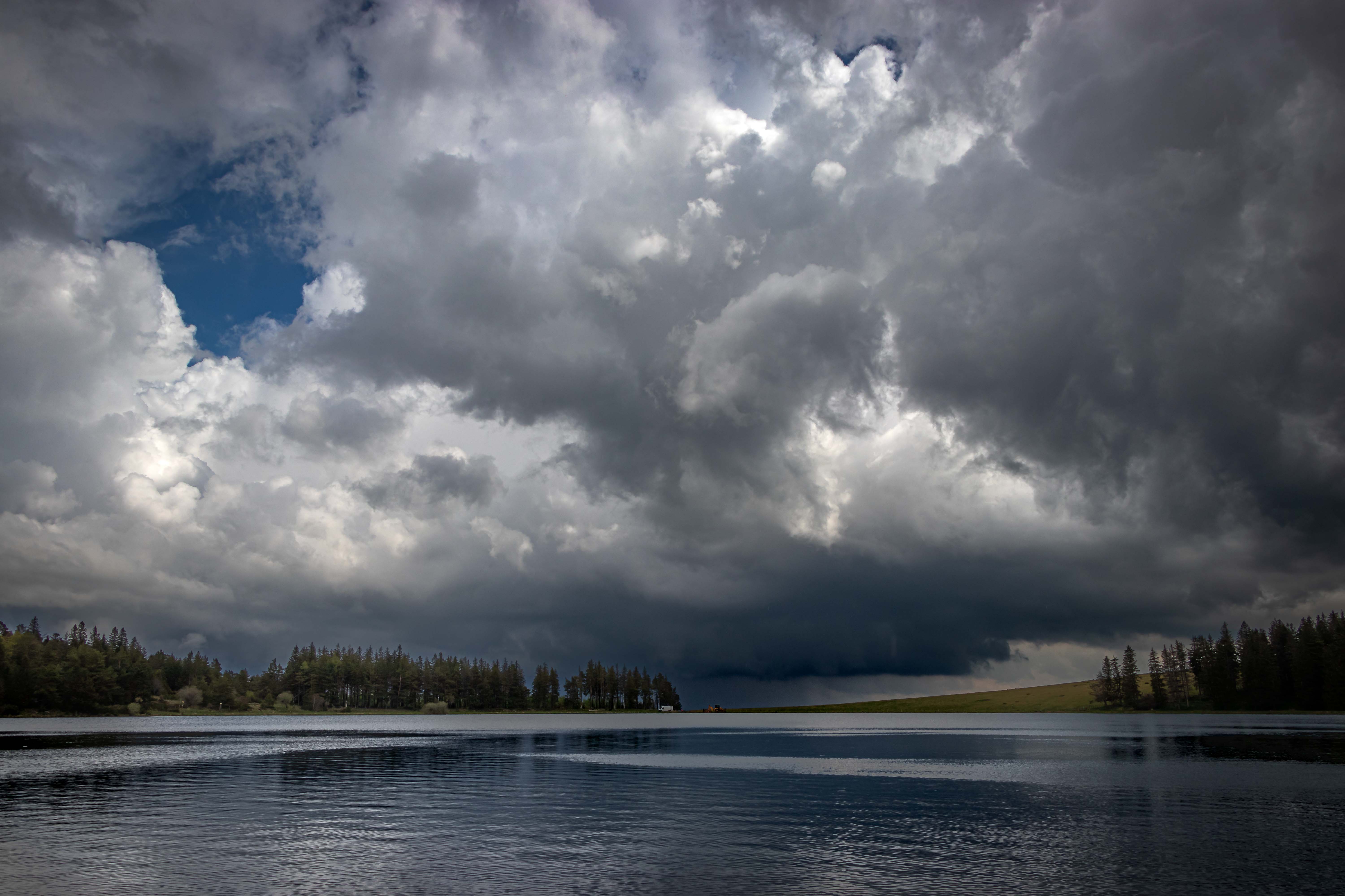 In der Nähe des Lac de Servière finden wir mitten im Nirgendwo einen Wanderparkplatz. Zum kreisrunden und einsam gelegenen Kratersee sind es nur ein paar Minuten zu Laufen. Immer dunkler und bedrohlicher steigen die Wolken in den noch blauen Himmel. Kaum zurück bei unserem Bruno bricht das Unwetter über uns herein: Blitz und Donner in unmittelbarer Nähe, Starkregen und kirschkerngroße Hagelkörner prasseln auf das Dach und die großen Dachfenster, unwillkürlich ziehen wir den Nacken ein. In der Nacht beruhigt sich Petrus wieder und am Morgen gelingt es der Sonne wieder, die ersten Lücken in der schwarzen Wolkendecke zu finden.