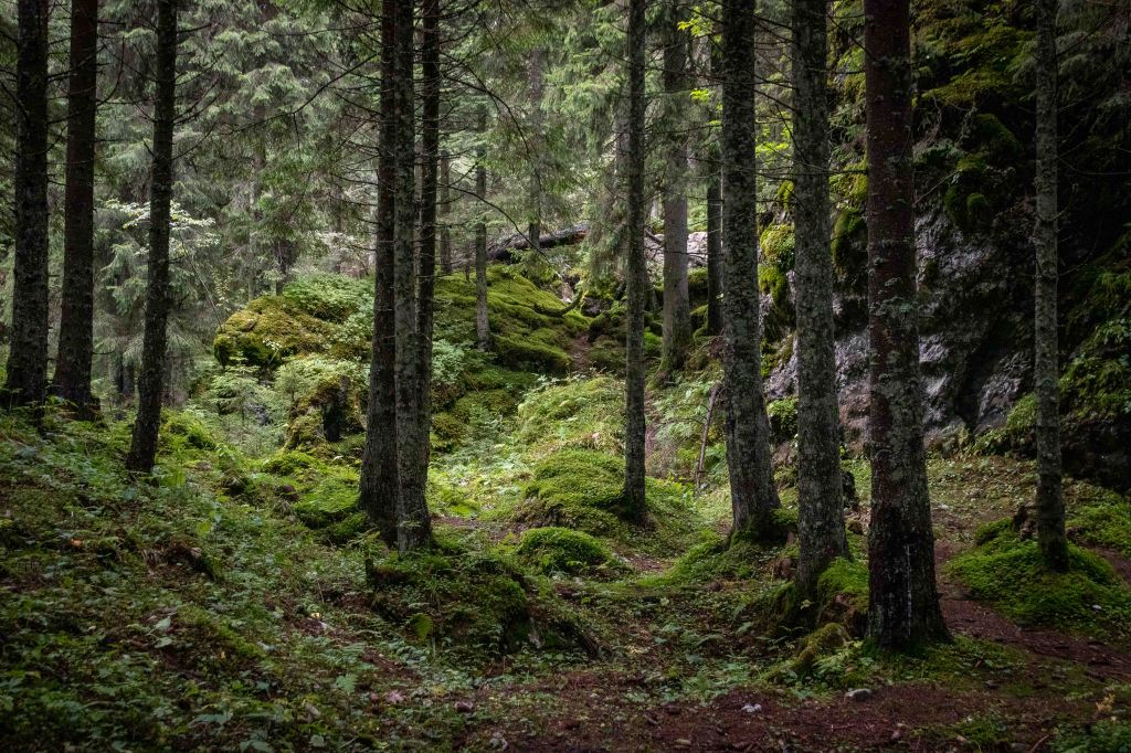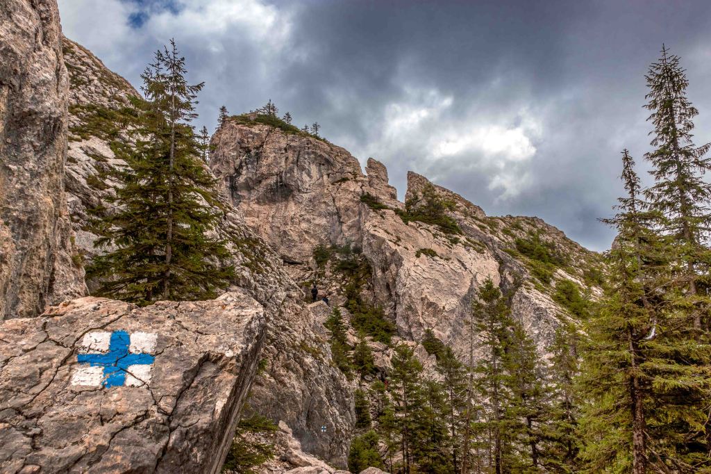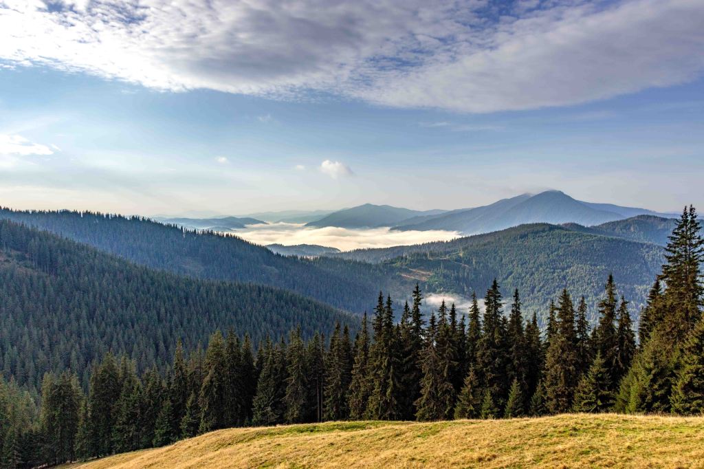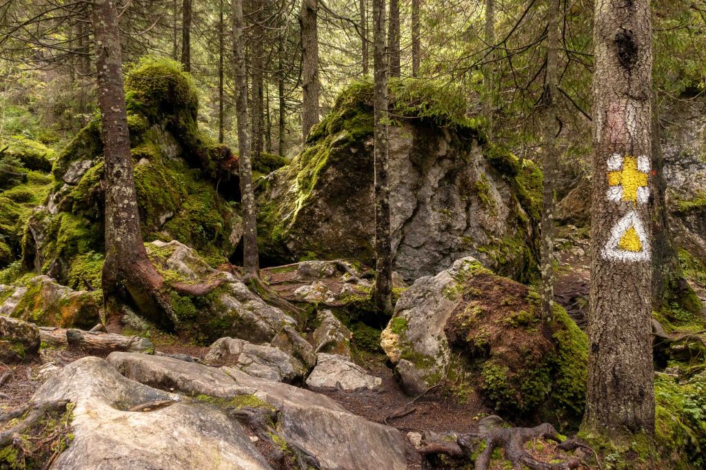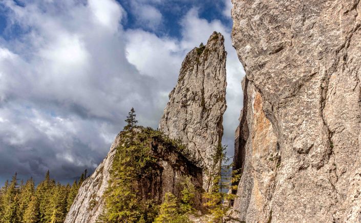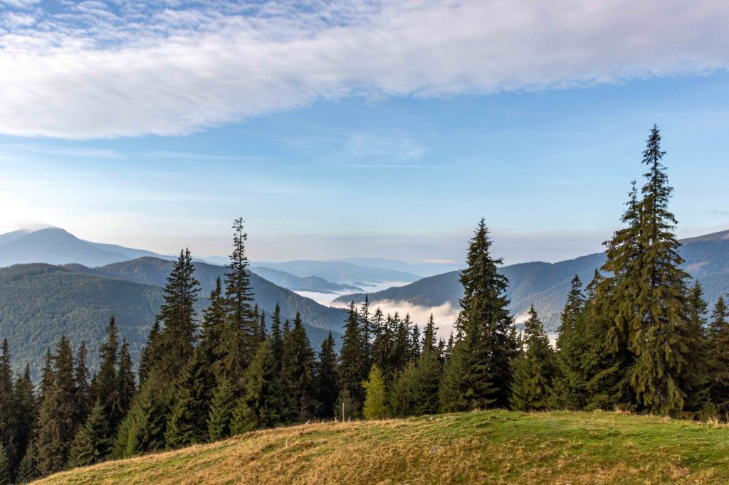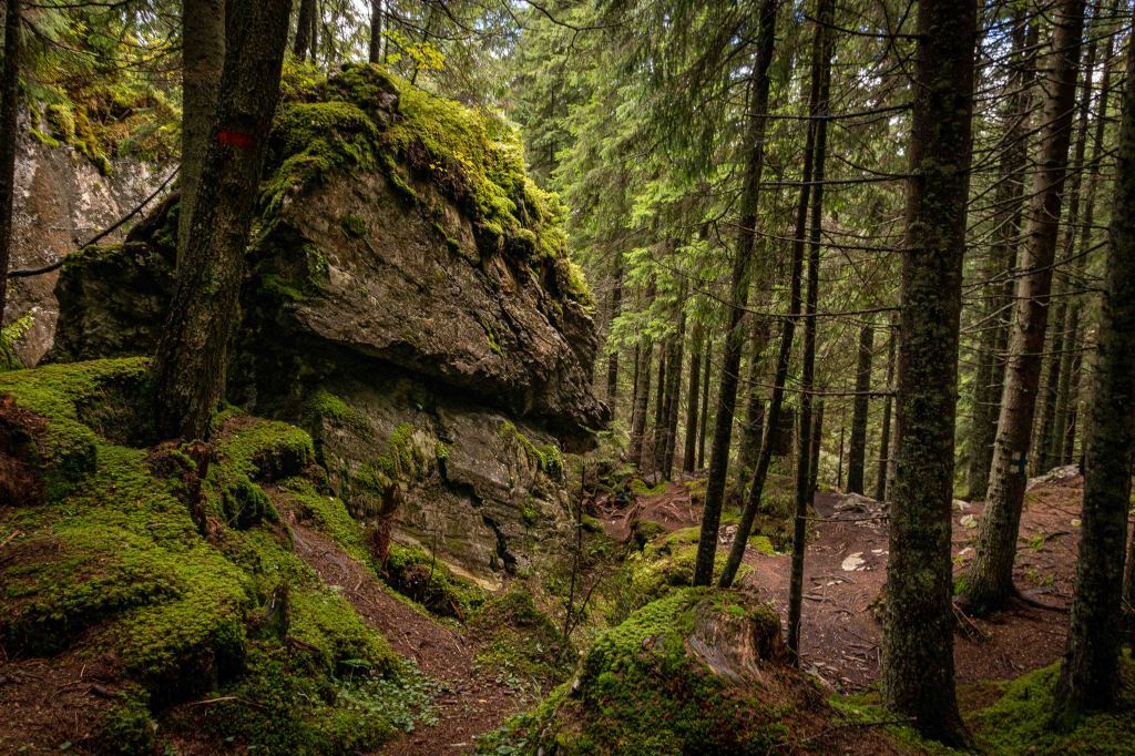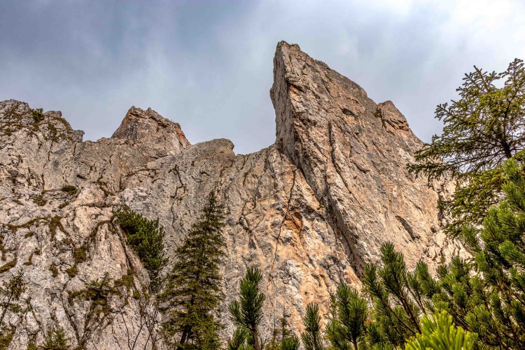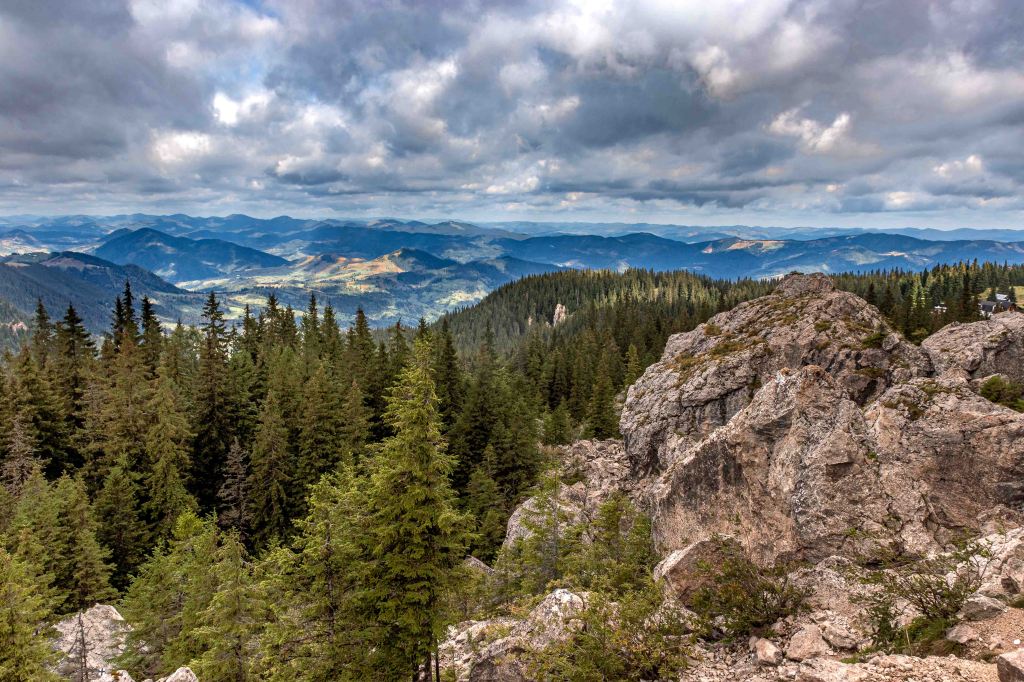 Nach so viel Kultur tut nun ein wenig Landschaft wieder gut. Auf guter Straße und durch dichten Wald kommen wir in das Naturschutzgebiet der Rarău-Giumalău-Berge. Wir schrauben uns hinauf auf 1500 m und finden einen aussichtsreichen Parkplatz. Über den Bäumen spitzen schon die drei Steinfinger hervor: die PIETRELE DOAMNEI, auf deutsch Prinzessinnensteine. Der kleine Rundkurs führt erst durch einen Märchenwald bevor die hoch aufragenden Felsen durch die Bäume lugen. Der Wanderführer fordert „elementare Kletterkenntnisse und Schwindelfreiheit“. Das gilt bestimmt für die Besteigung der dolomitähnlichen Felsen, in denen viele Bohrhaken den Kletterern für ihre Sicherung zur Verfügung stehen. Für den Wanderweg sind nur ab und zu die Hände erforderlich, um die haushohen Felsbrocken zu umgehen. Nach einer kalten Nacht zieht Nebel durch die Täler.