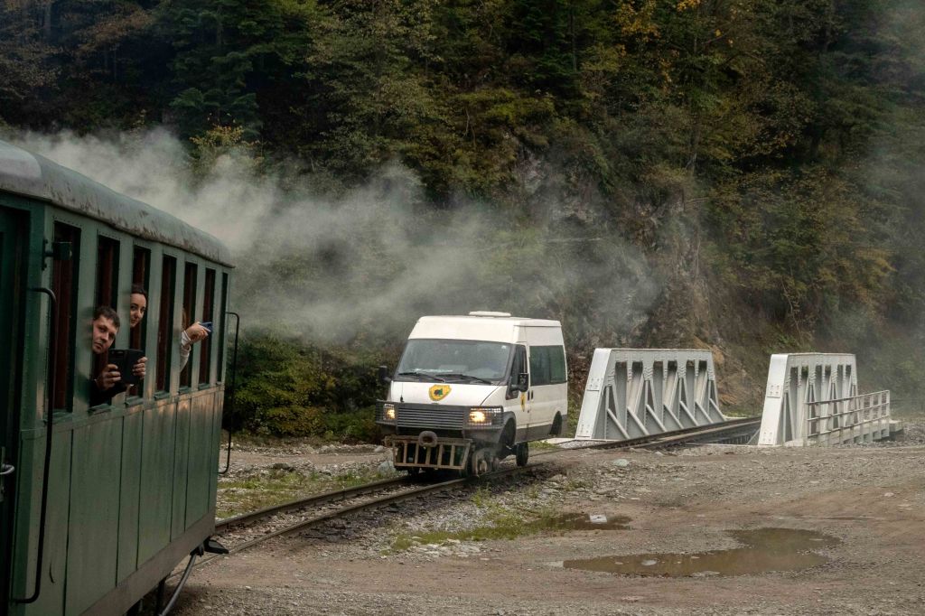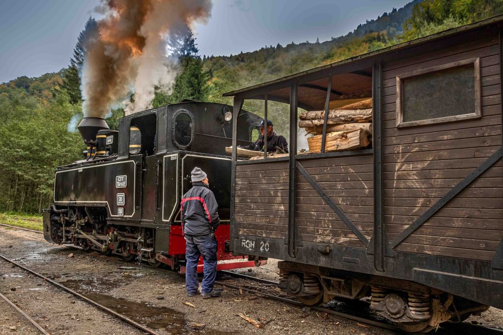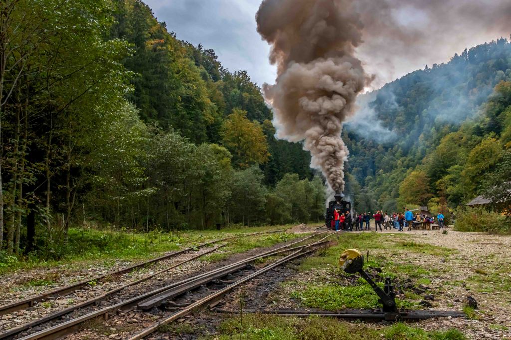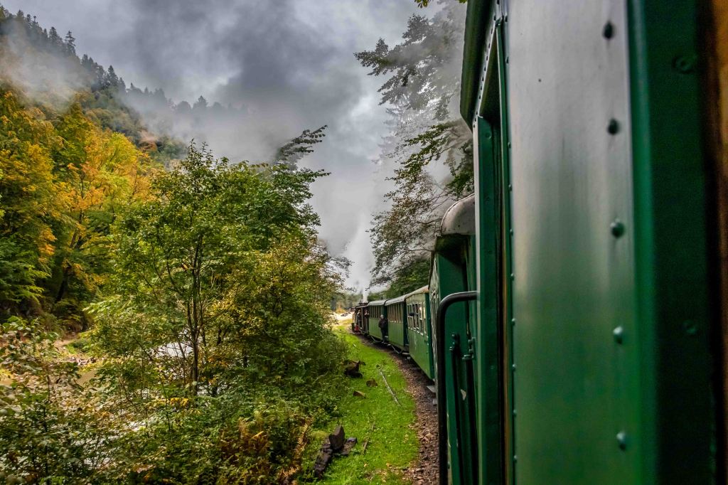 Nein, wir fahren nicht aufs Jungfraujoch, wir sind immer noch in Rumänien. Pünktlich fährt die kleine Lok los, die immerhin sechs voll besetzte Waggons zieht, erst durch ein paar Siedlungen, dann durch einsame Wälder immer dem Fluss Vaser entlang. Die kleine Schmalspurlok „Resita“, Baujahr 1955, müht sich dampfend und fauchend, mit immerhin 6-7 km/h, durch die engen Kurven. Die Räder rattern wie in alten Zeiten über die Lücken der schmalen Schienen. Nach 21 km und zwei Stunden Fahrt ist auf halber Strecke der Bahnhof Paltin für uns Touristen Endstation. Nach einer kurzen Vesperpause geht es zurück. Nun bremst die Lok die Wagen und es geht noch langsamer voran. Zum Äpfelpflücken könnte man bequem nebenher laufen.