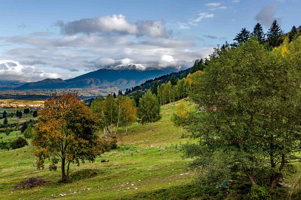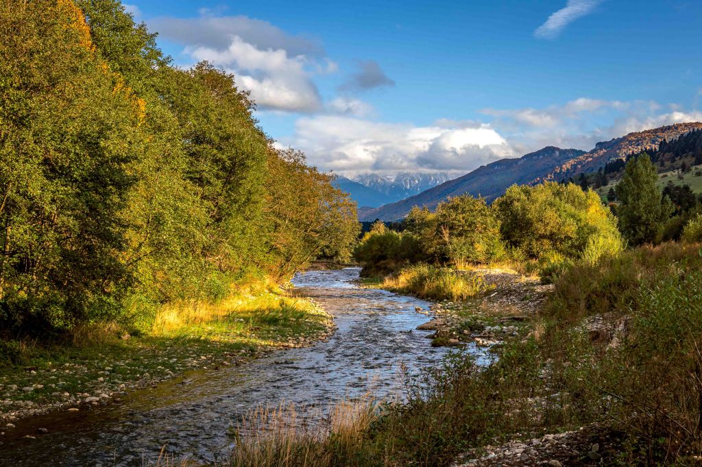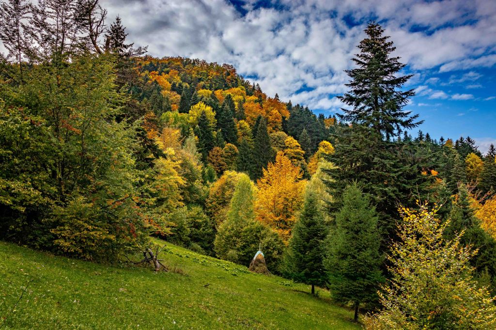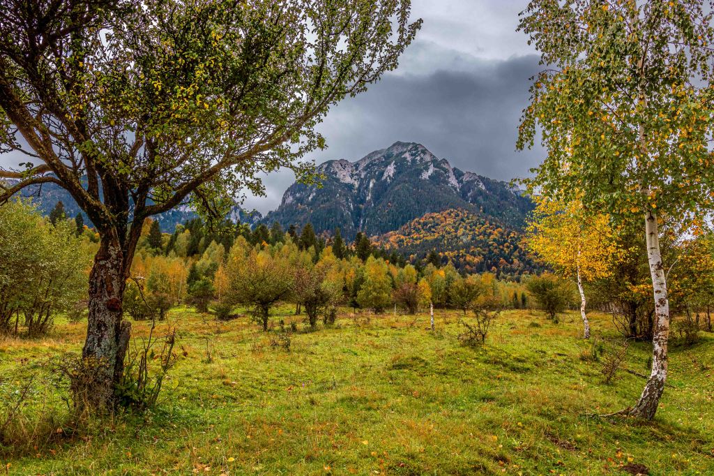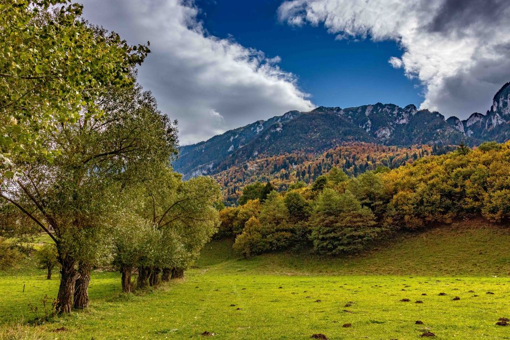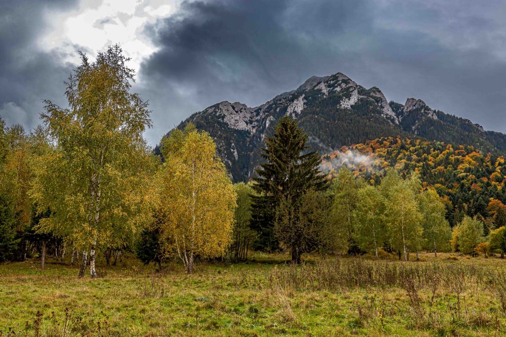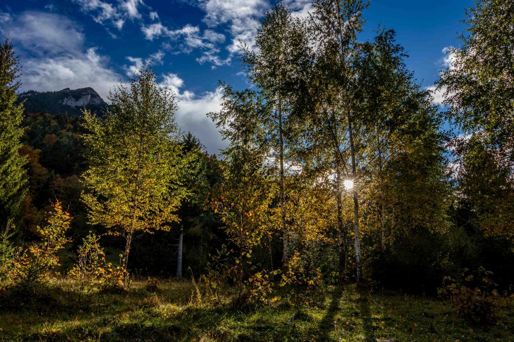 Das Gebirge ist ein majestätischer Kalksteinblock, der sich über die nun herbstlich bunt gefärbten Wälder erhebt. Vielleicht ist uns das Wetter ja holt und Peter kann hier die ein oder andere Wanderung machen. Wir parken am Rande des Nationalparks und tatsächlich: Der Regen hört glücklicherweise auf und die Sonne lässt sich sogar für ein paar Augenblicke sehen. So gelingt ein zumindest nachmittäglicher Spaziergang über die nassen Wiesen und durch den leuchtenden Wald. Auf den Bergen liegt leuchtend weiß frischer Schnee.