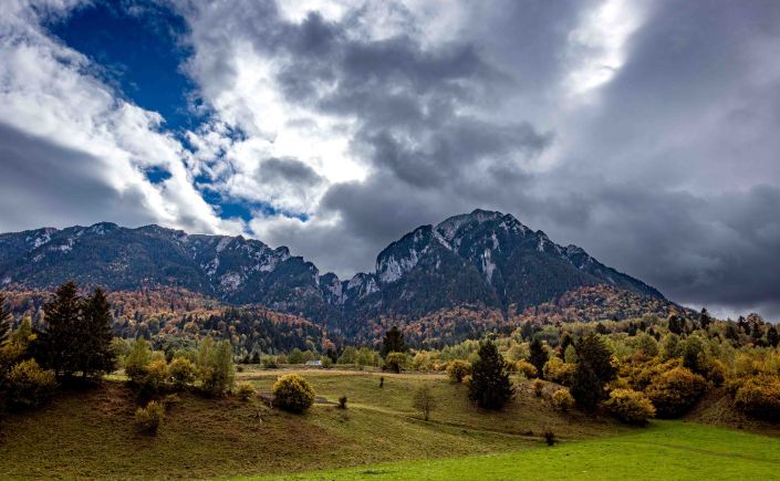 Das Gebirge ist ein majestätischer Kalksteinblock, der sich über die nun herbstlich bunt gefärbten Wälder erhebt. Vielleicht ist uns das Wetter ja holt und Peter kann hier die ein oder andere Wanderung machen. Wir parken am Rande des Nationalparks und tatsächlich: Der Regen hört glücklicherweise auf und die Sonne lässt sich sogar für ein paar Augenblicke sehen. So gelingt ein zumindest nachmittäglicher Spaziergang über die nassen Wiesen und durch den leuchtenden Wald. Auf den Bergen liegt leuchtend weiß frischer Schnee.