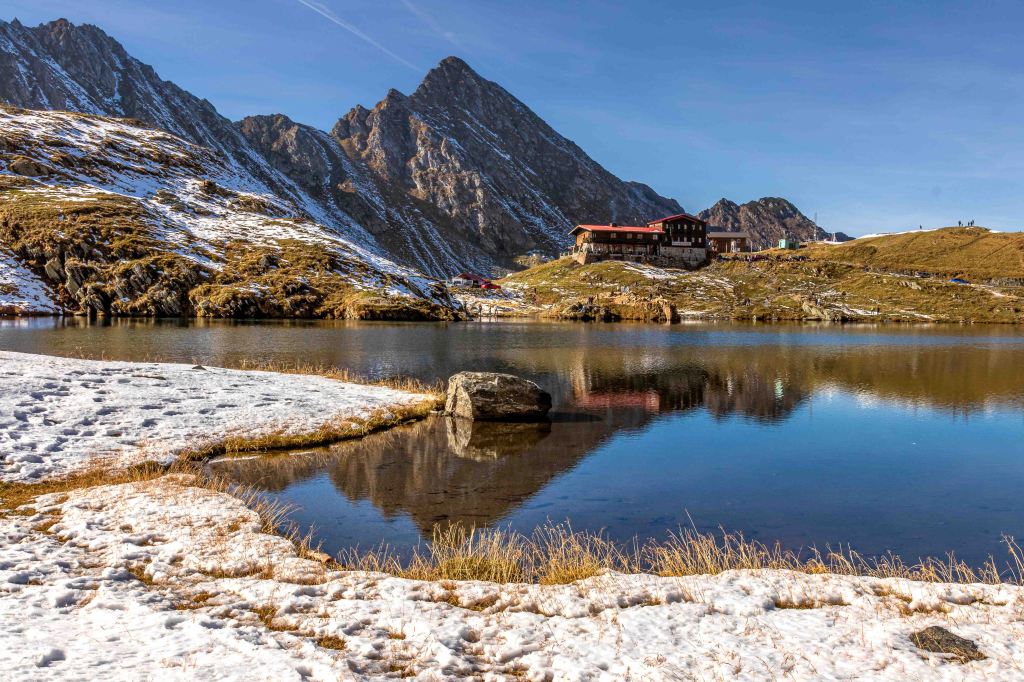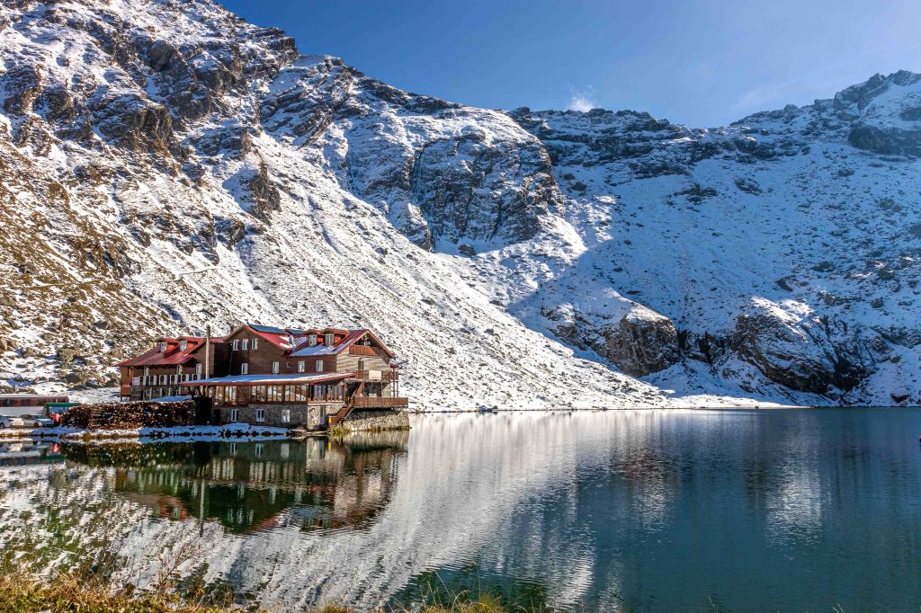 Dann endlich erreichen wir die Baumgrenze. Nach der Durchfahrt durch Rumäniens längsten Tunnel macht sich auf dem 2042 m hohen Bălea-Pass ein grandioses Panorama auf. Doch schnell verlassen wir den Trubel, heute am Samstag sind viele Ausflügler unterwegs, die wie wir das tolle Wetter nutzen, und fahren etwas tiefer auf eine ausreichend große Ausweiche. Peter macht sich zu Fuß nochmals auf den Weg hinauf zum Pass und den malerischen Lacul Bălea, in dem sie die umliegenden schneebedeckten Berge spiegeln.