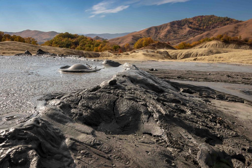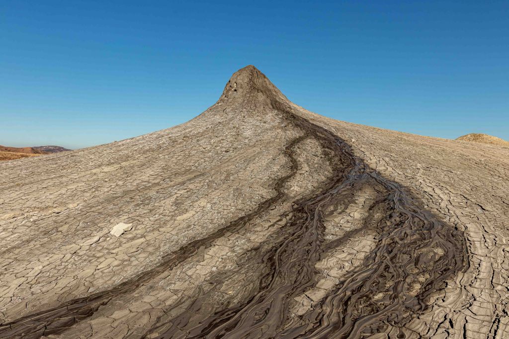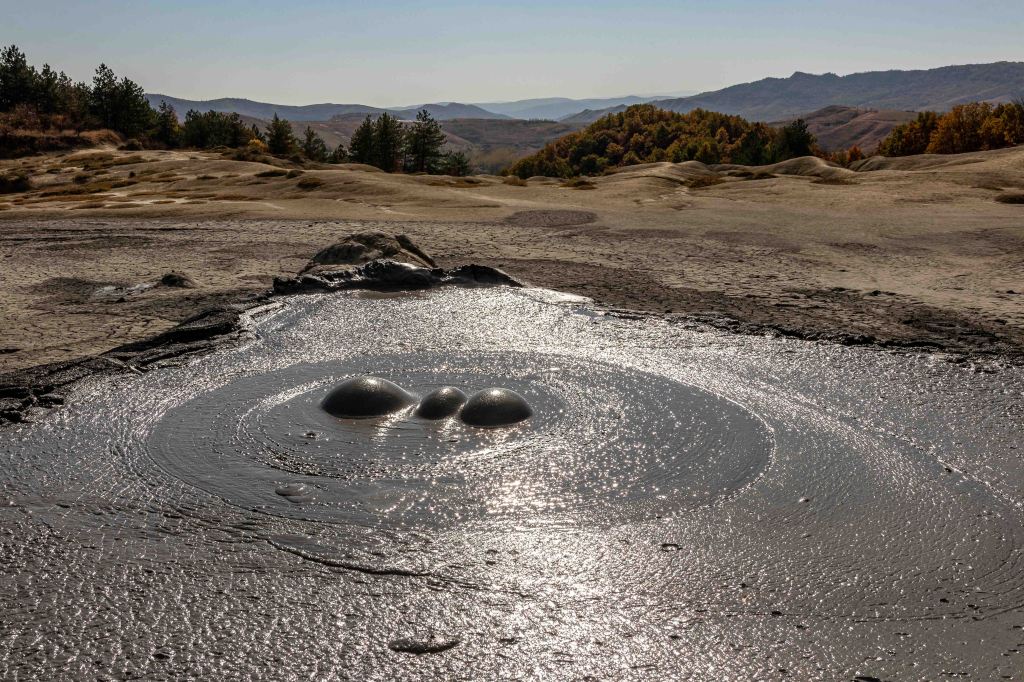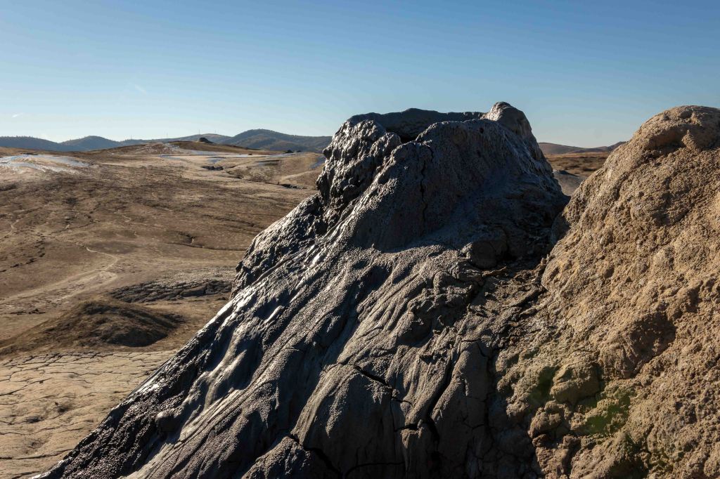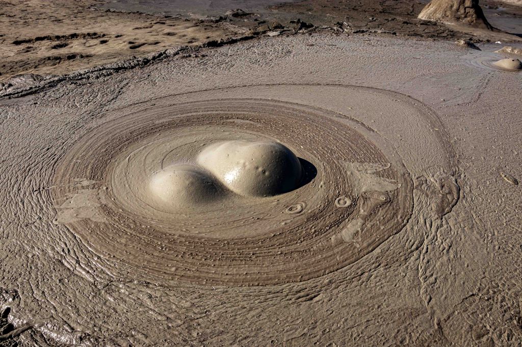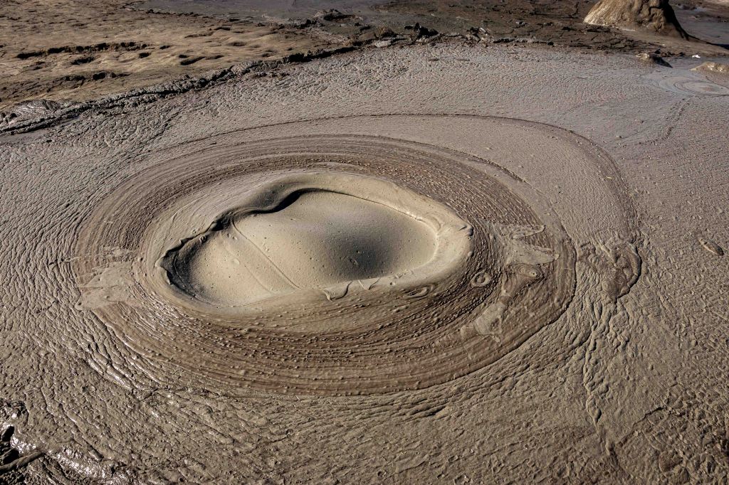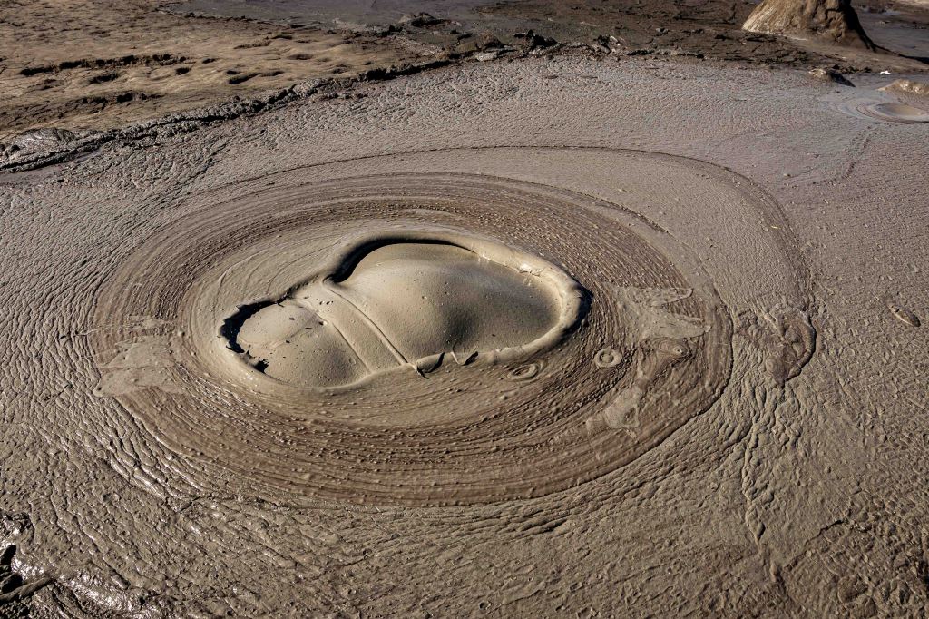 Weil es hier so schön war, kehren wir für zwei Nächte zurück. Peter besucht noch einmal die KLEINEN und GROßEN SCHLAMMVULKANE, dazwischen wandert er über die gelben Wiesenfläche, entlang dem Kamm der umliegenden Hügel. Es ist eine bezaubernde Landschaft. Bis auf die Vulkane eher lieblich und gar nicht spektakulär. Vielleicht strahlt sie deshalb eine wunderbare Ruhe aus.
