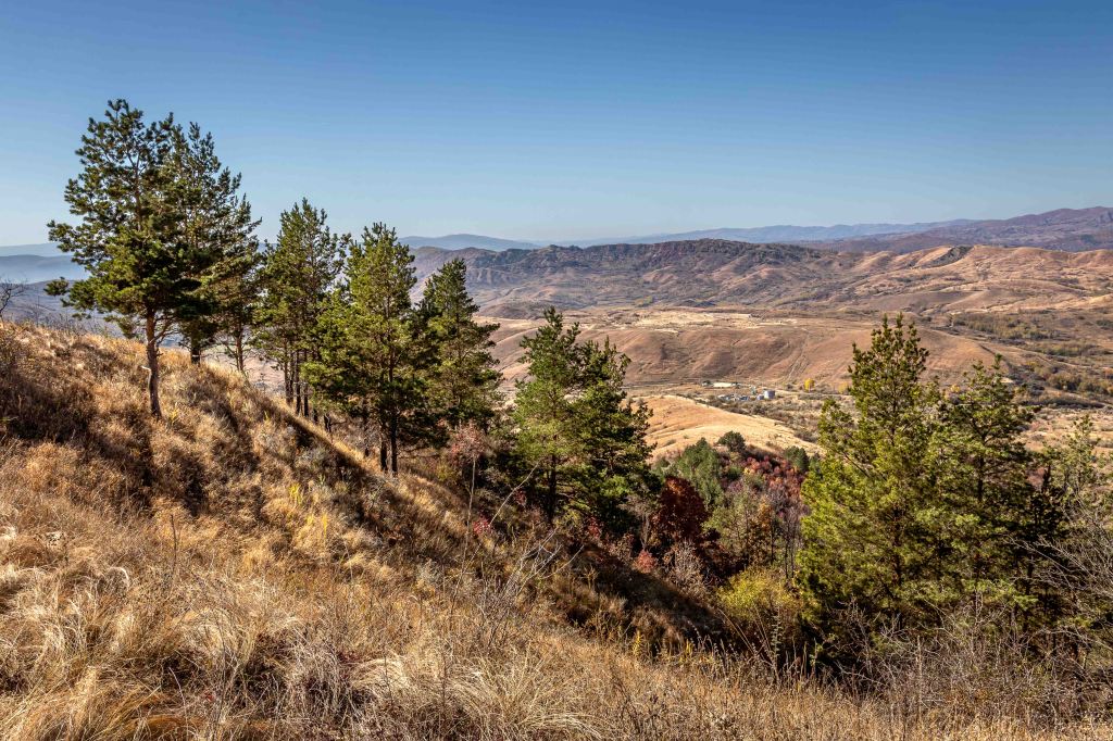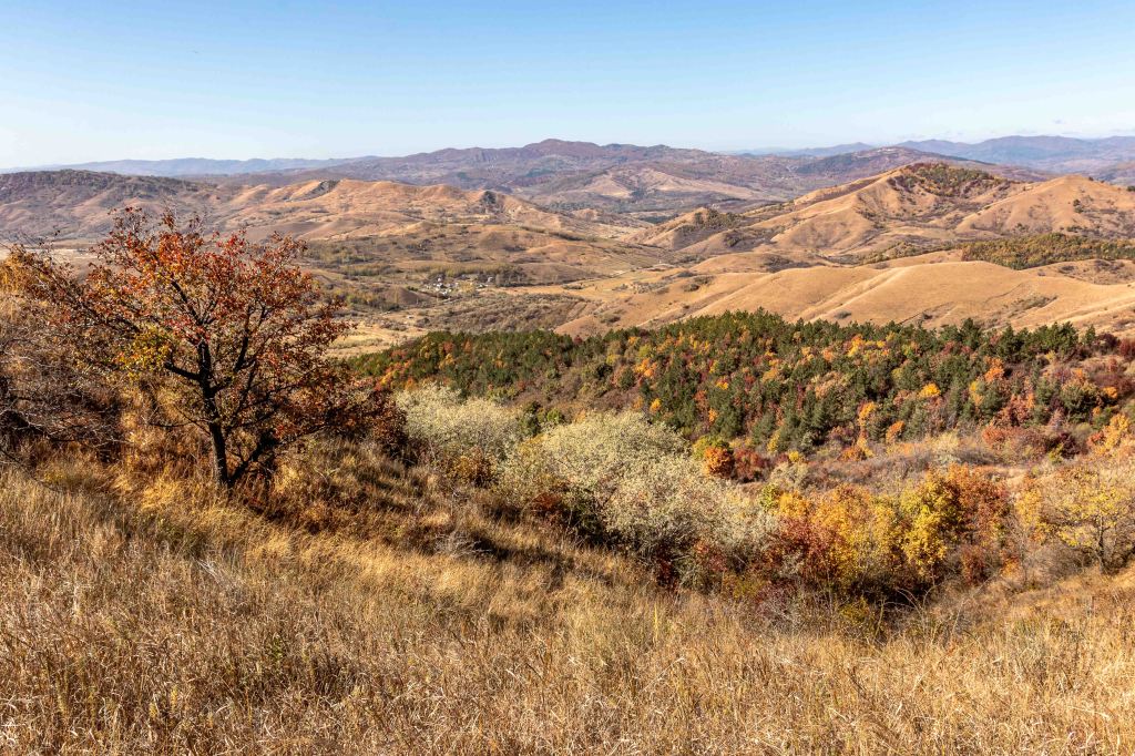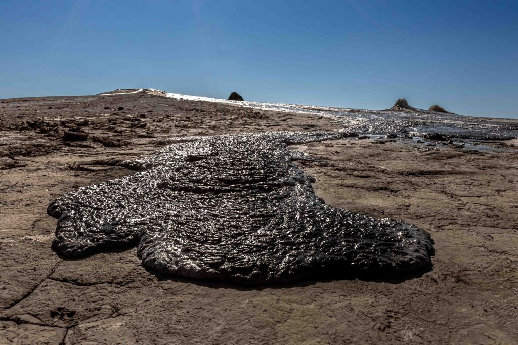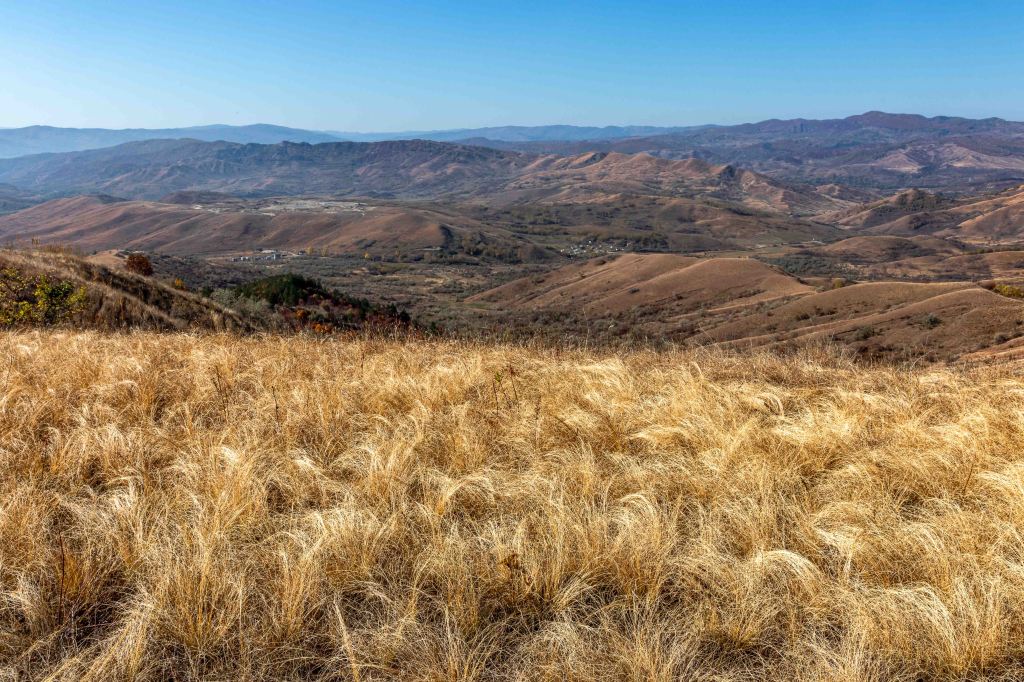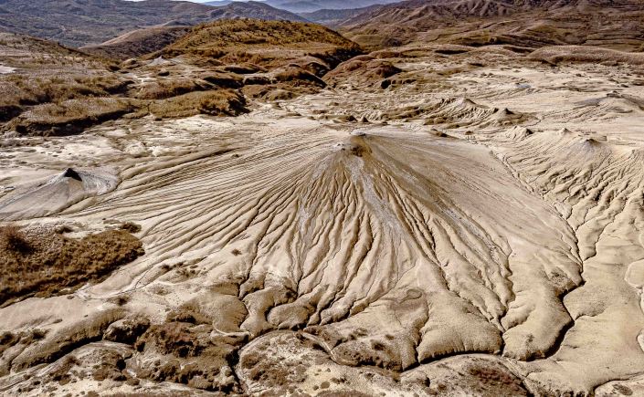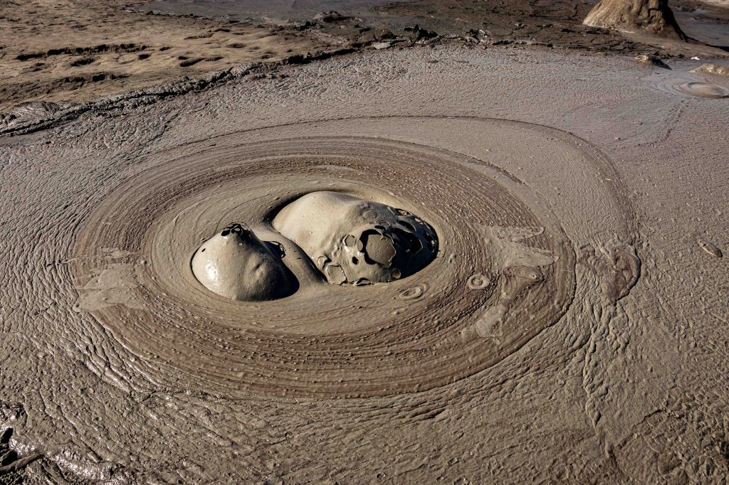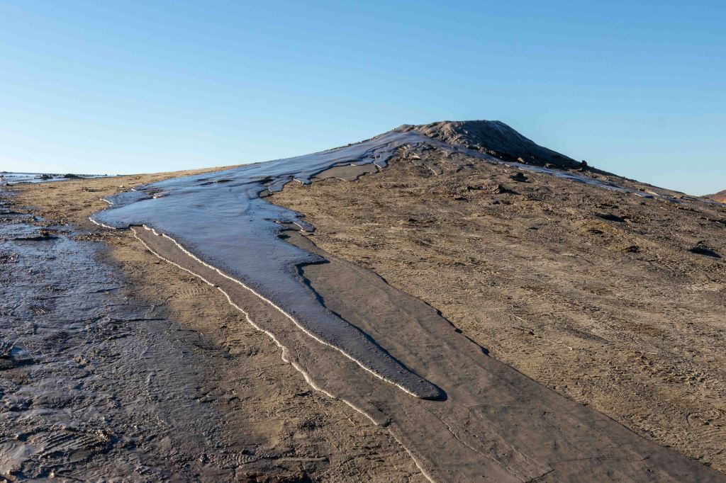 Weil es hier so schön war, kehren wir für zwei Nächte zurück. Peter besucht noch einmal die KLEINEN und GROßEN SCHLAMMVULKANE, dazwischen wandert er über die gelben Wiesenfläche, entlang dem Kamm der umliegenden Hügel. Es ist eine bezaubernde Landschaft. Bis auf die Vulkane eher lieblich und gar nicht spektakulär. Vielleicht strahlt sie deshalb eine wunderbare Ruhe aus.