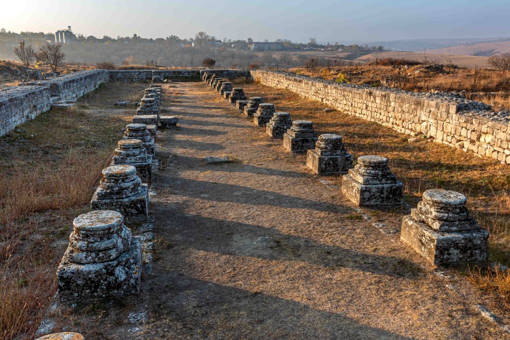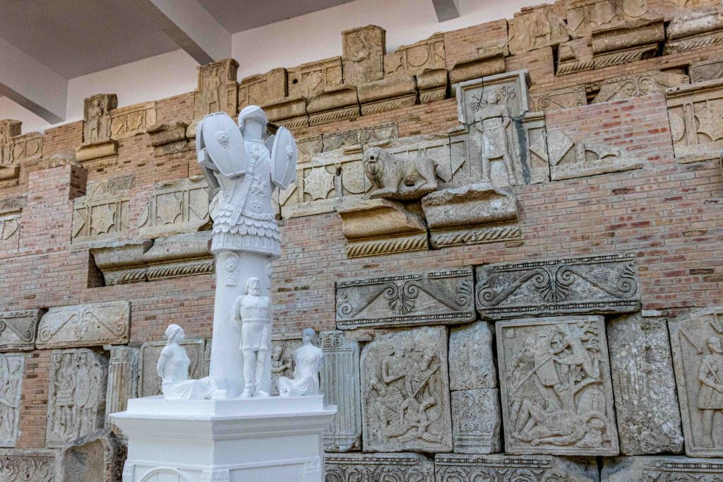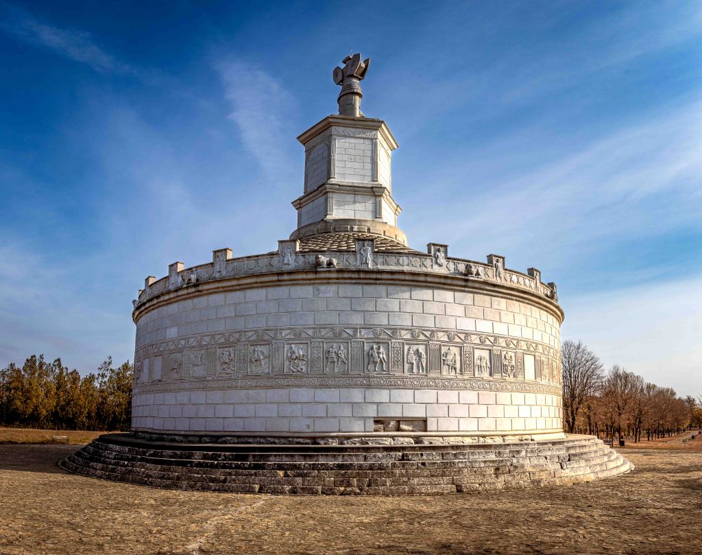 Der Weg führt uns nach Westen zu einem imposanten Denkmal, dem Tropaeum Traiani. Weithin leuchtet der weiße Bau, der in Erinnerung an den Sieg Kaiser Trajan über den Drakerkönig Decebel errichtet wurde. Heute ist es eine Nachbildung, die Originale der vielen Darstellungen des Sieges sind im nahen Museum zu bestaunen. Gleichzieht mit dem Denkmal entstand das Militärlager Adamklissi, von dem noch einige Reste zu erkunden sind. Nach mehrmaliger Zerstörung und dem Wiederaufbau siedelten sich nach dem Sieg der Osmanen Türken an, die das Denkmal für eine Kirche hielten und im dem Namen „Kirche des Mannes“ gaben, eben Adam Kilise.