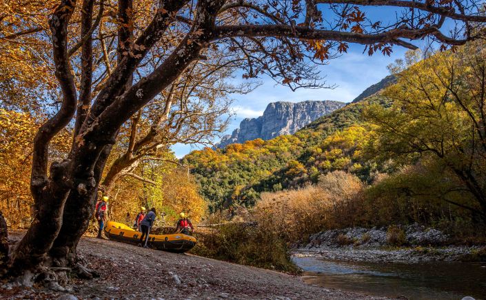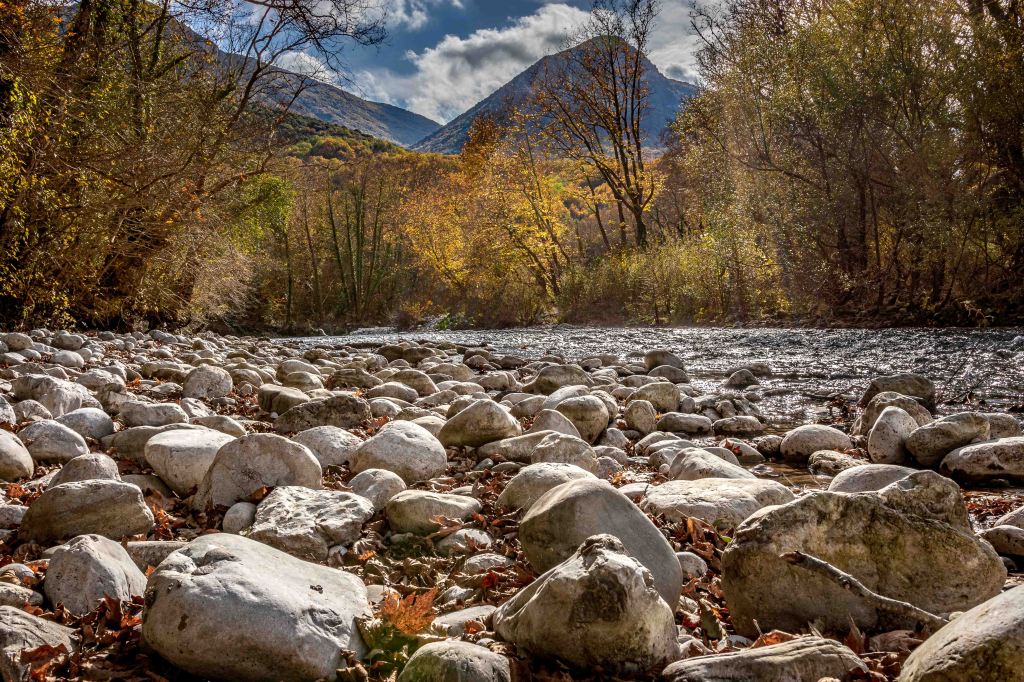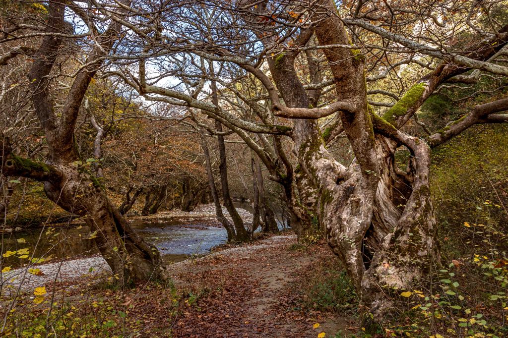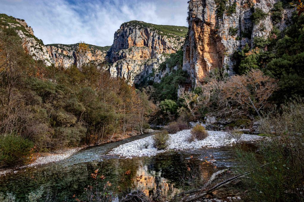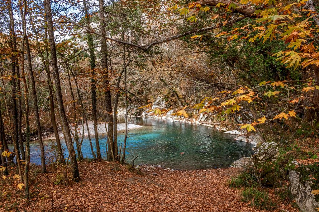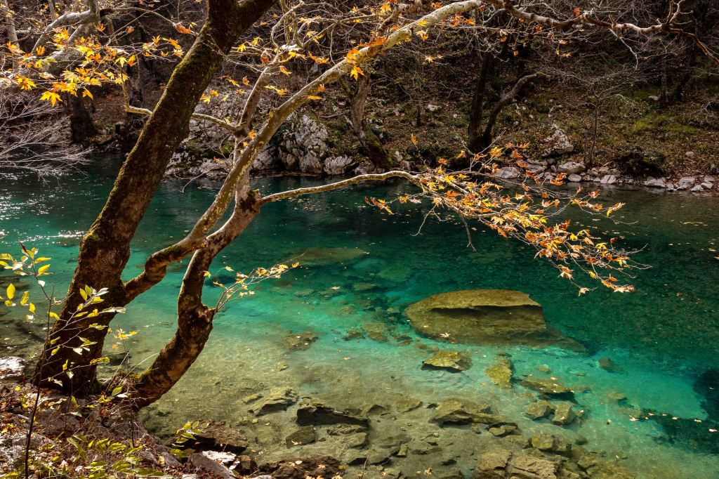 Jetzt kommen wir in bekannte Gebiete. Wie schon vor vier Jahren, parken wir direkt man Voidimatis. Der glasklare Fluss bahnt sich ab hier den Weg durch das Pindosgebirge. Immer dem Ufer entlang führt ein malerisch Weg durch die imposante Schlucht, die schon die Menschen in der Steinzeit zu schätzen wussten. Das Wasser leuchtet in den schönsten Grün- und Blautönen, ein schöner Kontrast zu dem herbstlichen Laub der vielen knorrigen und uralten Bäume. Am Ende der Schlucht überspannt eine alte Brücke den Voidomatis, welche die Frau eines türkischen Paschas 1853 mit 37 000 Piastern finanzierte. Obwohl Griechenland zu dieser Zeit bereits selbständig war, herrschten im Épirus noch die Türken.