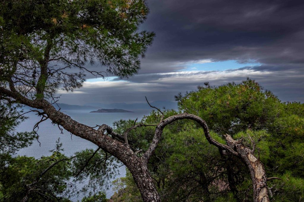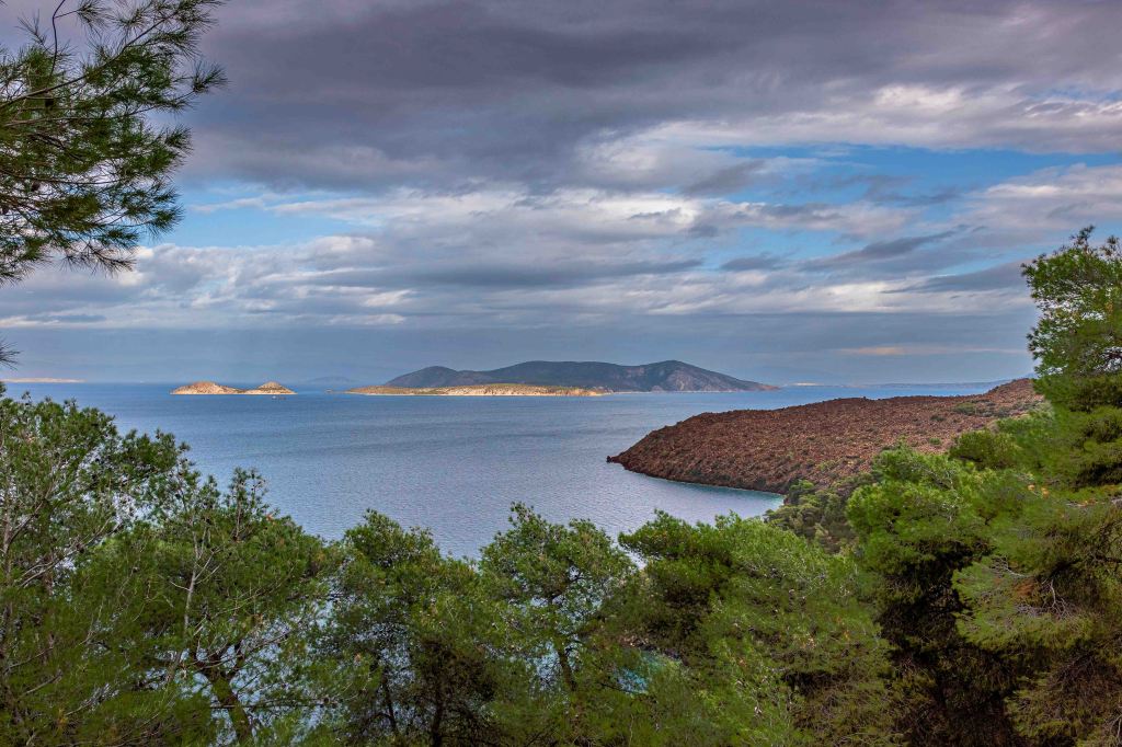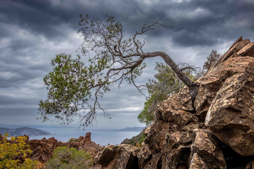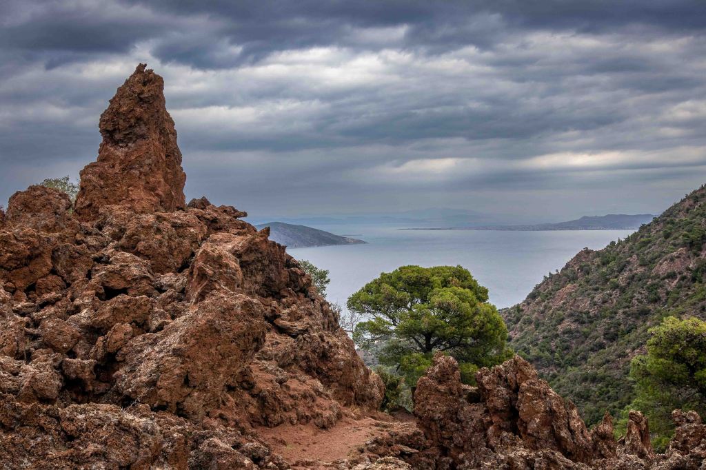 Eine landschaftliche Besonderheit ist die Halbinsel MÉTHANA, auf der über 30 Vulkandome sind. Nachdem wir unseren Übernachtungsplatz an der PARALIA METAMORPHOSIS erkundet haben, fahren wir erst auf engen Straßen zur kleinen Landbrücke. Kurz vor dem Ort KAIMENI CHORA, der sich an einen Lavastrom anlehnt, können wir parken. Der erste Spaziergang führt Peter zum KAP KRASOPANAGIAS. Der Blick geht über den SARONISCHEN GOLF zu den zahlreichen Inseln. Nach dem Mittagessen „muss“ ich noch zum Gipfel des KAMENO VOUNO. Hier fand der letzte Ausbruch vermutlich zwischen 277 und 239 v.u.Z statt. Da ein Lavadom gesprengt wurde, ist der Gipfel ein Irrgarten aus riesigen Felsen, aus denen die Bäume wachsen.