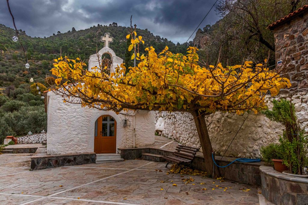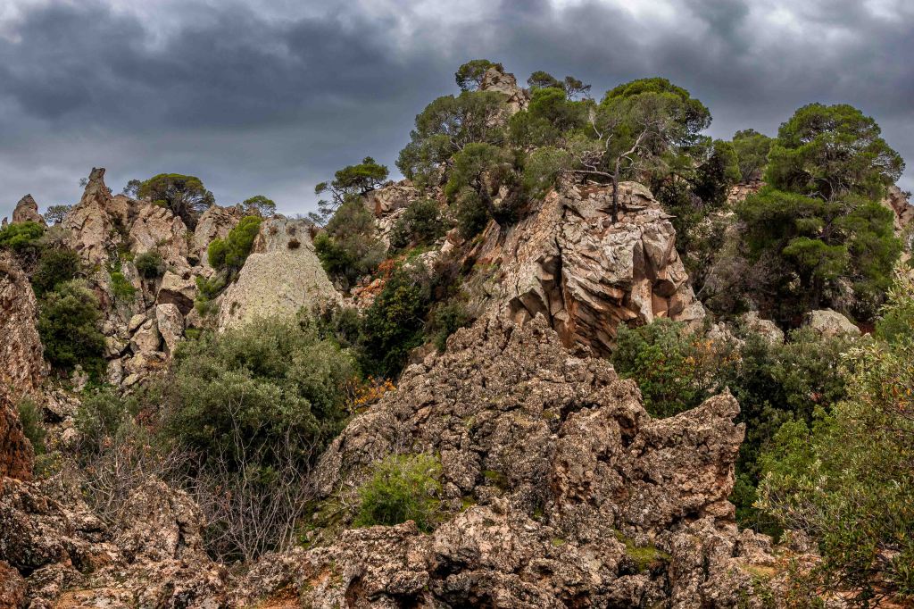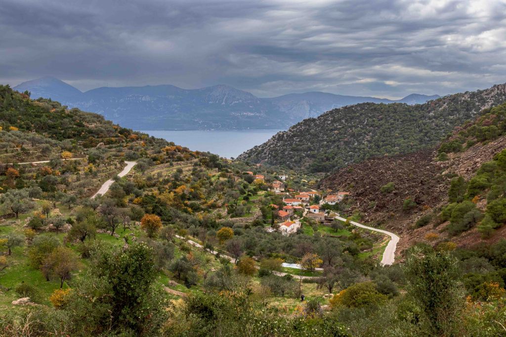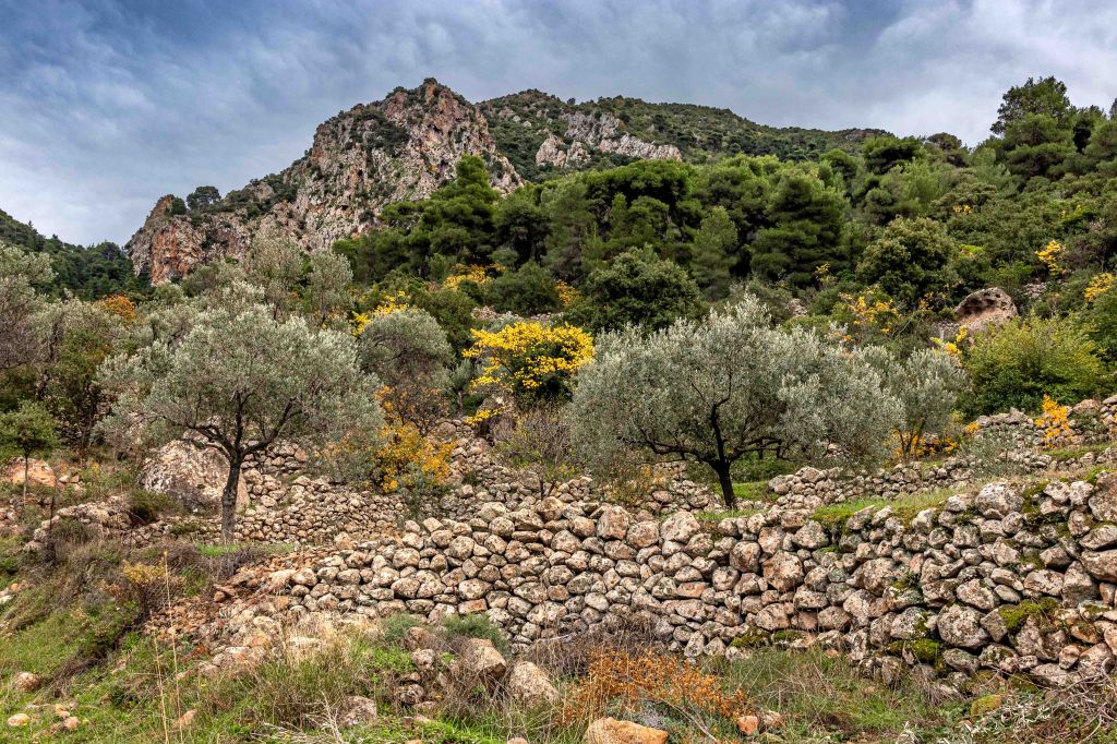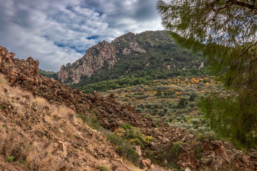 Eine landschaftliche Besonderheit ist die Halbinsel MÉTHANA, auf der über 30 Vulkandome sind. Nachdem wir unseren Übernachtungsplatz an der PARALIA METAMORPHOSIS erkundet haben, fahren wir erst auf engen Straßen zur kleinen Landbrücke. Kurz vor dem Ort KAIMENI CHORA, der sich an einen Lavastrom anlehnt, können wir parken. Der erste Spaziergang führt Peter zum KAP KRASOPANAGIAS. Der Blick geht über den SARONISCHEN GOLF zu den zahlreichen Inseln. Nach dem Mittagessen „muss“ ich noch zum Gipfel des KAMENO VOUNO. Hier fand der letzte Ausbruch vermutlich zwischen 277 und 239 v.u.Z statt. Da ein Lavadom gesprengt wurde, ist der Gipfel ein Irrgarten aus riesigen Felsen, aus denen die Bäume wachsen.